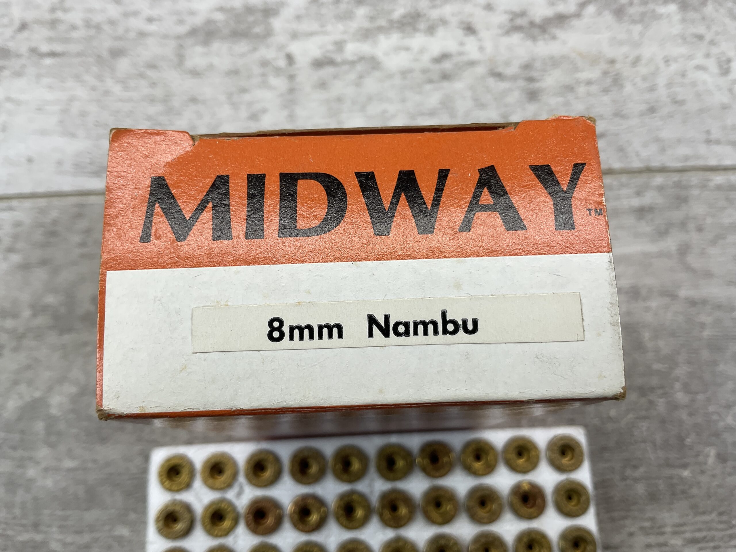 MIDWAY ARMS 8MM NAMBU AMMO SHELLS, FULL BOX, VINTAGE, BOX IS IN VG-EXC CONDITION AND FUNCTIONS WELL.