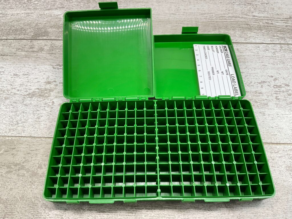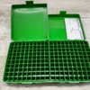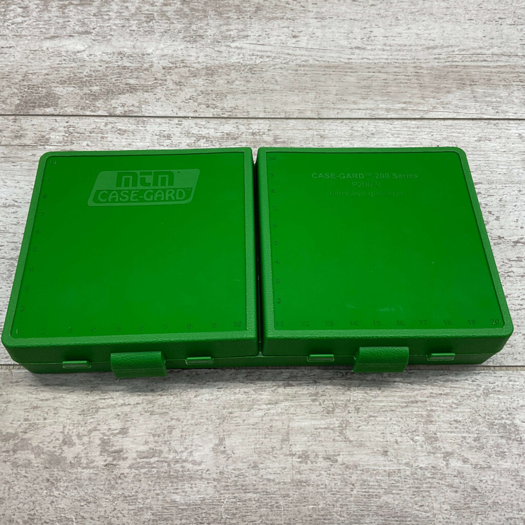 Sturdy 200 round base with two flip-top lids covering 100 rds. each, a strong snap latch secures each cover, multi-stack design