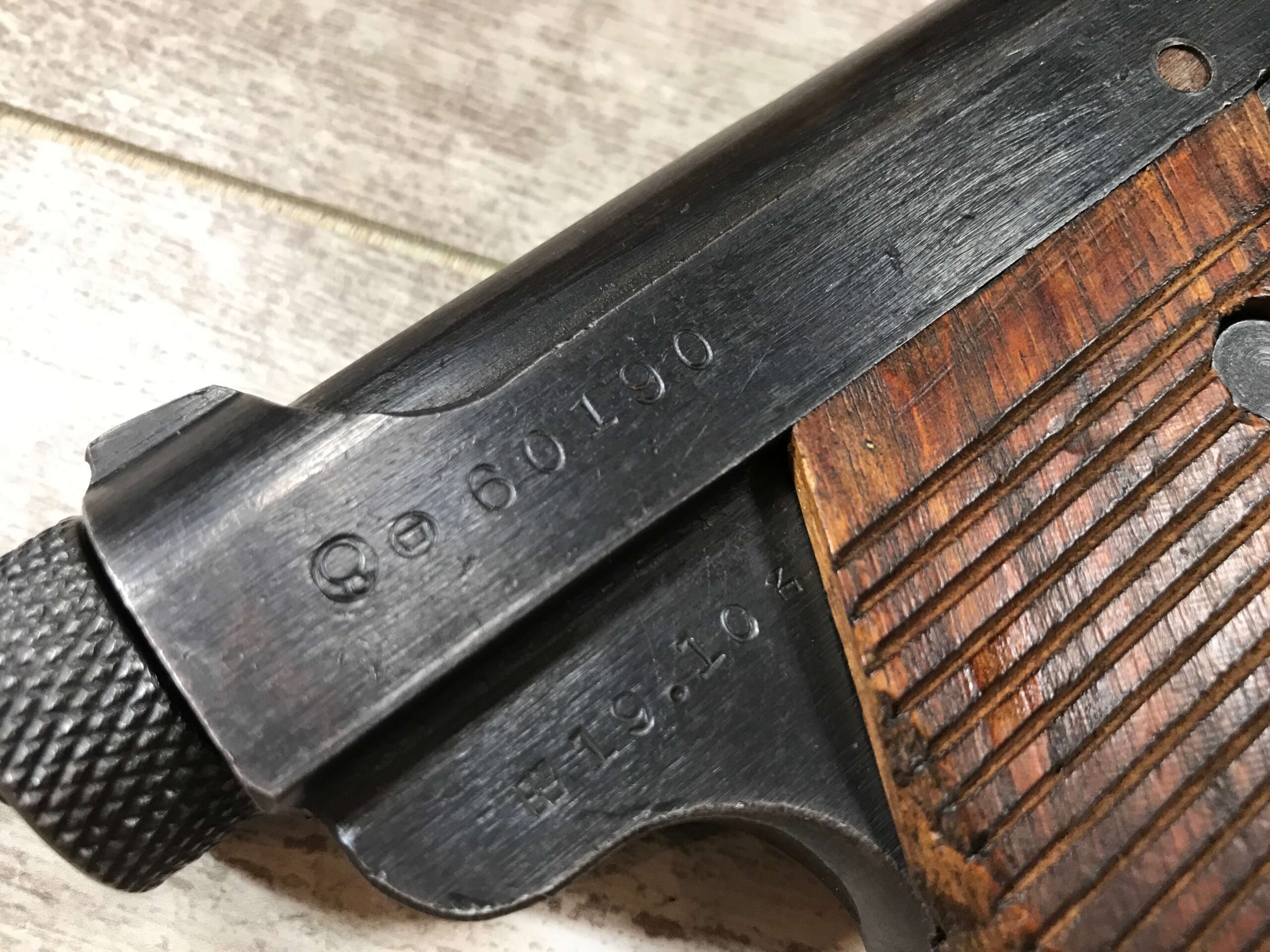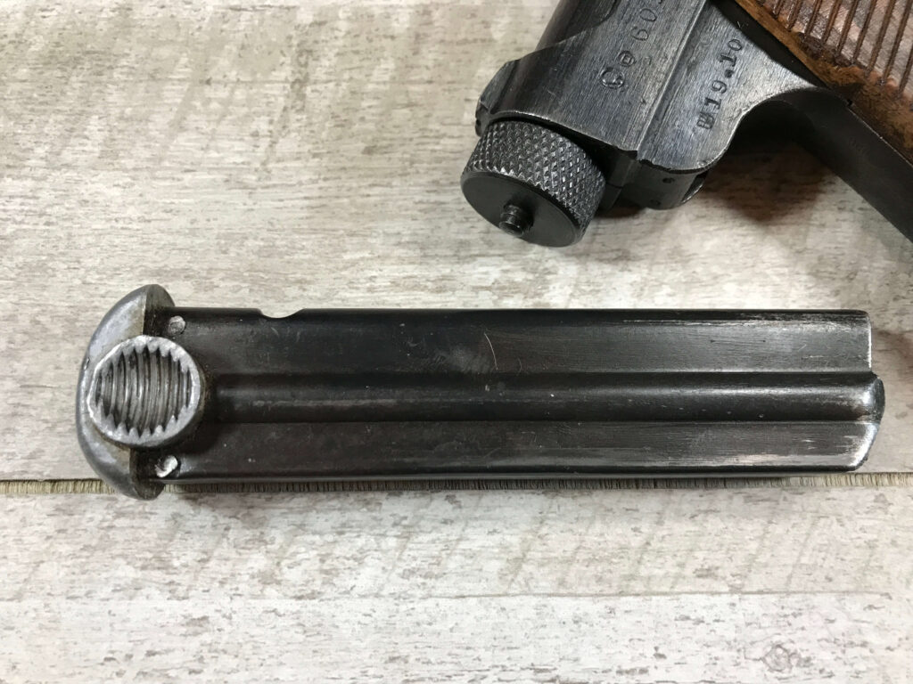 SKU#051 NAMBU TYPE 14 19.10 DATE (OCT, 1944), 8MM PISTOL, #60190, NAGOYA ARSENAL, TORIIMATSU FACTORY, 95% BLUE, LARGE TRIGGER GUARD, ALL MATCHING NUMBERS INCLUDING THE MAGAZINE(190) & GRIPS (0190), SHOWA SYMBOL PRECEDING THE DATE CODE, 24 SERRATION MAHOGANY GRIPS IN EXC CONDITION, LIGHT SPARATIC FROSTED BORE 7/10, MISSING LANYARD RING, OVERALL G-VG, EXCELLENT LATE WAR PISTOL