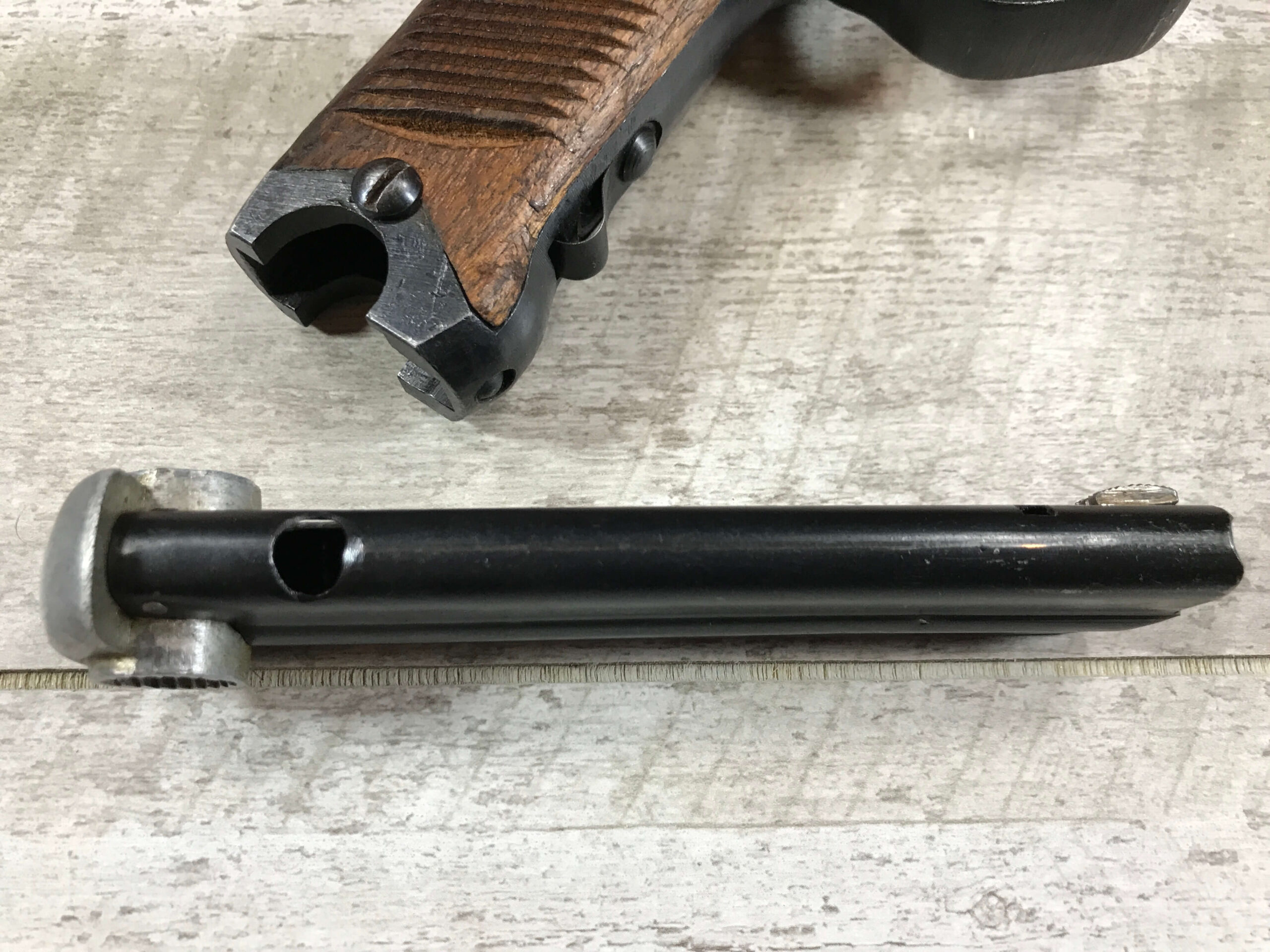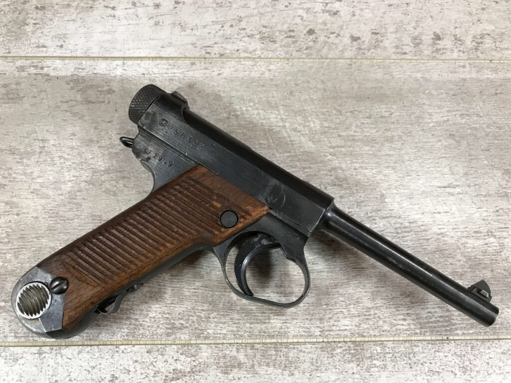 SKU#052 NAMBU TYPE 14 19.9 DATE (SEPT, 1944), 8MM PISTOL, #58356, NAGOYA ARSENAL, TORIIMATSU FACTORY, 96% BLUE, LARGE TRIGGER GUARD, ALL MATCHING NUMBERS INCLUDING THE MAGAZINE(356) & GRIPS (8356), SHOWA SYMBOL PRECEDING THE DATE CODE, 24 SERRATION MAHOGANY GRIPS IN EXC CONDITION, BRIGHT BORE 10/10, MINOR BLEMISHES ON EXTERIOR, OVERALL VG, 94%, EXCELLENT LATE WAR PISTOL
