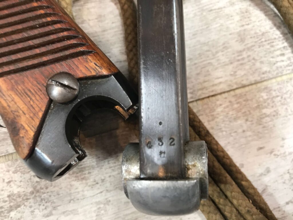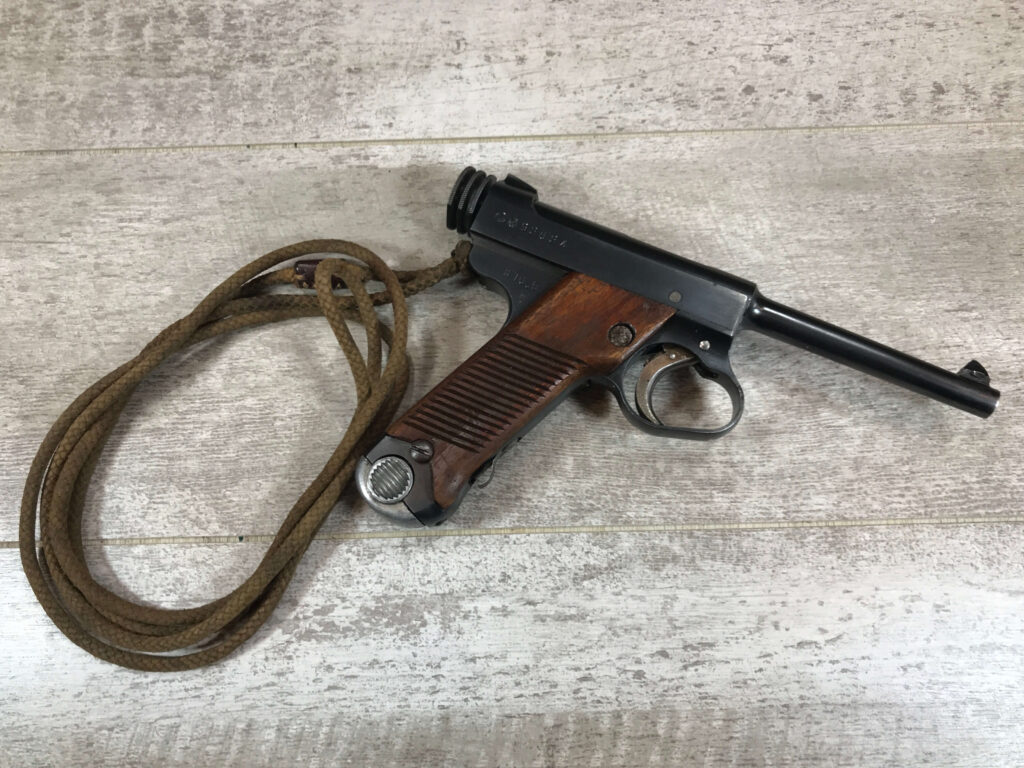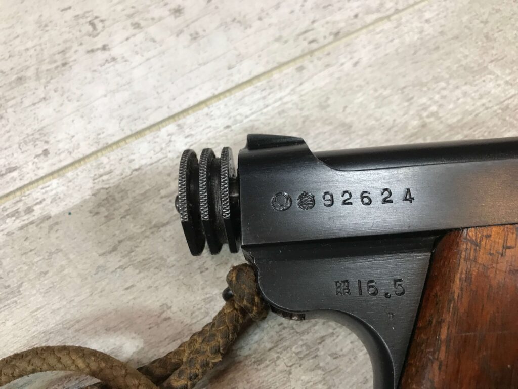 NAMBU TYPE 14 RIG 16.5 DATE-(MAY, 1941), 8MM, #92624, KOKUBUNJI ARSENAL, 95% BLUE, 95% STRAW, LARGE TRIGGER GUARD, ALL MATCHING NUMBERS EXCEPT MAGAZINE, SHOWA SYMBOL PRECEDING THE DATE CODE, EXC LEATHER CLAM HOLSTER (NO CLEANING ROD), ORIGINAL LANYARD STILL ATTACHED (ORIGINAL & SCARCE), 17 SERRATION MAHOGANY GRIPS CORRECT AND UN-NUMBERED, EXC BRIGHT BORE, 97%