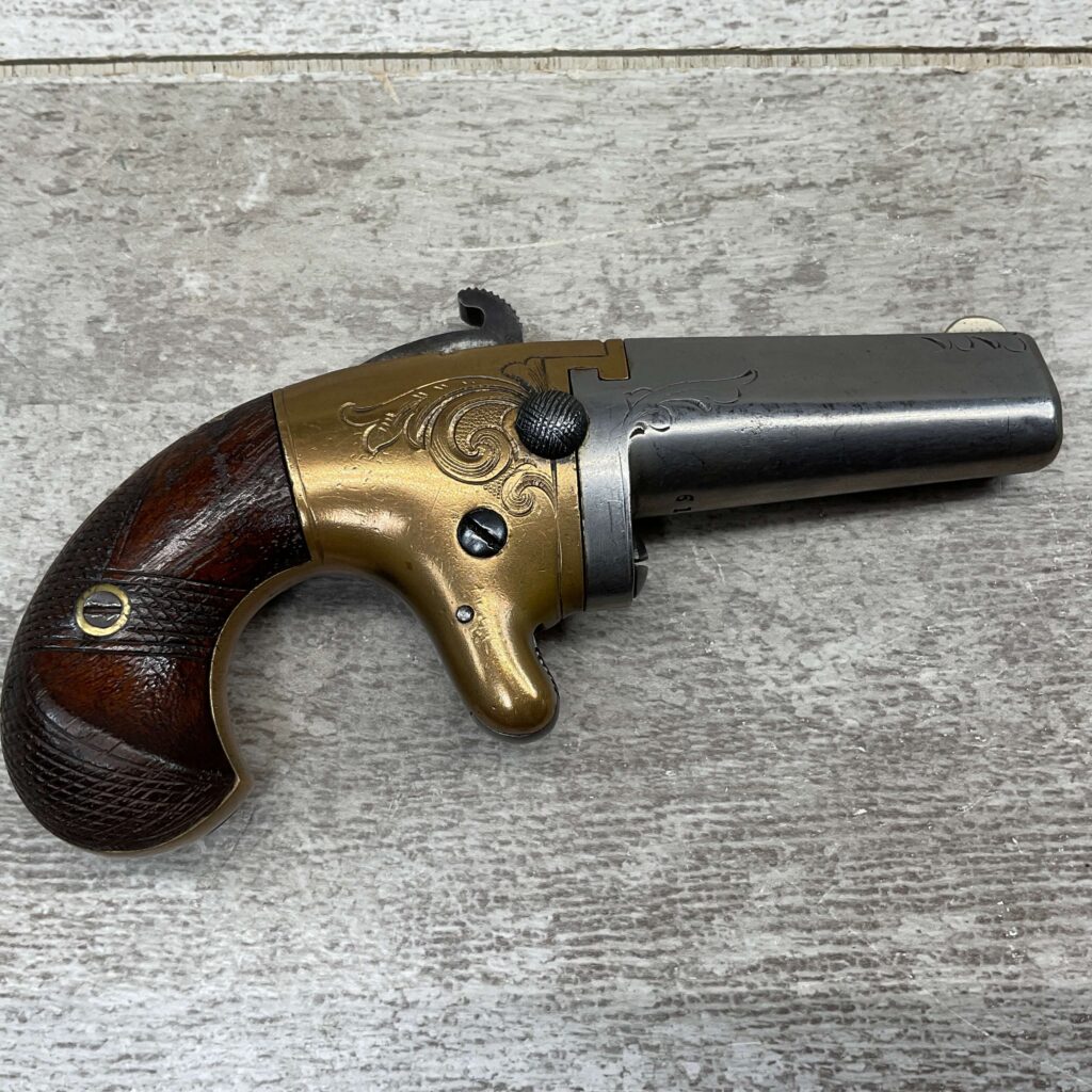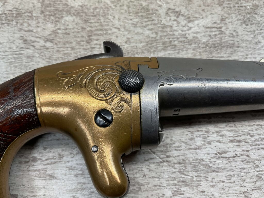NATIONAL ARMS CO. NO 2 .41RF DERRINGER SINGLE SHOT PISTOL, ANTIQUE #6190 .41RF, 2 1/2″ ROTATE SIDE LOAD BARREL, VERY NICE BRASS FRAME W/ LIGHT ENGRAVING, FULLY FUNCTIONING, STEEL BARREL MARKED “NATIONAL ARMS CO. BROOKLYN. N.Y., BOTTOM OF BARREL IS MARKED 6190, VG-GOOD BORE W/ COUPLE AREAS OF FROSTING & EXC RIFLING, EXC CHECKERED WOODEN GRIPS MARKED BG 90, FRAME ALSO MARKED BG 90 UNDER GRIP, SPUR TRIGGER, 1870 MFR, VERY NICE & TIGHT MECHANICALLY, NOT A REPRODUCTION, OVERALL CONDITION AS SEEN IN PHOTOS.!!