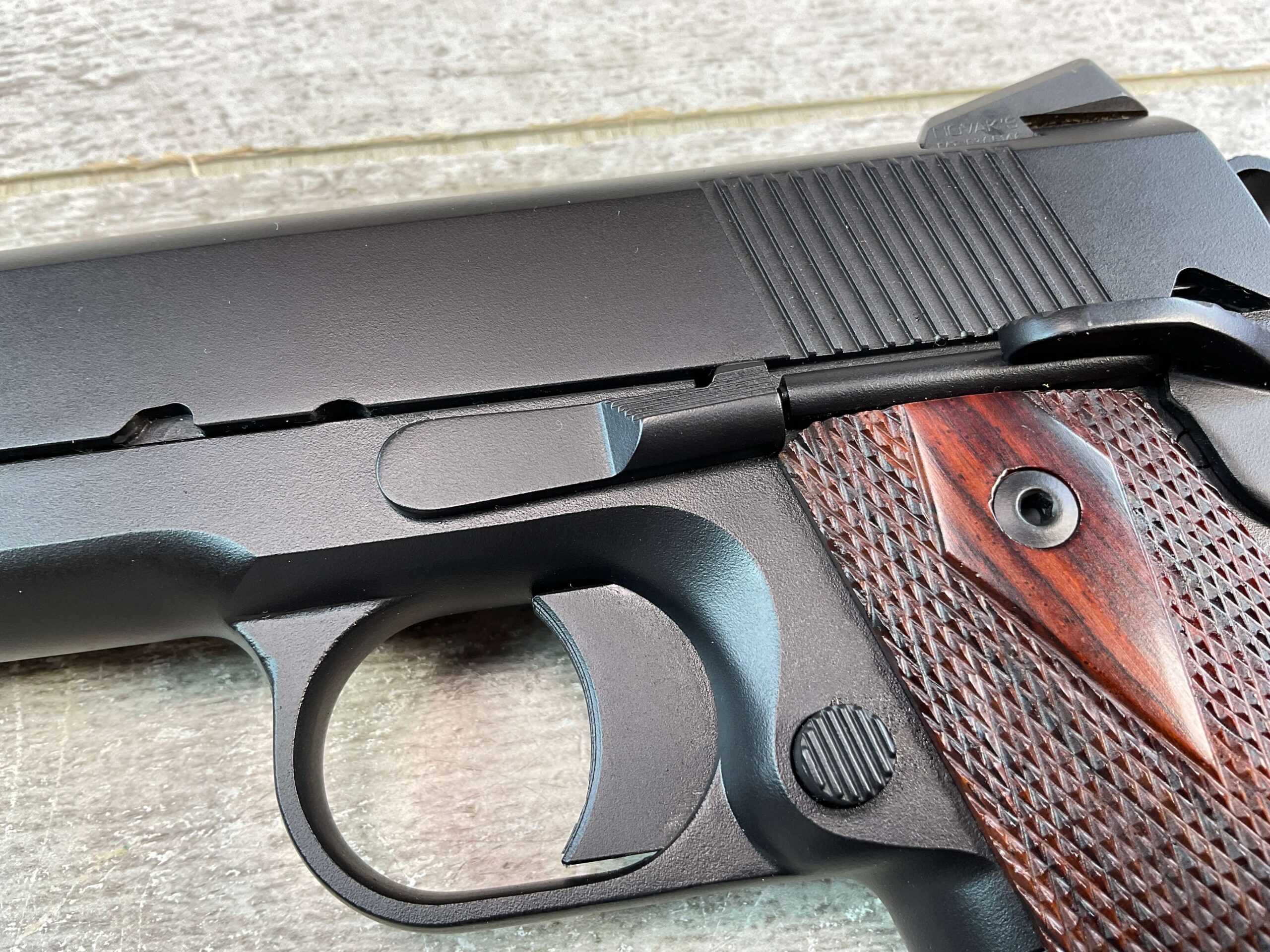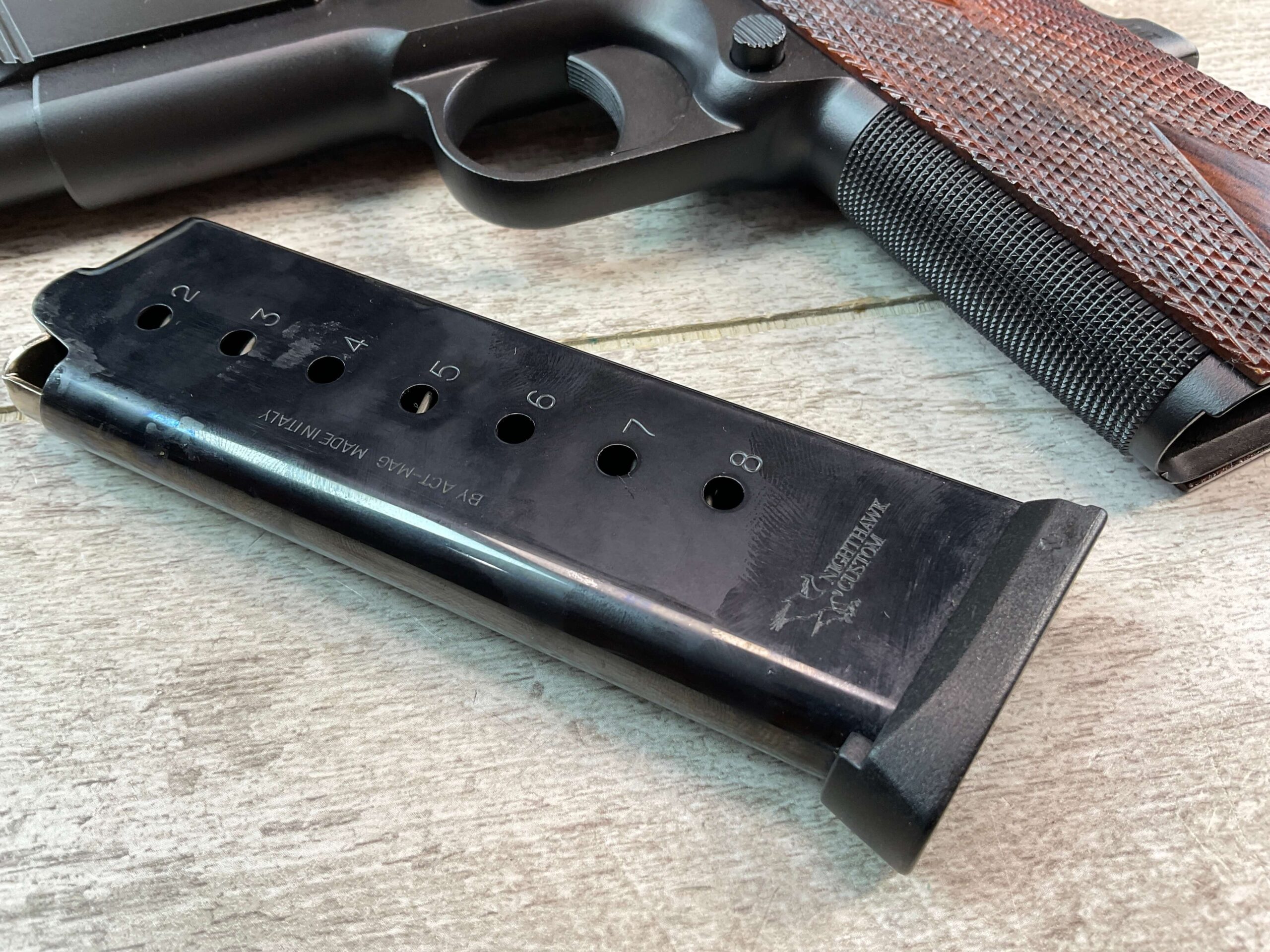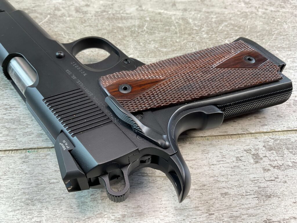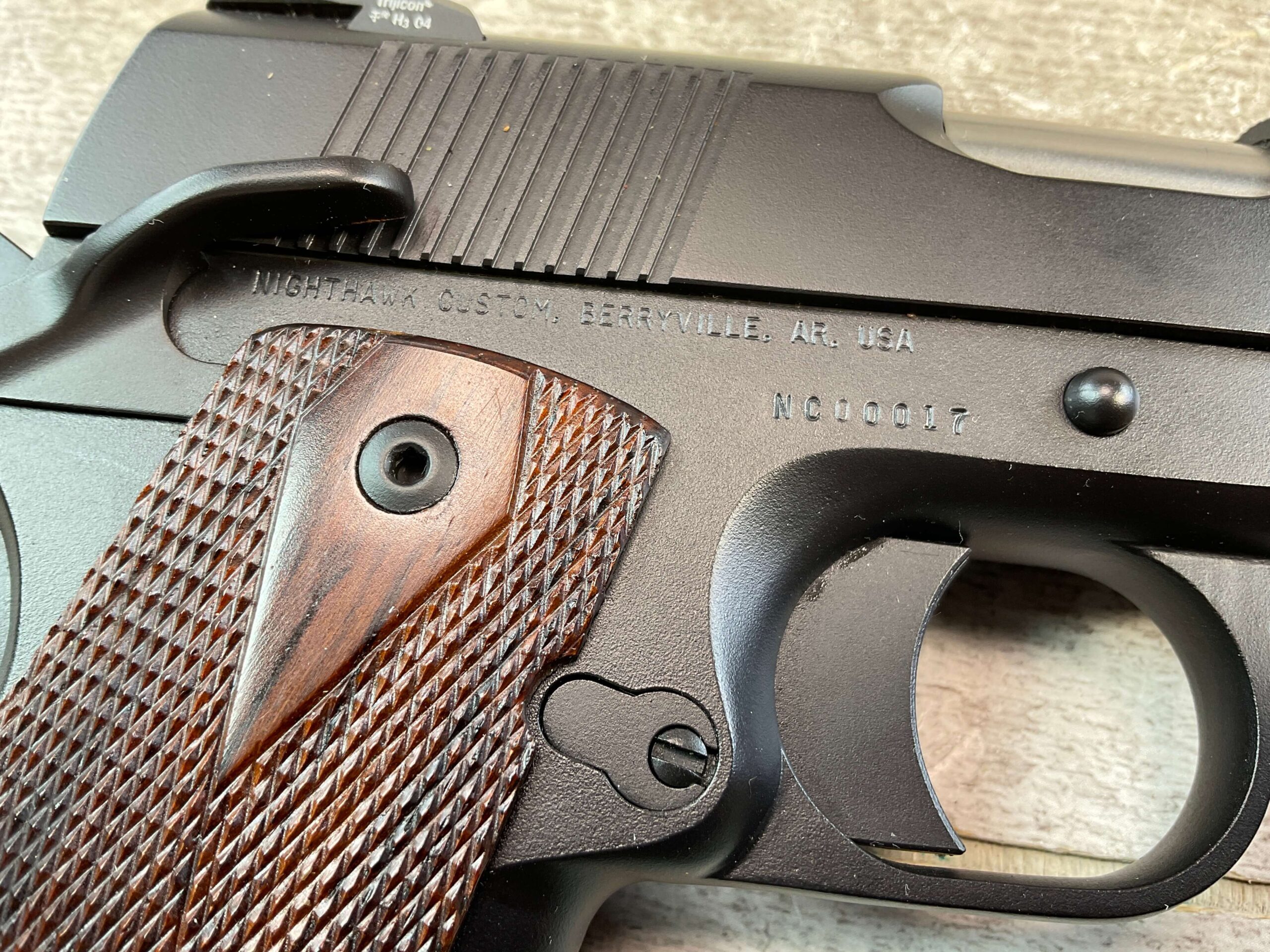 NIGHTHAWK CUSTOM GOVT MOD .45 ACP SEMI AUTO PISTOL, JAMES EARL JONES COLLECTION #NC00017, 5″ BARREL, “NAKED SLIDE”, EXC BORE & RIFLING, EXC CHECKERED GRIPS, ONE NIGHTHAWK MAGAZINE, BEAUTIFUL FINISH, NIGHTHAWK MATCH BARREL, CONDITION AS SHOWN IN PICTURES, FROM THE JAMES EARL JONES “FAVORITES” COLLECTION W/ CERTIFICATE OF AUTHENTICITY.
