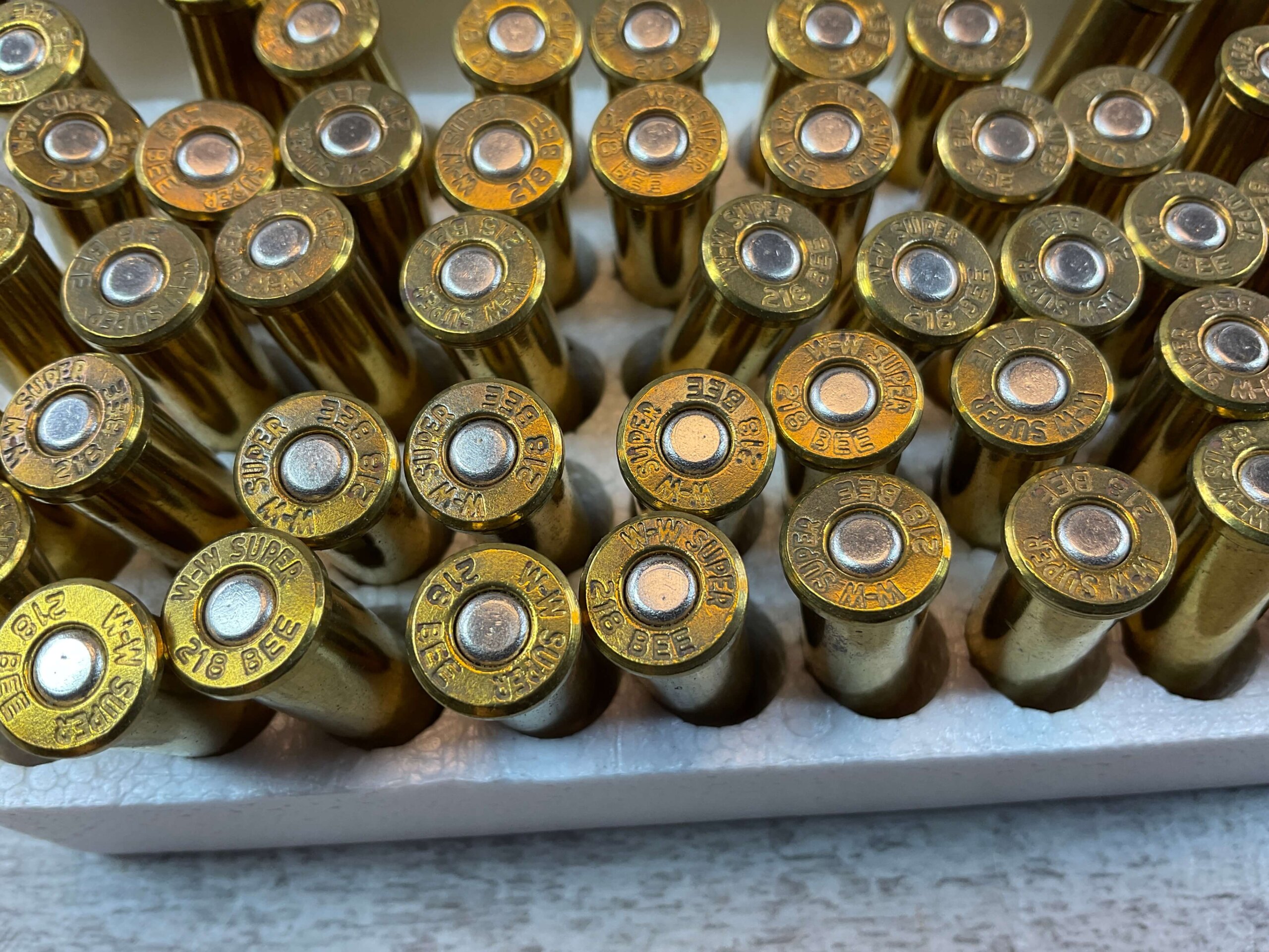 OBSOLETE AMMUNITION BOX, (WINCHESTER) 218 BEE, 46 GR. HP AMMO, FULL BOX (QTY 50), HEADSTAMP INCLUDES “W-W” WHICH LEADS US TO BELIEVE THIS IS NOT OBSOLETE BRAND, BUT RATHER WINCHESTER IN OBSOLETE BOXING. BOX IS IN EXC. CONDITION AND FUNCTIONS/DISPLAYS WELL!