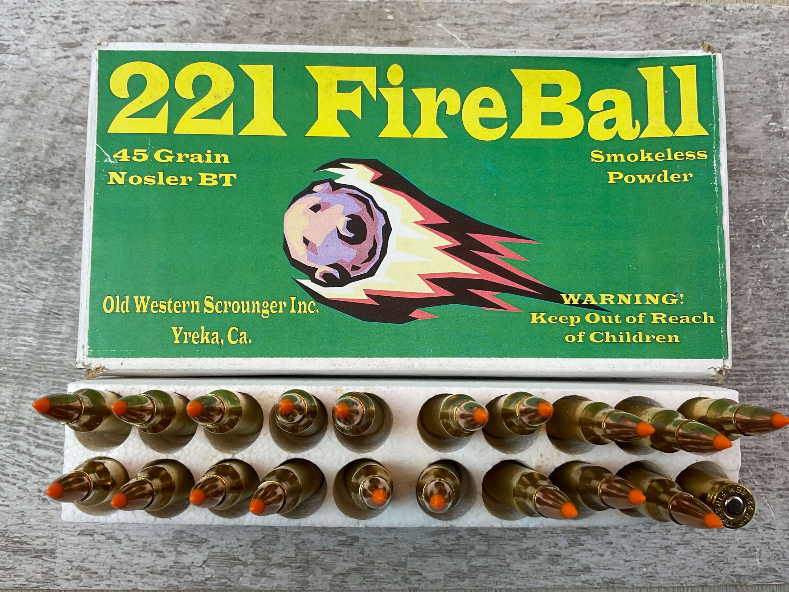 OLD WESTERN SCROUNGER INC. 221 REM FIREBALL AMMO, REMINGTON AMMO, FULL BOX (QTY 20), HEADSTAMPED “R-P 221 REM FIREBALL”, HAS ORANGE TIP, BY HSM, BOX IS IN GOOD CONDITION WITH SOME WEAR AND DISCOLORATION FROM STORAGE.