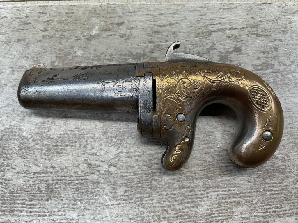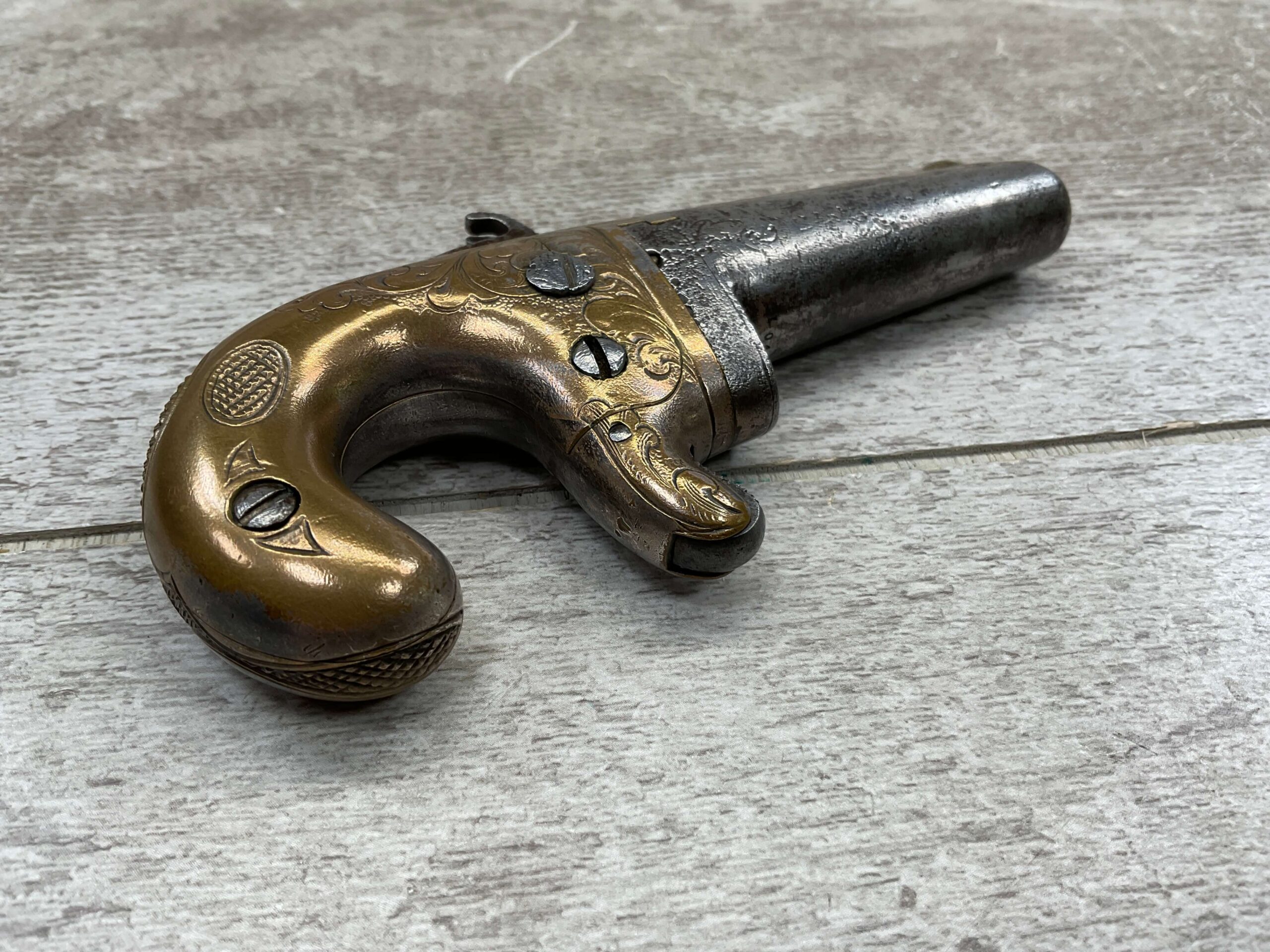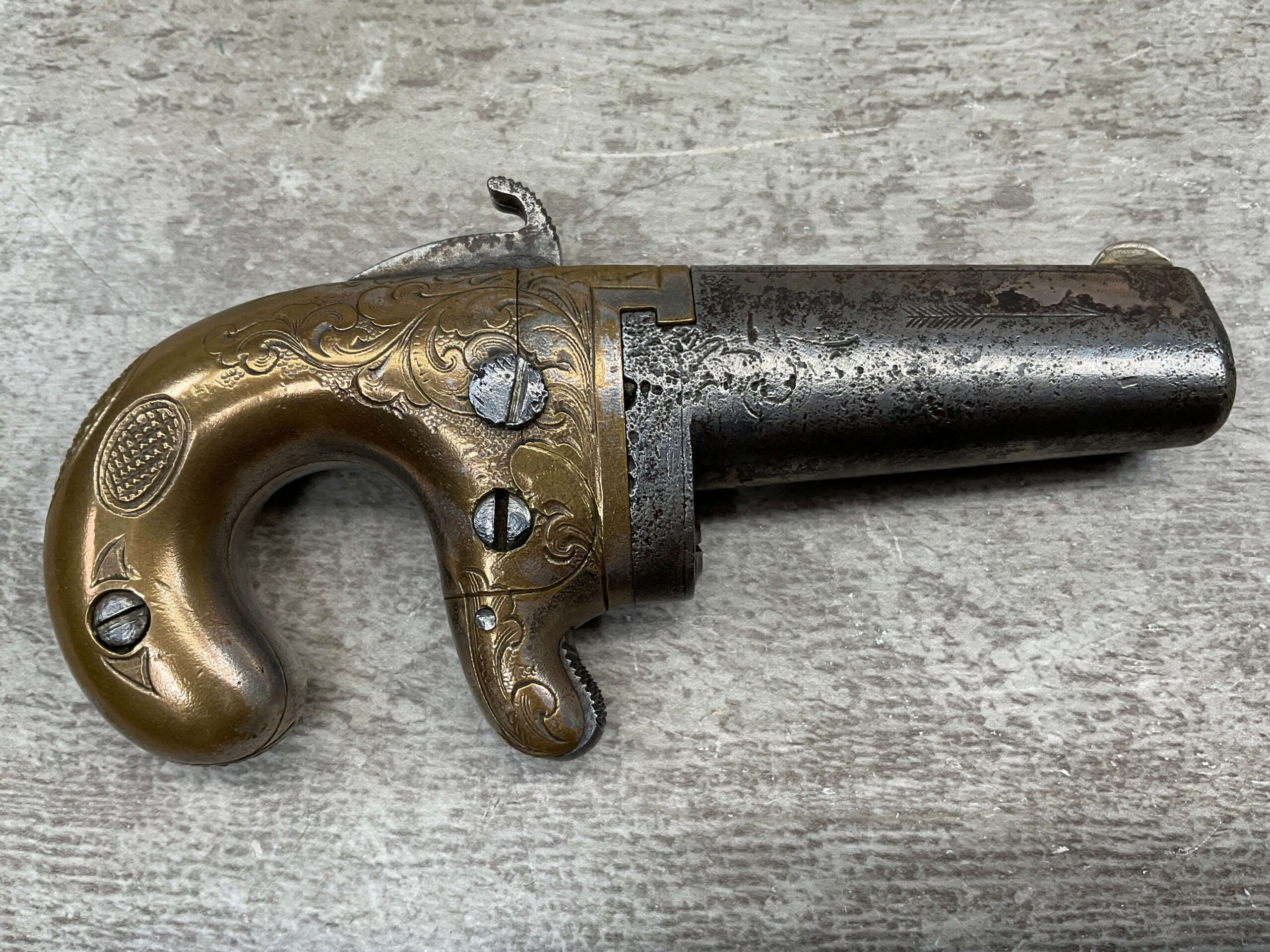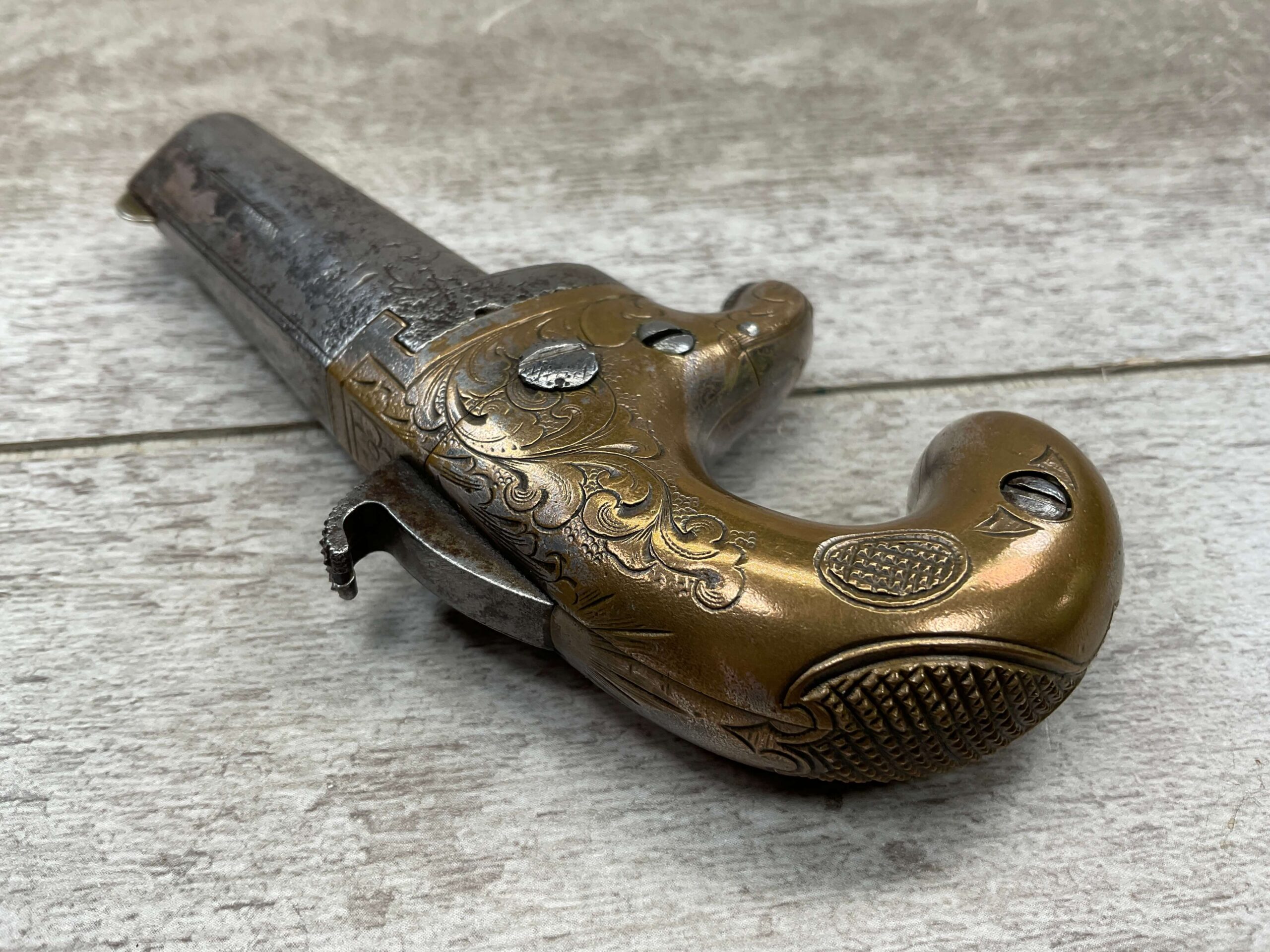 ORIGINAL CIVIL WAR ERA MOORE’S PATENT F.A. CO. NO.1 DERRINGER .41RF SINGLE SHOT PISTOL, ANTIQUE #1040, ALL MATCHING, GOOD NICKEL FINISH BARREL W/ PITTED AREAS, FAIR BORE W/ FROSTING & GOOD RIFLING, BRASS FRAME W/ ENGRAVING, SPUR TRIGGER, MOORE’S PATENT F.A. CO. BROOKLYN, N.Y. FAINTLY ON TOP OF BARREL, 2 1/2″ ROTATING BARREL, FULLY FUNCTIONING, NOT A REPRODUCTION, OVERALL CONDITION AS SEEN IN PHOTOS