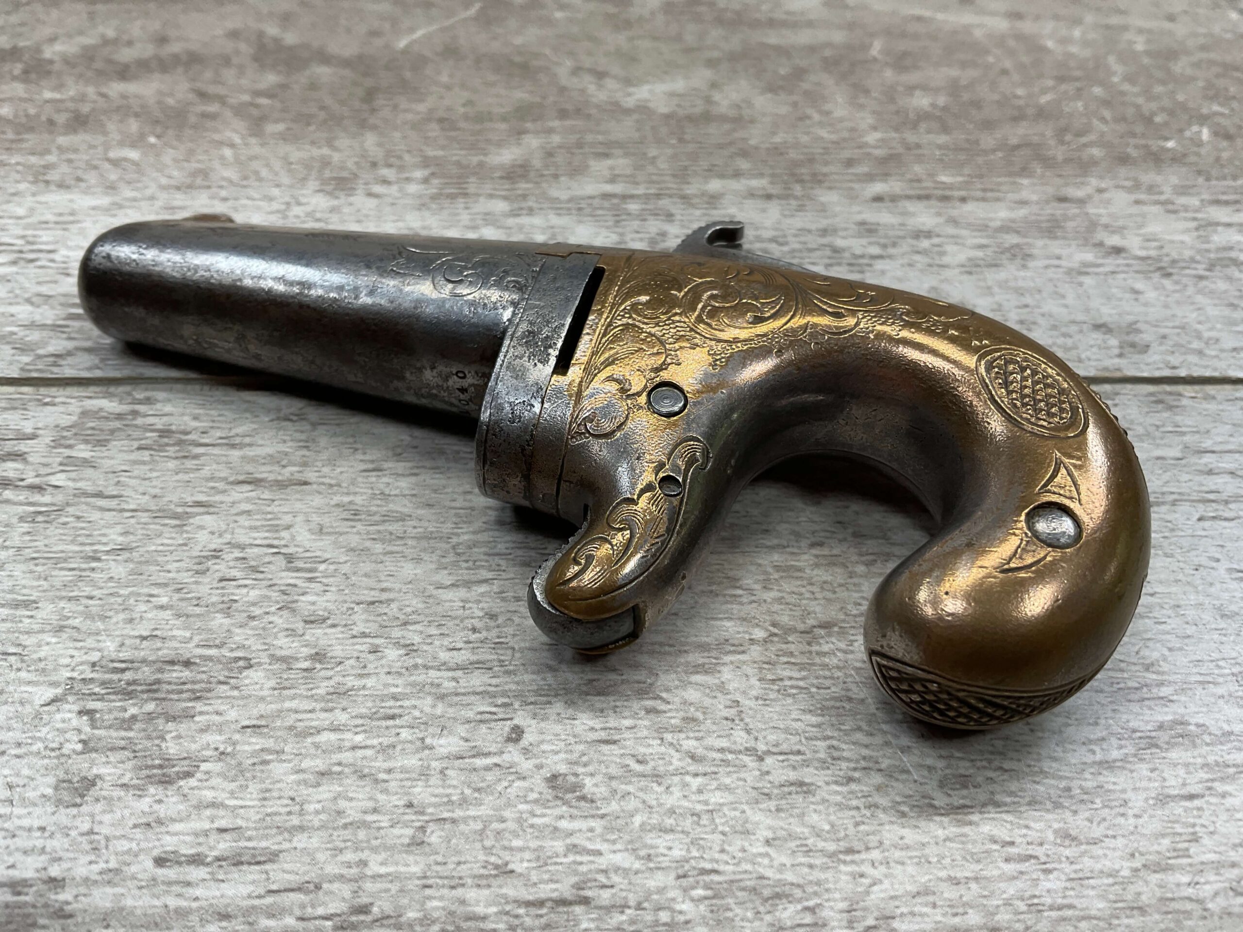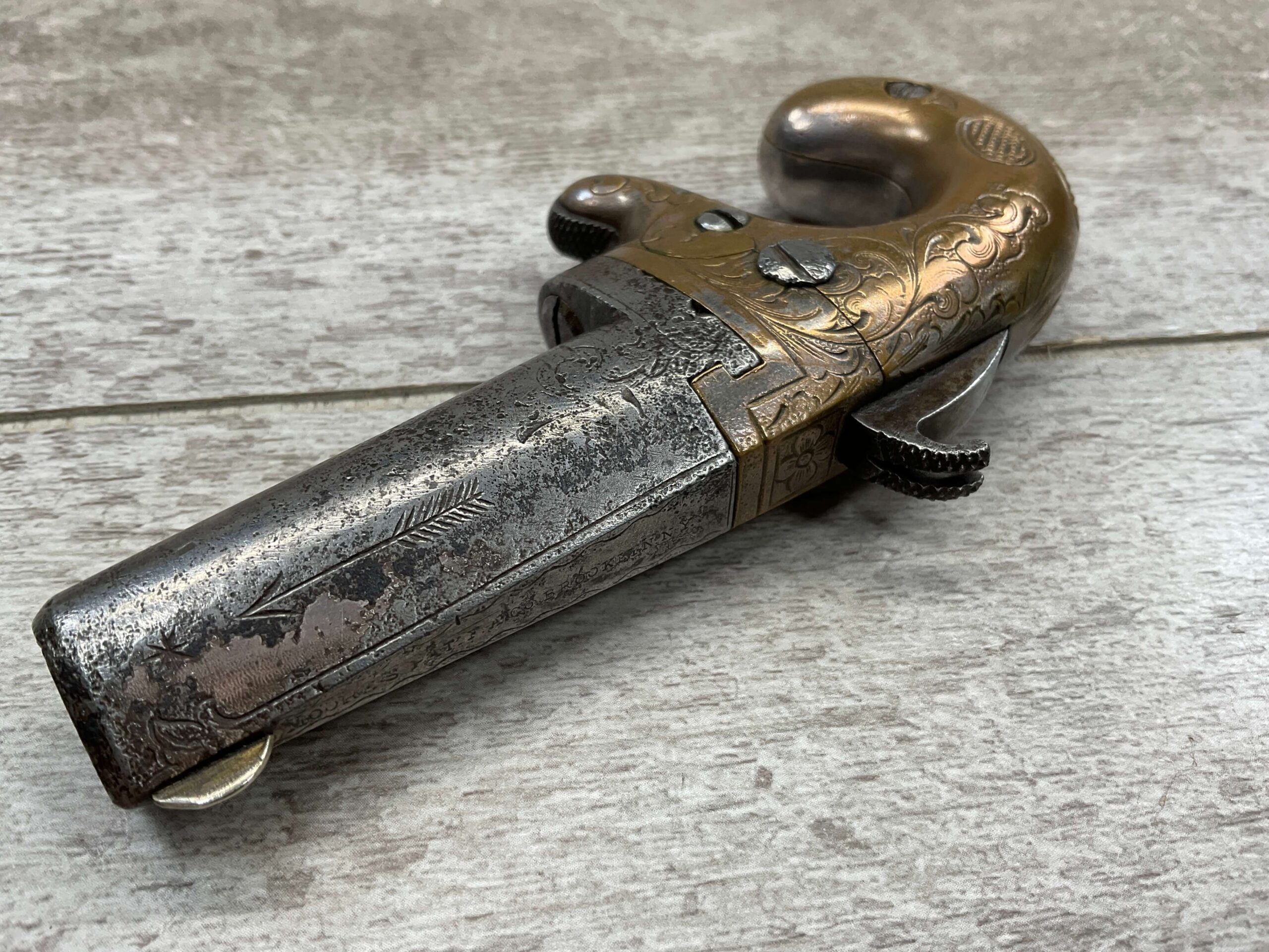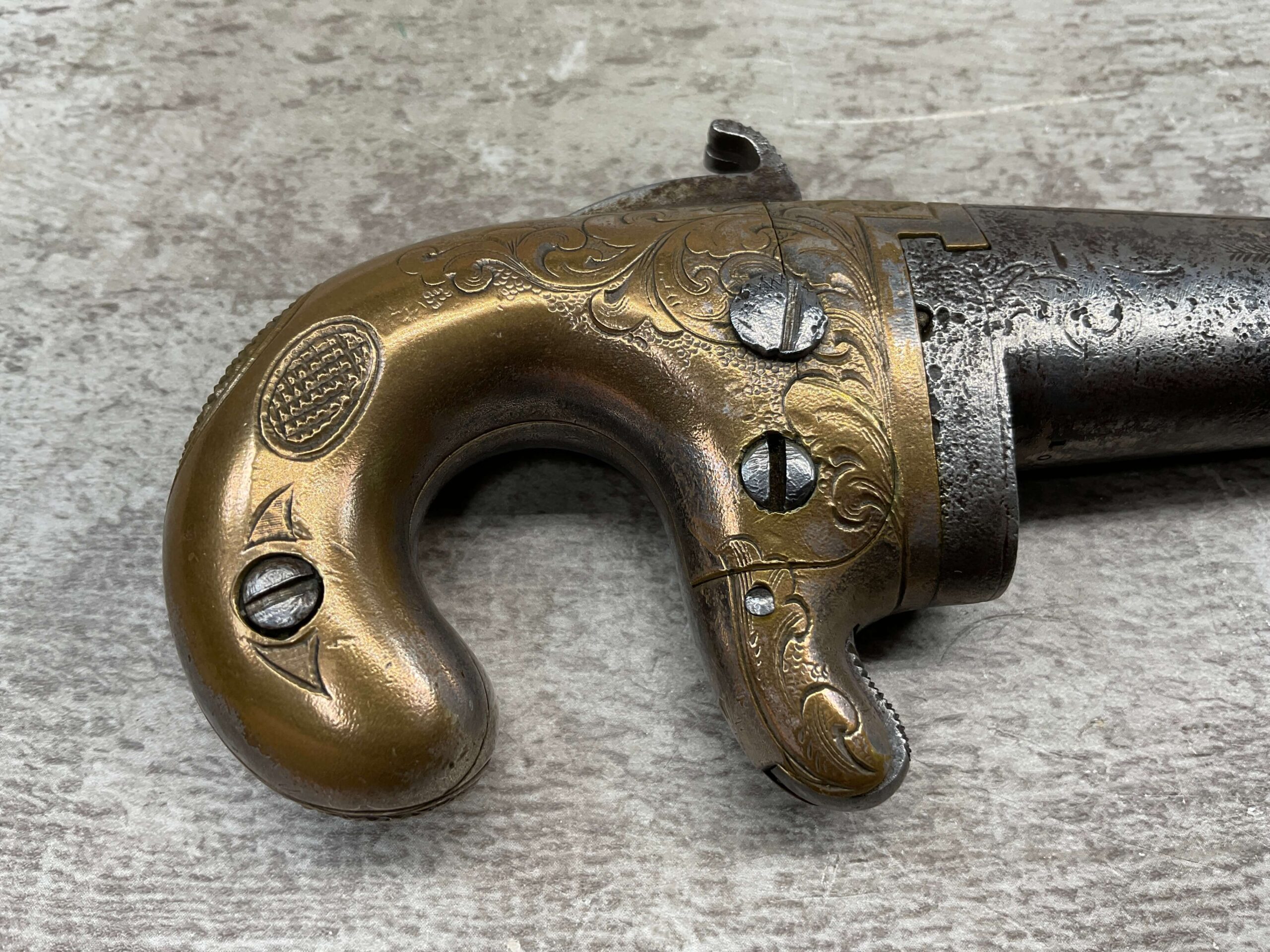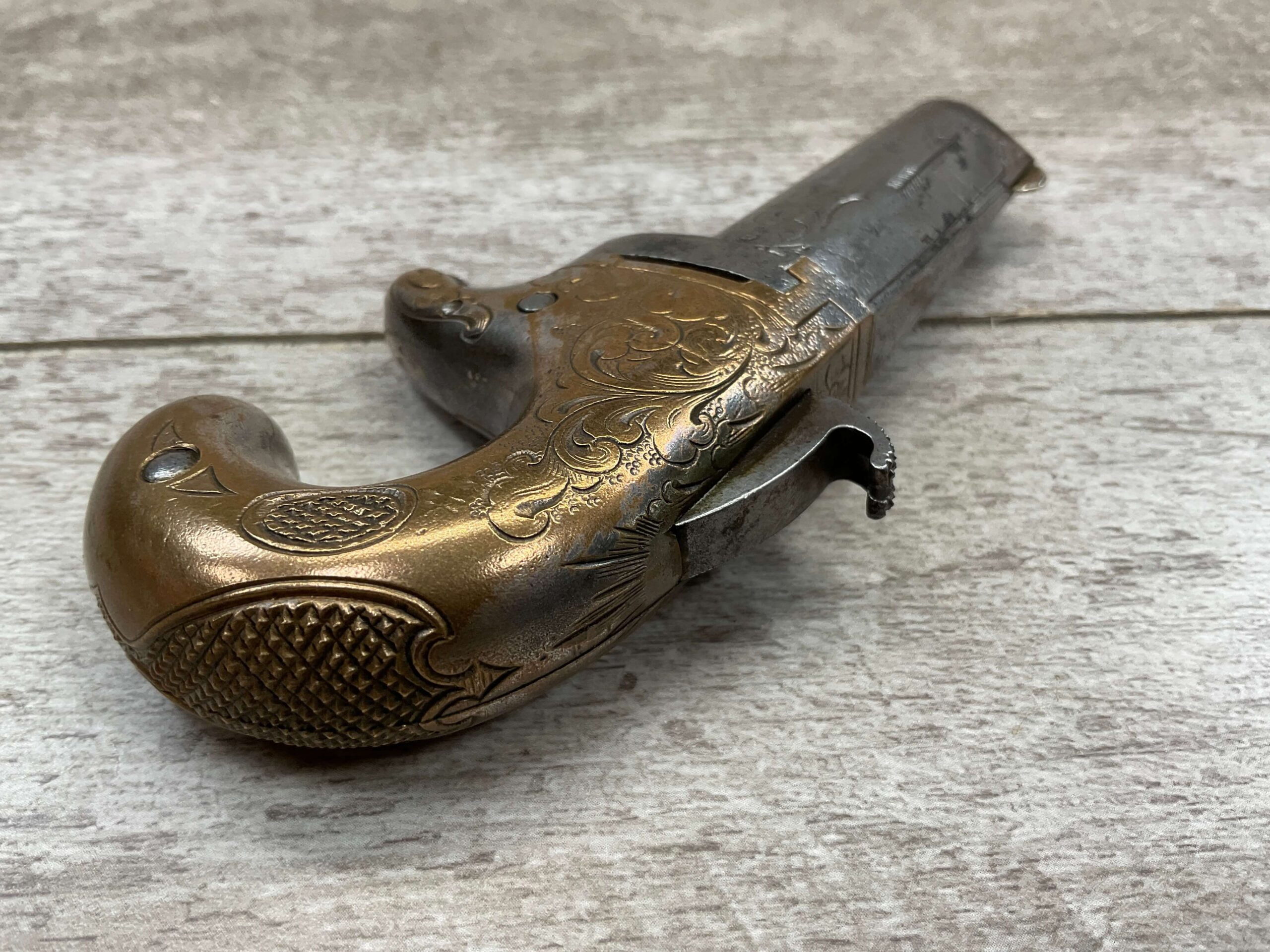 ORIGINAL CIVIL WAR ERA MOORE’S PATENT F.A. CO. NO.1 DERRINGER .41RF SINGLE SHOT PISTOL, ANTIQUE #1040, ALL MATCHING, GOOD NICKEL FINISH BARREL W/ PITTED AREAS, FAIR BORE W/ FROSTING & GOOD RIFLING, BRASS FRAME W/ ENGRAVING, SPUR TRIGGER, MOORE’S PATENT F.A. CO. BROOKLYN, N.Y. FAINTLY ON TOP OF BARREL, 2 1/2″ ROTATING BARREL, FULLY FUNCTIONING, NOT A REPRODUCTION, OVERALL CONDITION AS SEEN IN PHOTOS