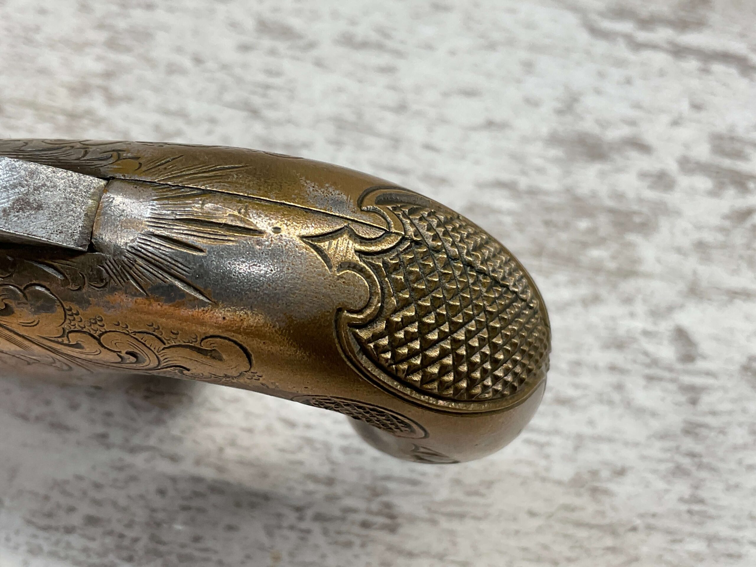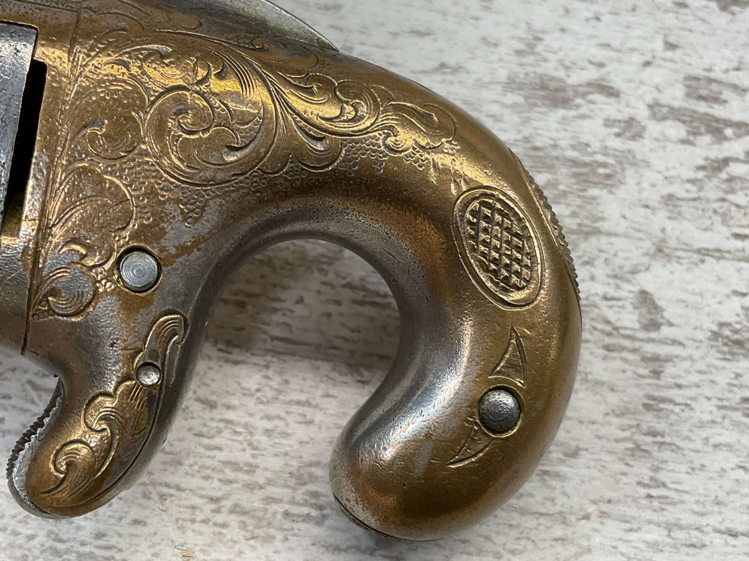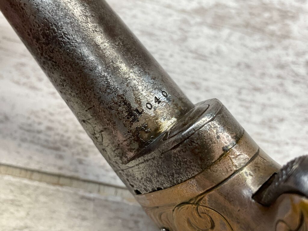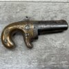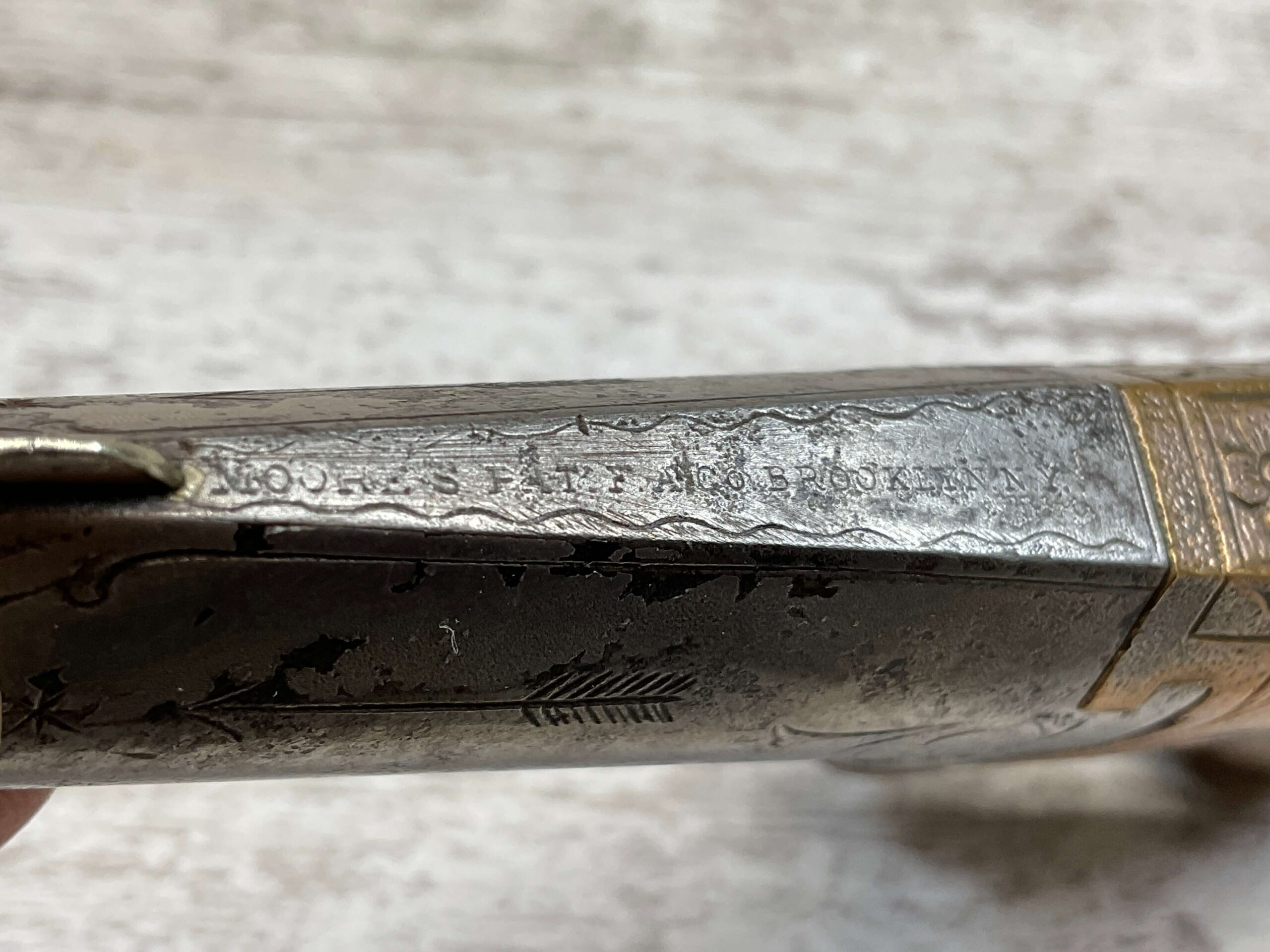 ORIGINAL CIVIL WAR ERA MOORE’S PATENT F.A. CO. NO.1 DERRINGER .41RF SINGLE SHOT PISTOL, ANTIQUE #1040, ALL MATCHING, GOOD NICKEL FINISH BARREL W/ PITTED AREAS, FAIR BORE W/ FROSTING & GOOD RIFLING, BRASS FRAME W/ ENGRAVING, SPUR TRIGGER, MOORE’S PATENT F.A. CO. BROOKLYN, N.Y. FAINTLY ON TOP OF BARREL, 2 1/2″ ROTATING BARREL, FULLY FUNCTIONING, NOT A REPRODUCTION, OVERALL CONDITION AS SEEN IN PHOTOS