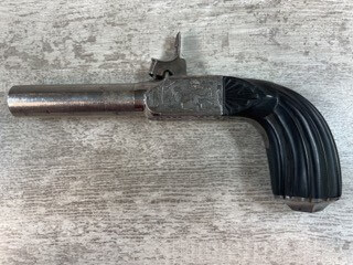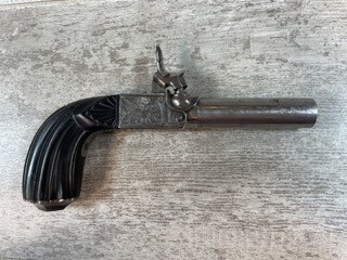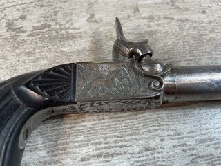 SKU#196 PERCUSSION BOXLOCK FRENCH MUFF PISTOL #NSN, SCREW OFF BARREL, RIFLED BARREL, EBONY FLUTED GRIPS, HIDDEN DROP DOWN TRIGGER, NO PROOF MARKS, ENGRAVED W/DOG ON LEFT SIDE AND FOX ON THE RIGHT, OVERALL A NICE EXAMPLE OF MID 19TH CENTURY ENGLISH PERCUSSION MUFF PISTOL, 1840’S