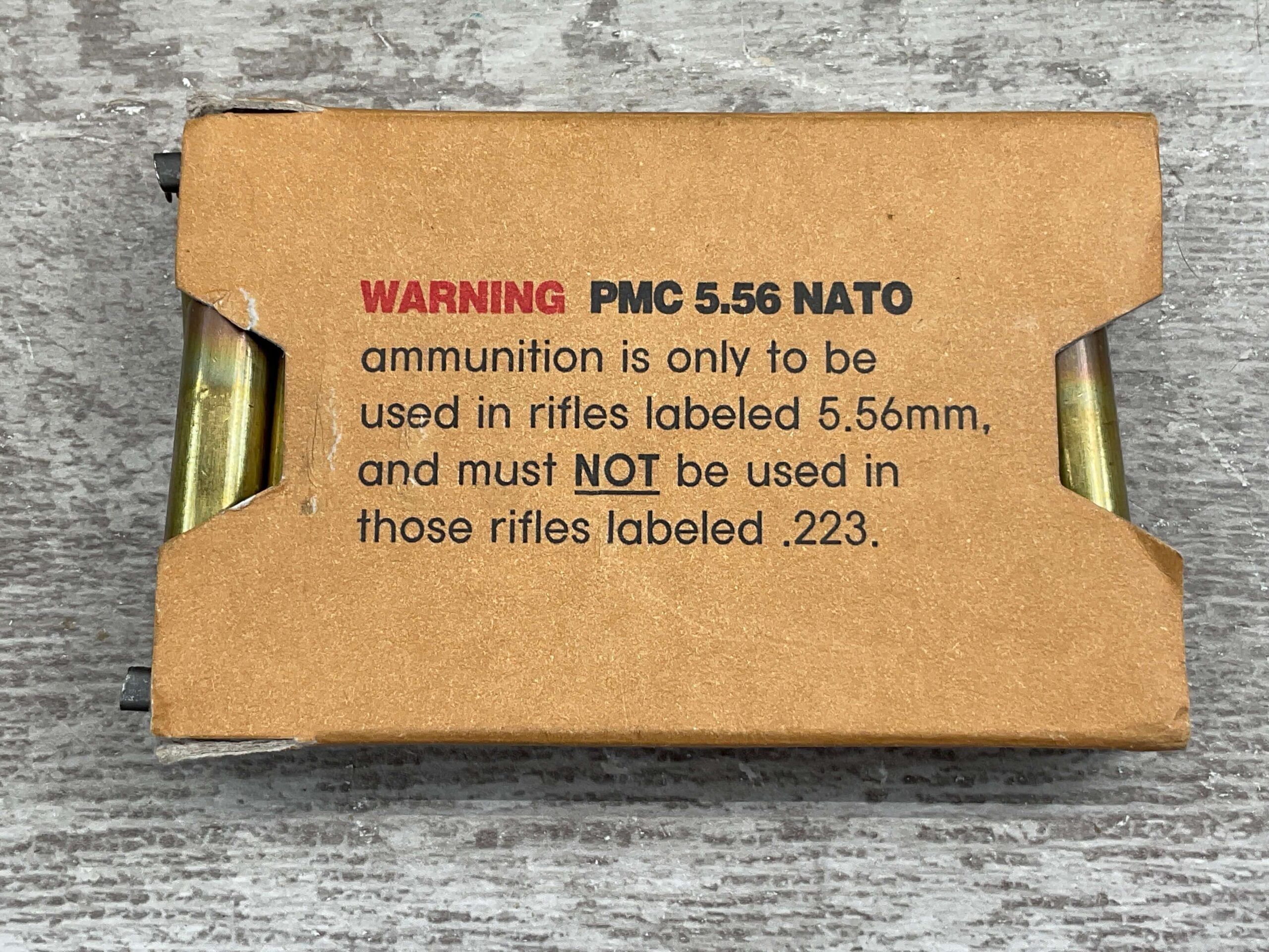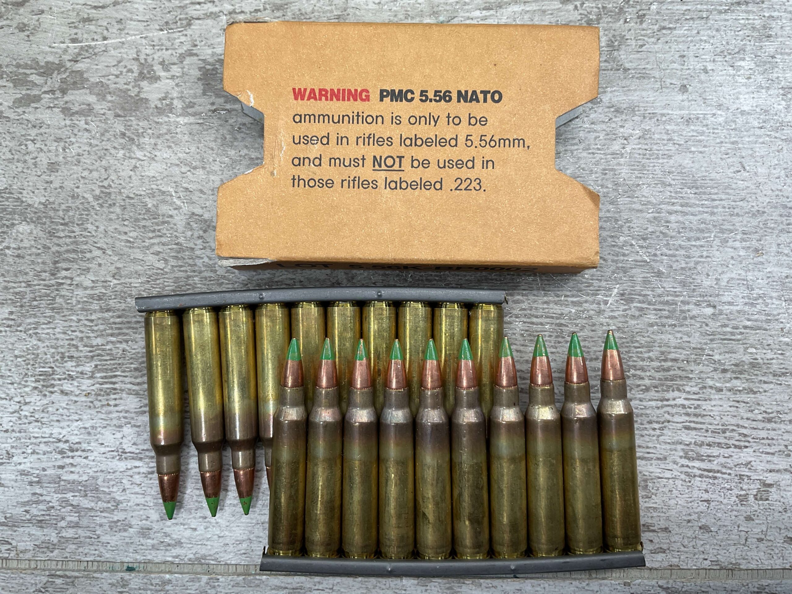 PMC 5.56MM NATO 62 GRS. GREEN TIP-LAP, 20 ROUNDS IN CLIPS, IN GREAT CONDITION