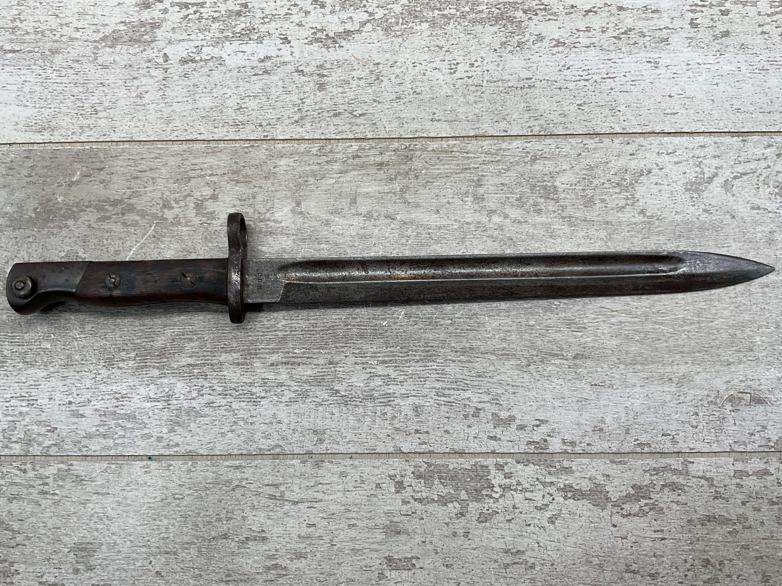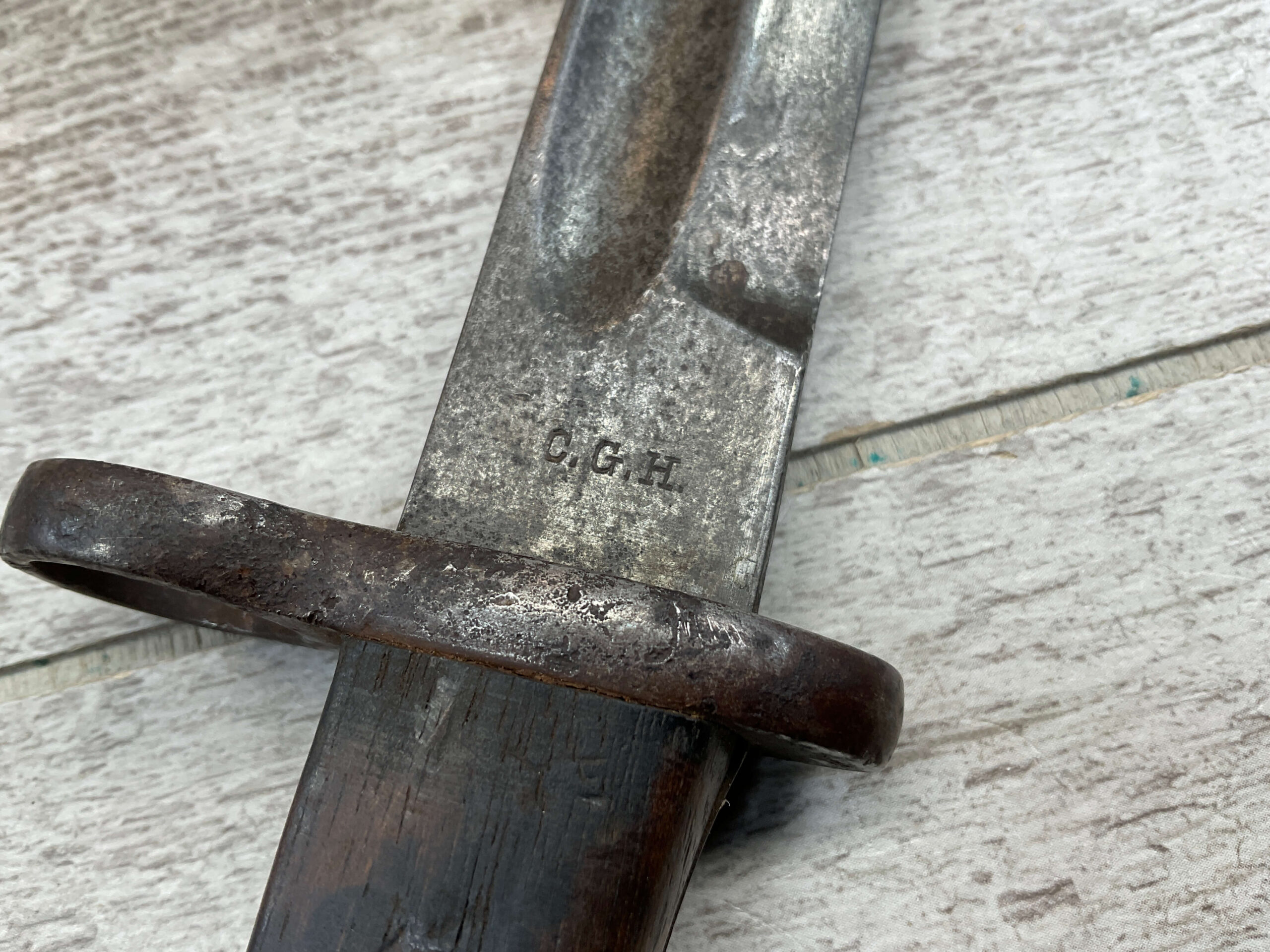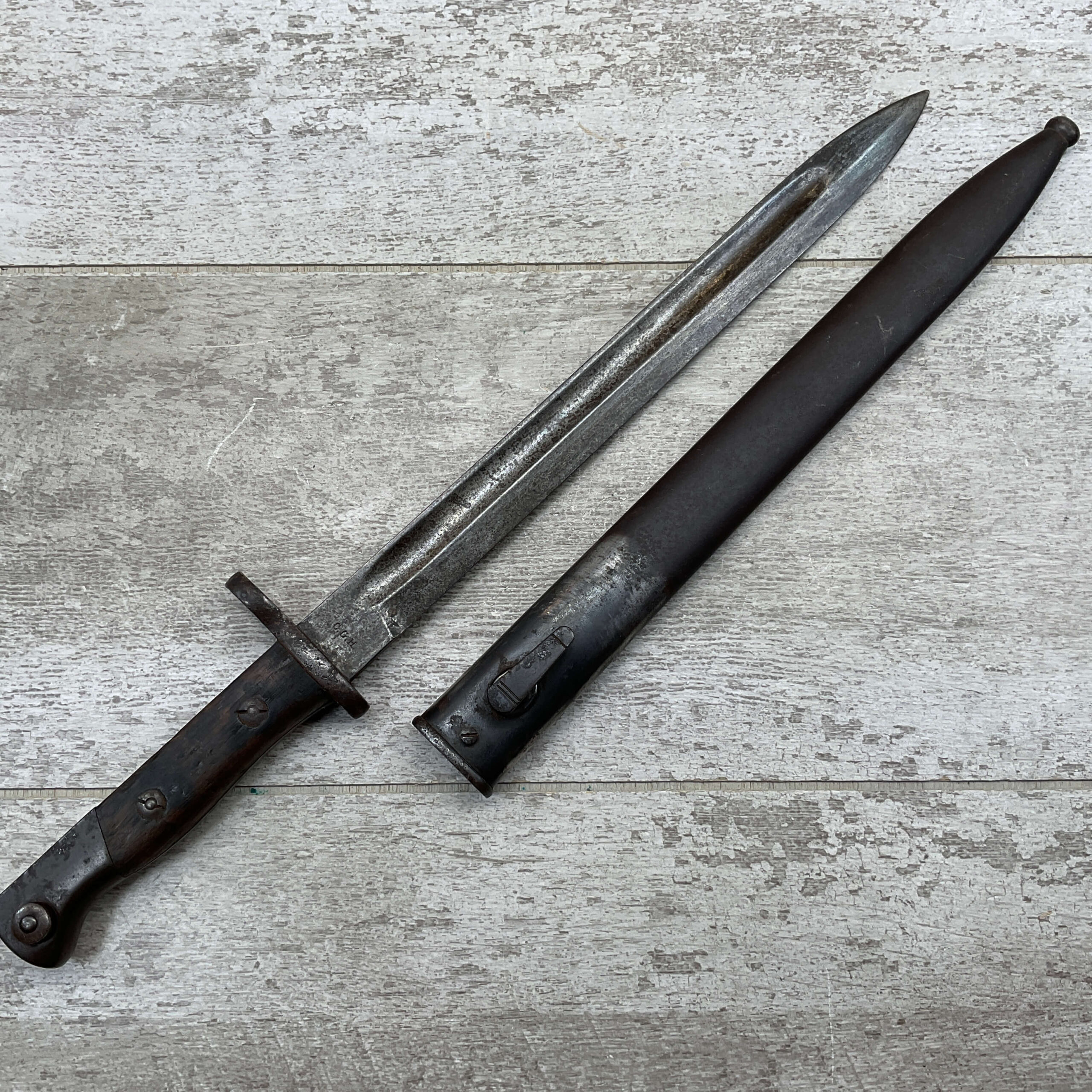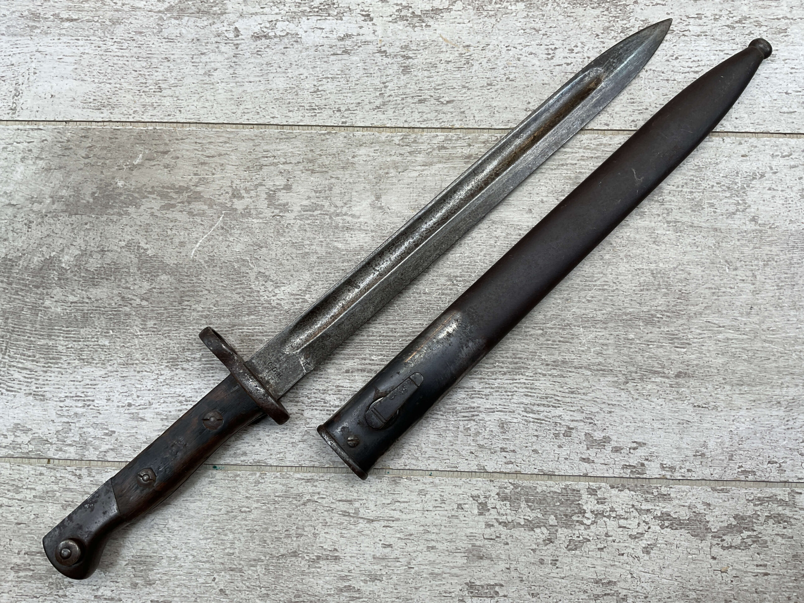 PORTUGAL M1904 BAYONET & SCABBARD BY C.G.H., 15 15/16″ OVERALL LENGTH, 11 3/8″ BLADE LENGTH, BLADE MARKED “C.G.H.”, VG OVERALL