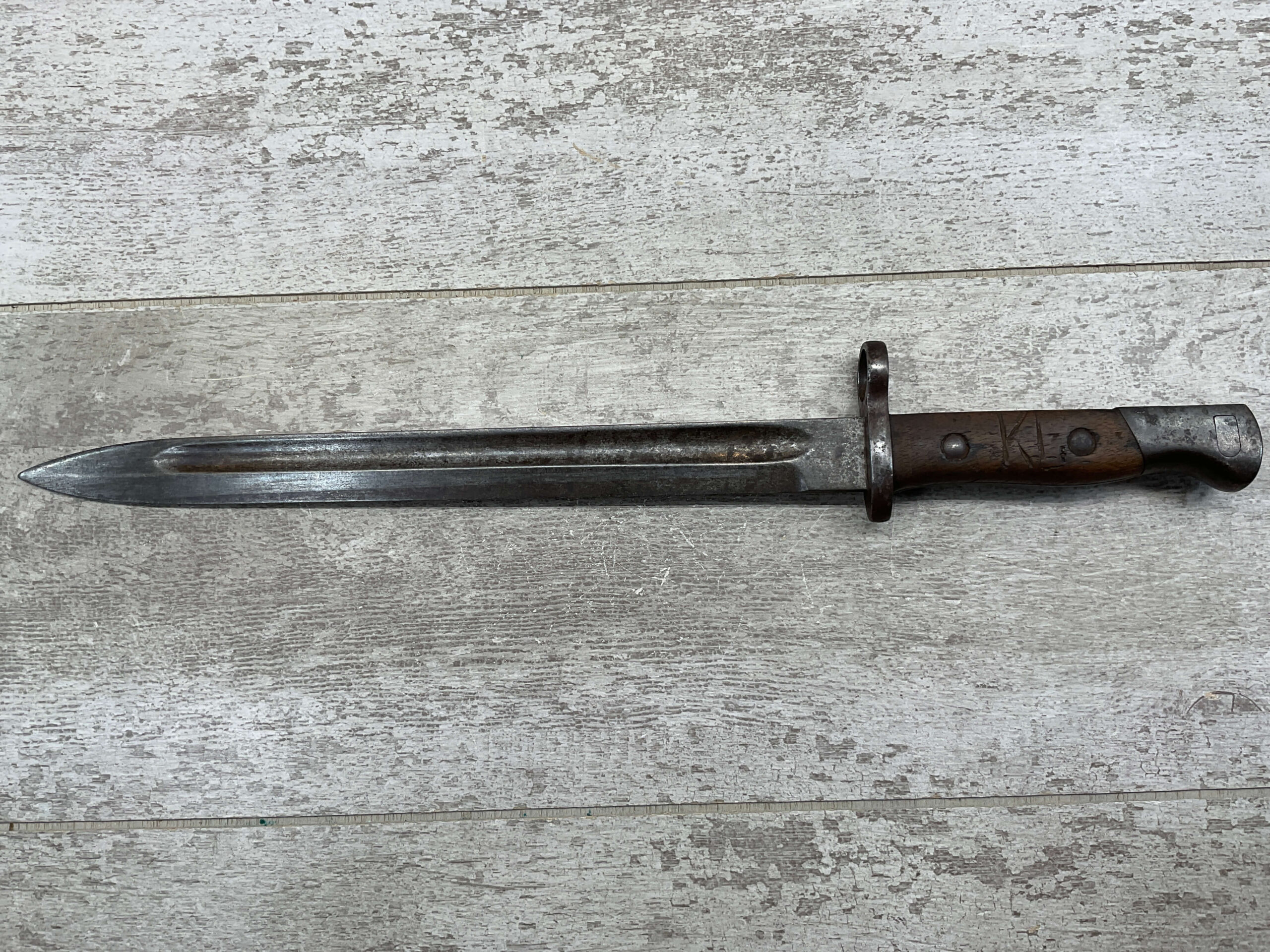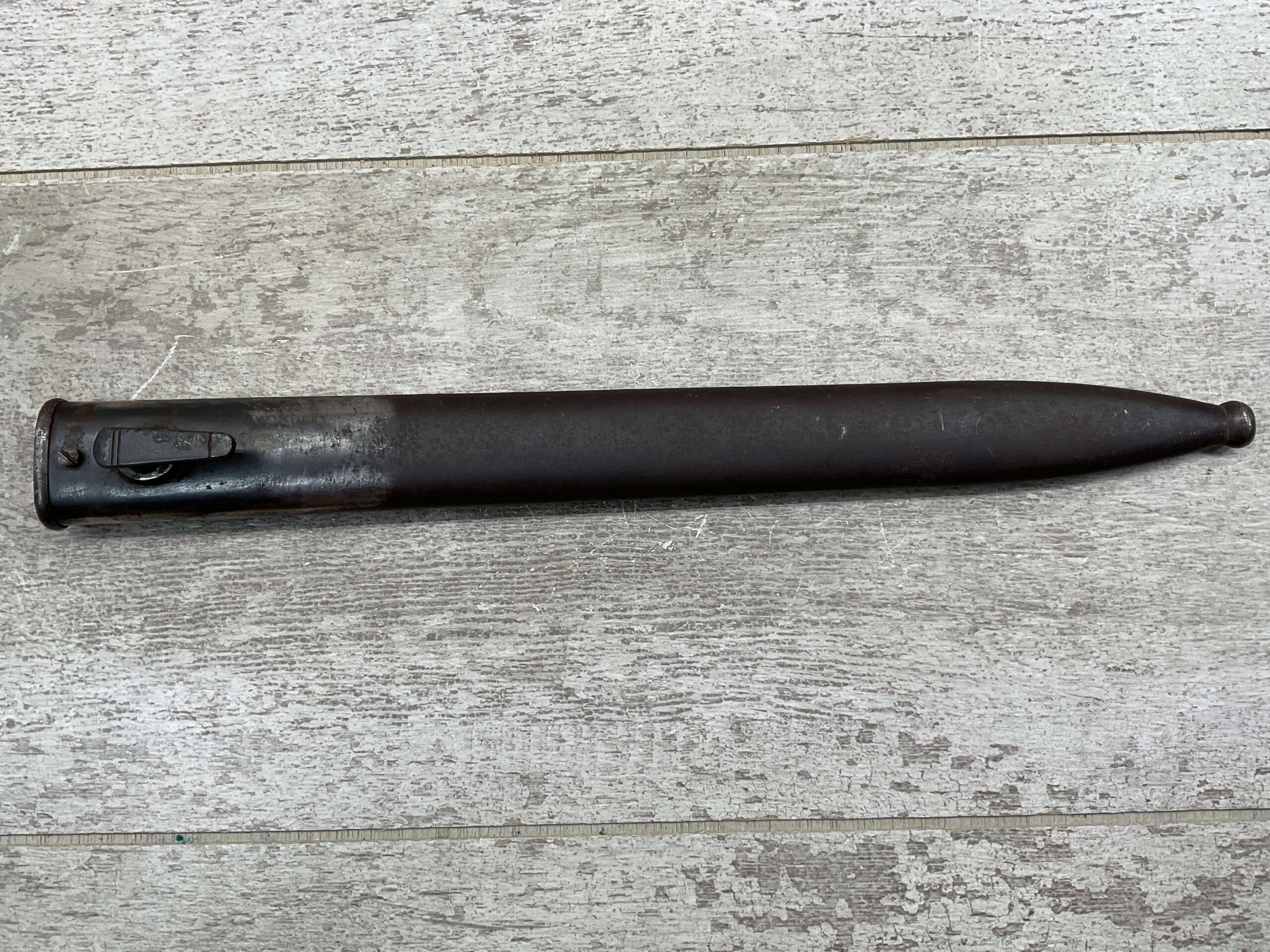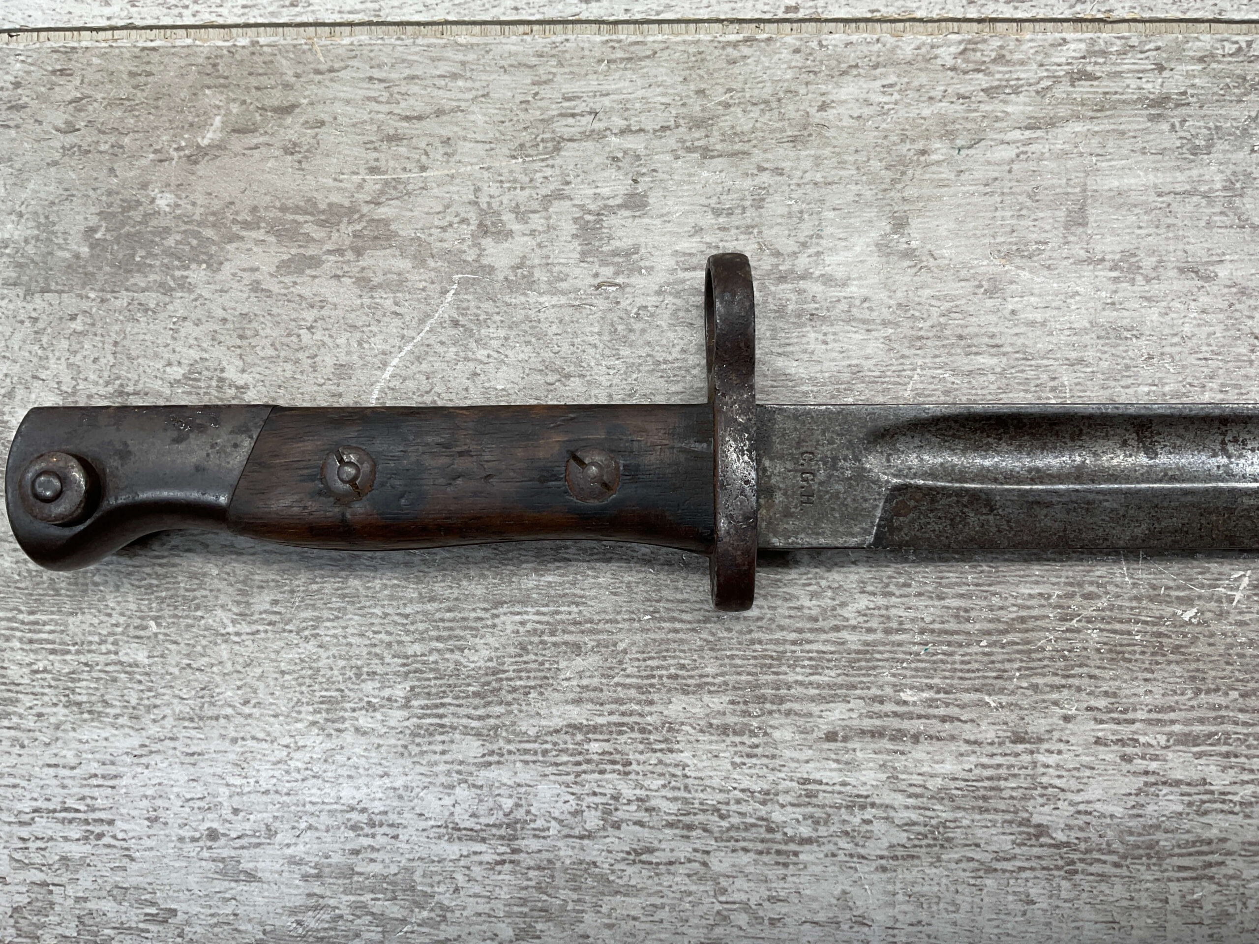 PORTUGAL M1904 BAYONET & SCABBARD BY C.G.H., 15 15/16″ OVERALL LENGTH, 11 3/8″ BLADE LENGTH, BLADE MARKED “C.G.H.”, VG OVERALL