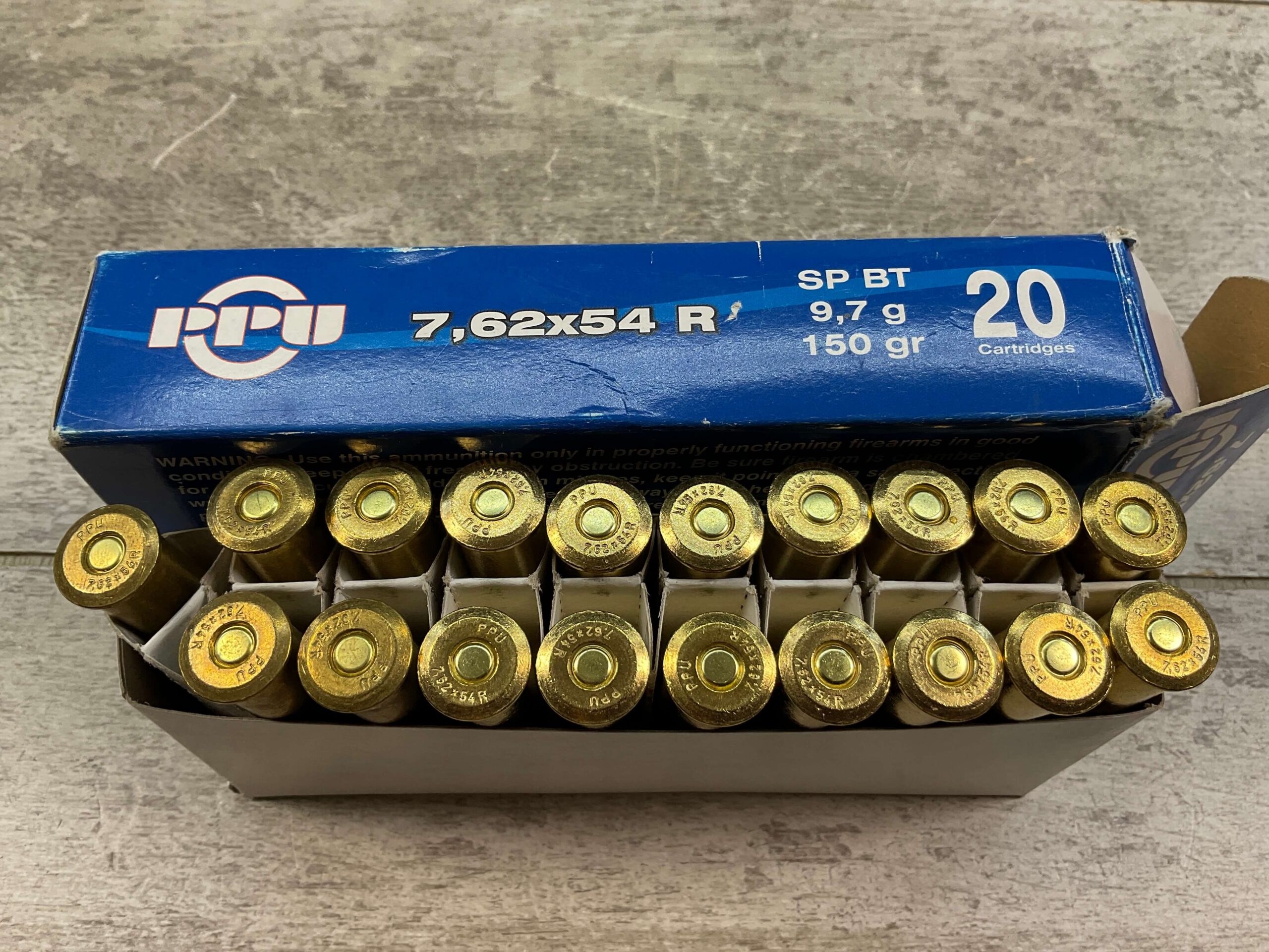 PPU 7.62X54R, 150 GR, SOFT POINT BT AMMO, QTY 19, BOX IS IN NOT GREAT CONDITION AND IS BROKEN ON ONE SIDE.