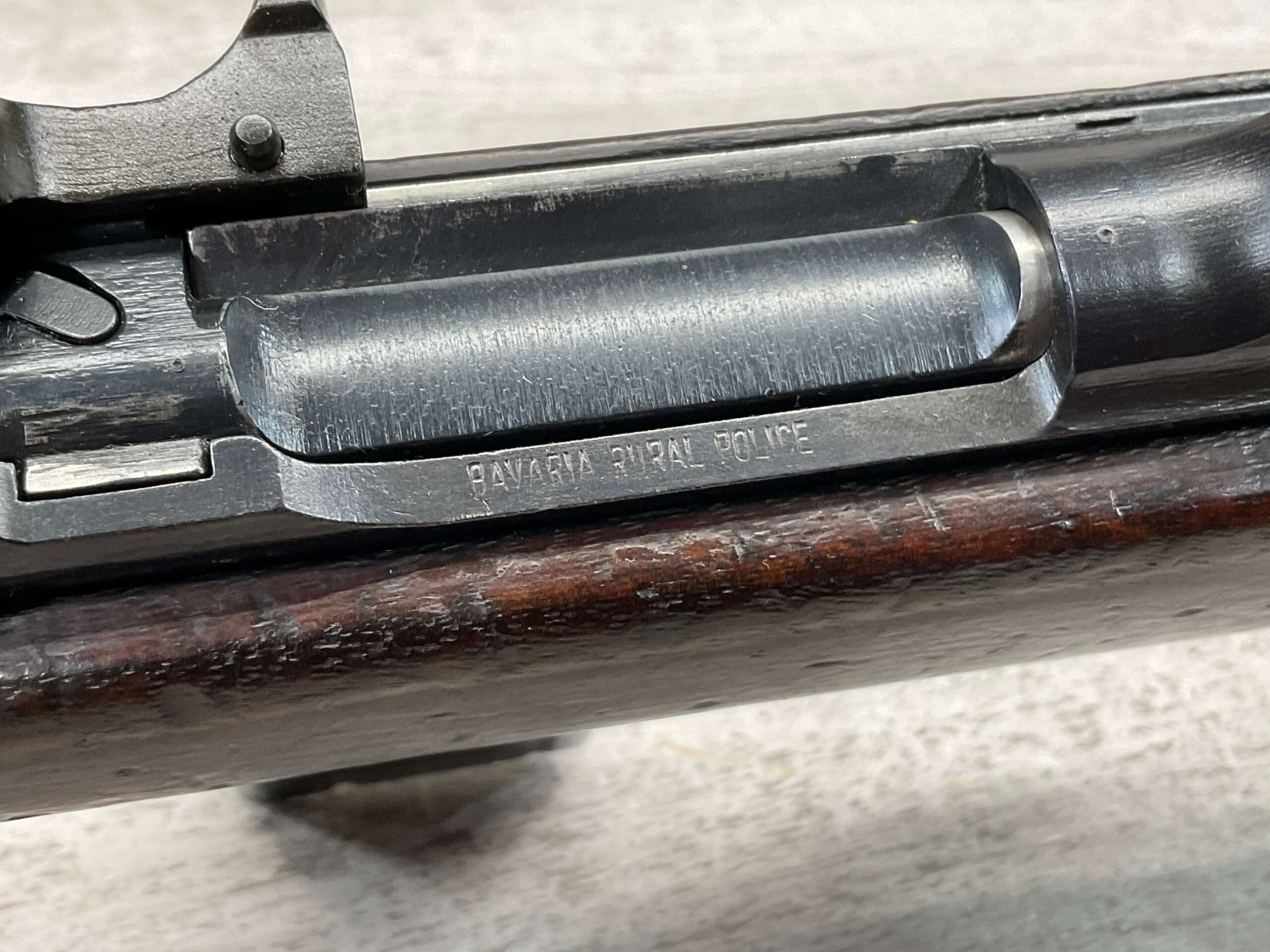 MARKING ON RECEIVER NEAR BOLT “BAVARIA RURAL POLICE”, UNDERSIDE OF BARREL IMPORT MARK “INTRAC, KNOXVILLE TN”, TOP OF BARREL “ROCK-OLAÂ /Â 6-43”