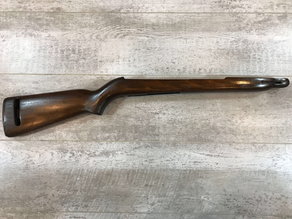 SKU#632 M1 CARBINE STOCK, STOCK#17, OVAL-CUT LOW WOOD, QUALITY HARDWARE, “Q-RMC” IN SLING WELL, REALLY FAINT CROSS CANNONS ON RIGHT SIDE OF BUTT STOCK, BECAUSE OF THESE CARTOUCHES THIS IS A QUALITY HARDWARE STOCK, NO RECOIL PLATE, NO BUTT PLATE, 98%