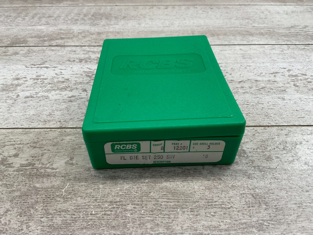 RELOADING DIE SET FOR FULL LENGTH 250 SAVAGE AMMUNITION INCLUDES 2 DIES, MFR BY RCBS OMARK INDUSTRIES, BOX IS LABELED GROUP A, PART NUMBER 12201, SET IS IN VERY GOOD CONDITION WITH ORIGINAL BOX AND INSTRUCTIONS.