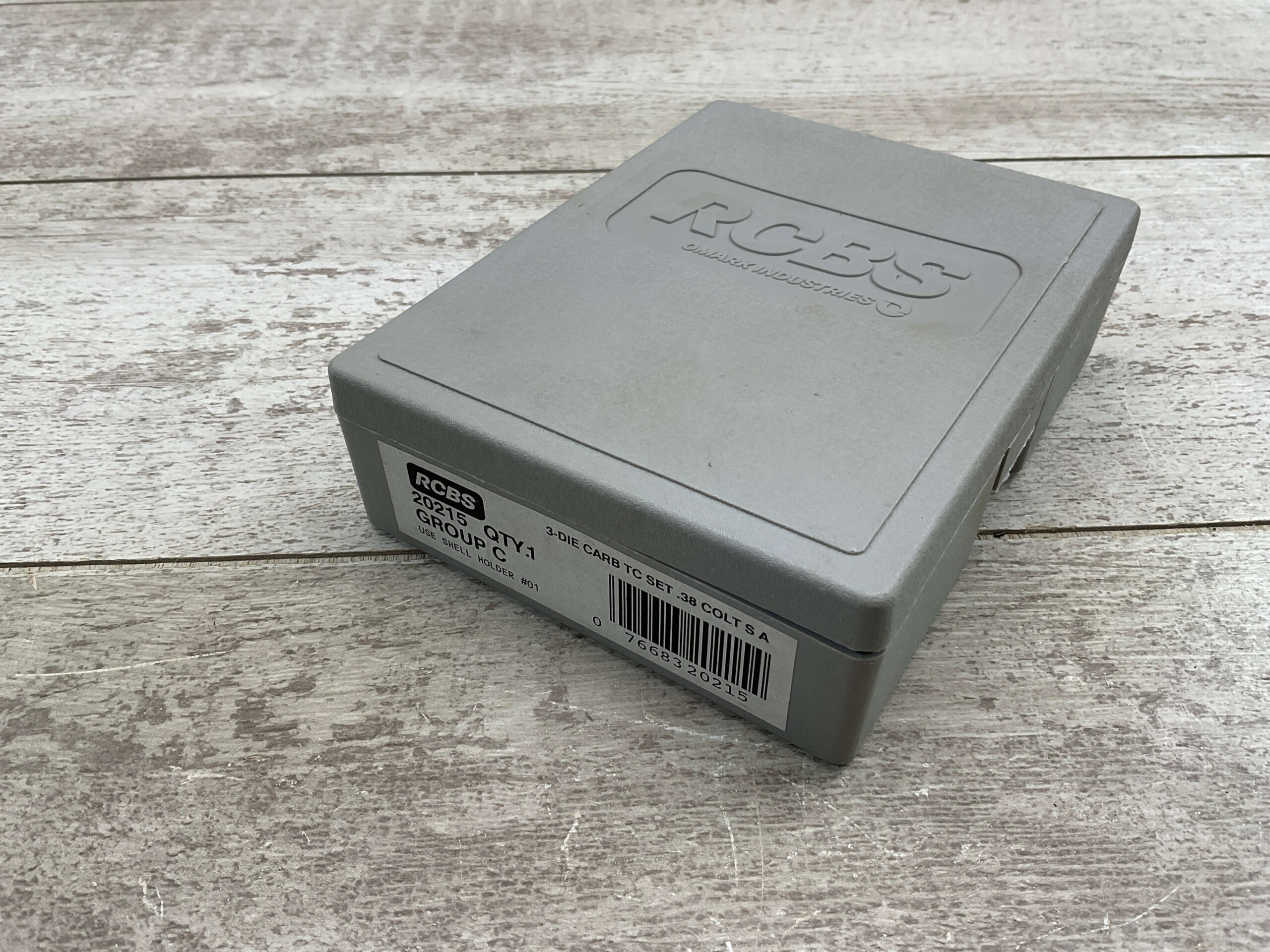 RELOADING CARBINE DIE SET FOR 38 COLT AMMUNITION INCLUDES 3 DIES, LEE UNIVERSAL SHELL HOLDER R6, MFR BY RCBS OMARK INDUSTRIES, BOX IS LABELED GROUP C, PART NUMBER 20215, SET IS IN VERY GOOD CONDITION WITH ORIGINAL BOX, AND INSTRUCTIONS.