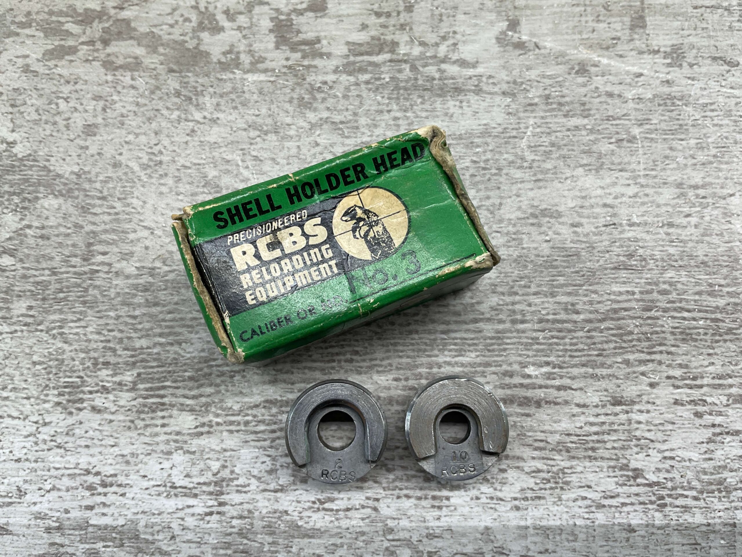 RCBS SHELL HOLDER #2 AND #10 ITEMS IN CARDBOARD BOX, BOTH IS VG USED CONDITION, CARDBOARD BOX IS LABELED NO. 3 WHICH IS NOT INCLUDED
