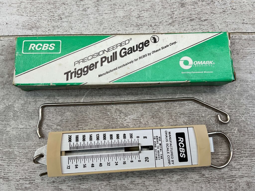 RCBS TRIGGER PULL GAUGE IN ORIGINAL BOX, VINTAGE, BOX READS “FOR RIFLE AND PISTOL, HEAVY DUTY STEEL HOOK, EASY TO READ VALUES”