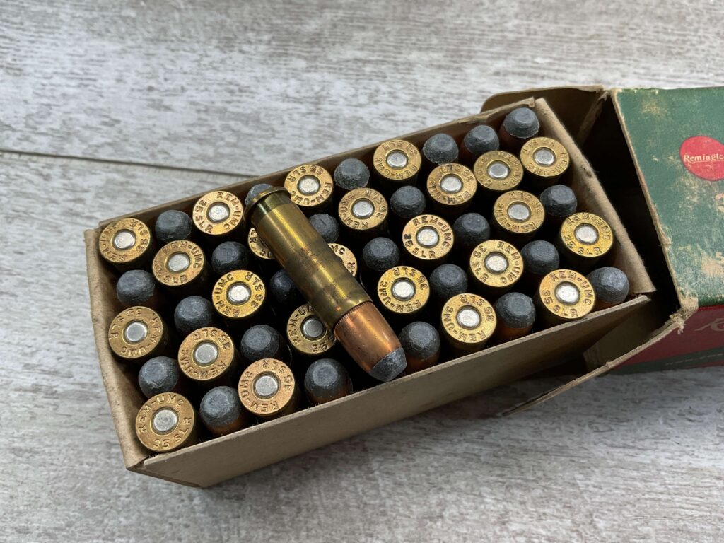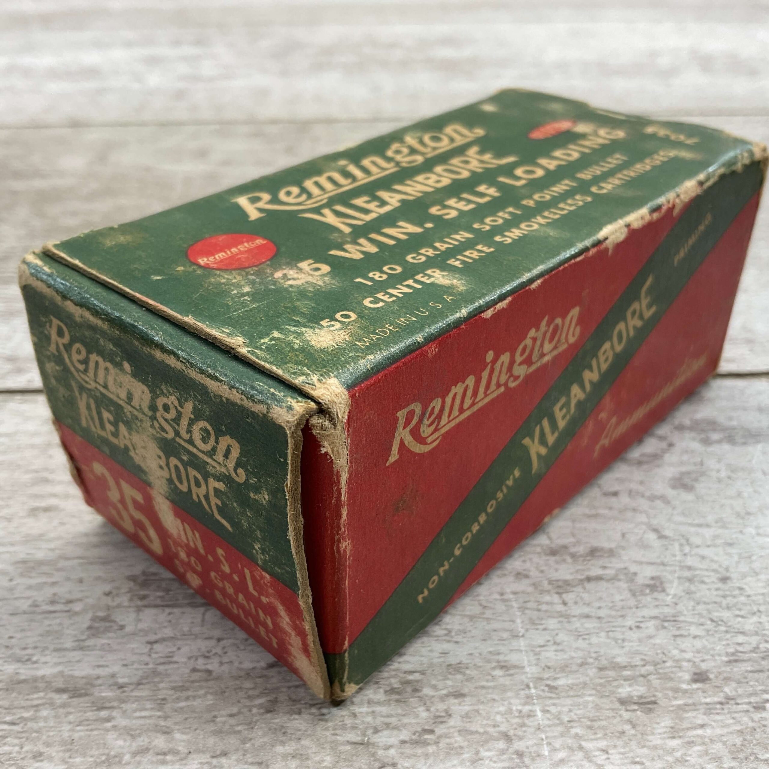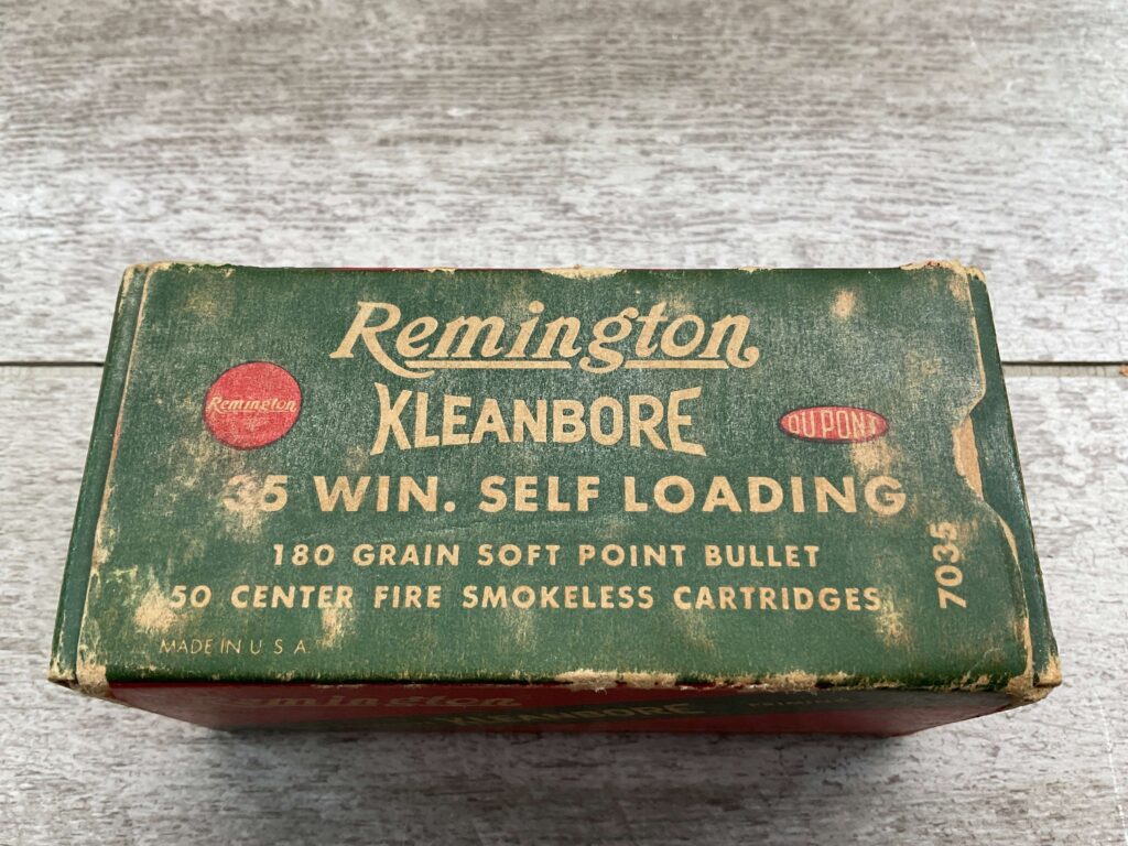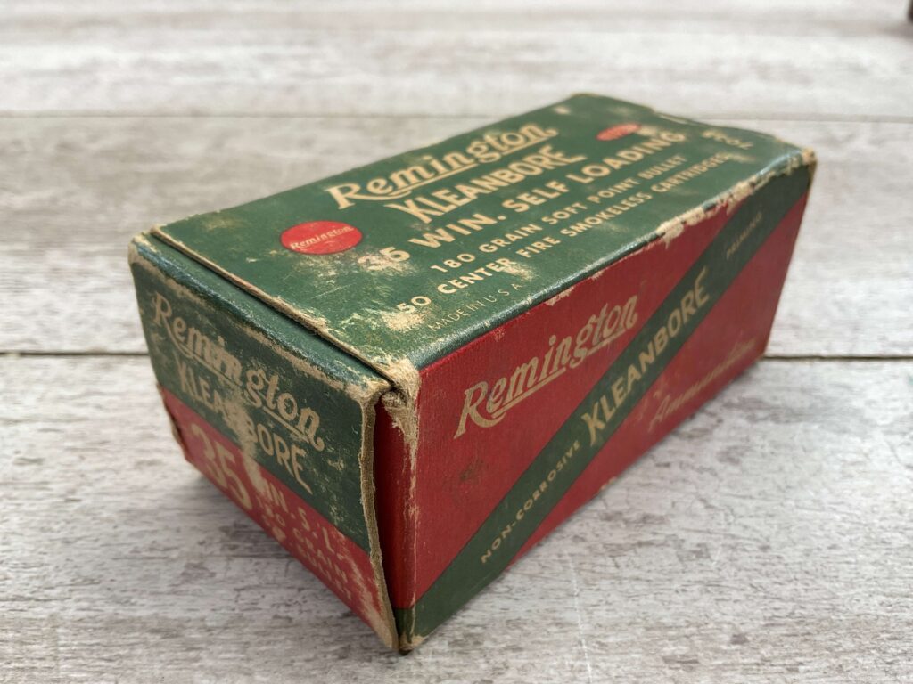 REMINGTON 35 WIN. SELF LOADING AMMUNITION, EXC CONDITION, 180 GRN SOFT POINT, 1950 VINTAGE, BOX SHOWS PAINT WEAR, BOX IS IN VERY GOOD CONDITION, FULL BOX 50 RDS.