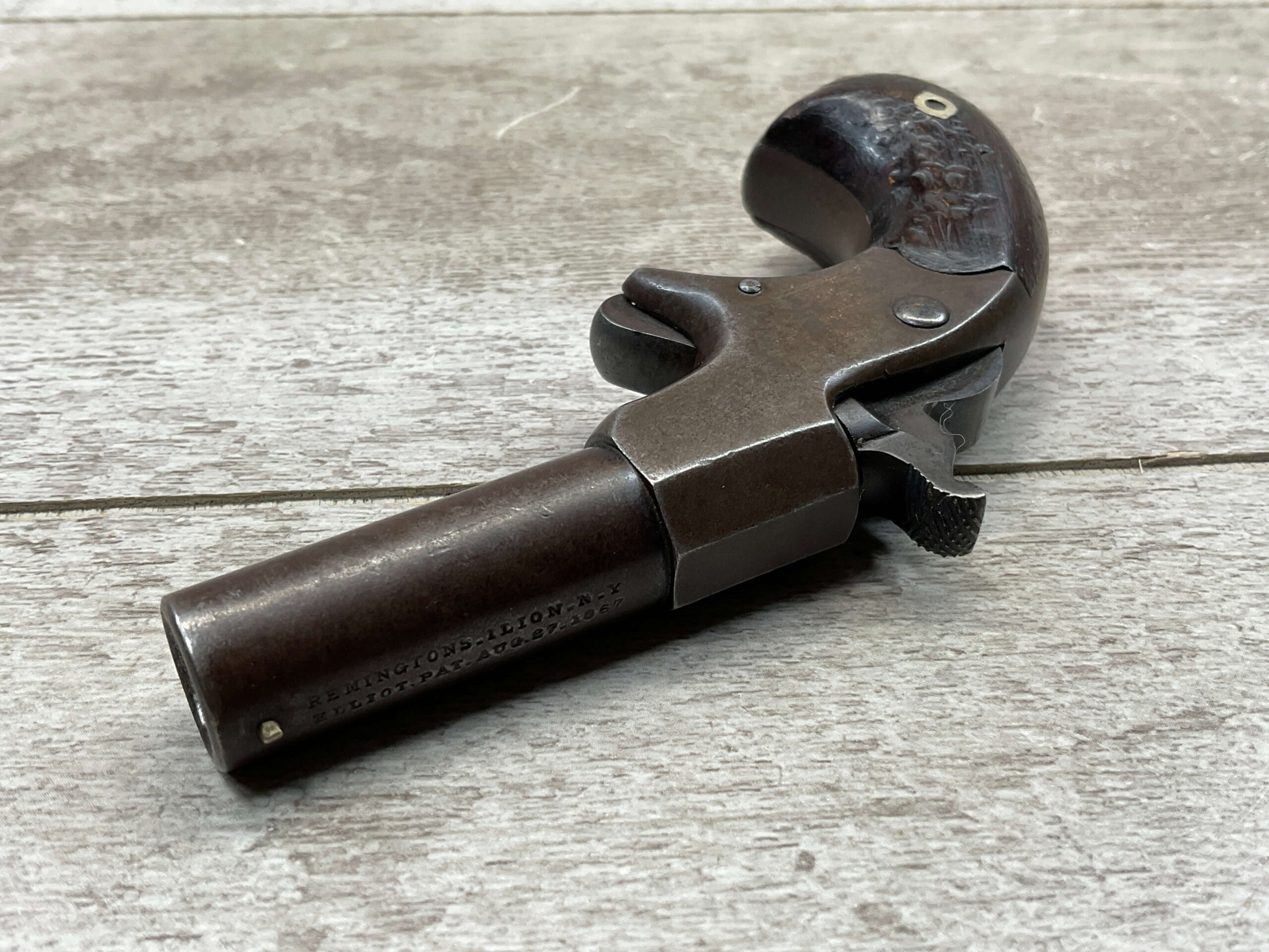 REMINGTON ELLIOT .41RF DERRINGER SINGLE SHOT PISTOL, ANTIQUE & RARE #3748, .41 RIMFIRE, GOOD BORE & RIFLING, FINISH HAS TURNED BROWN PATINA, ALL MATCHING, LEFT GRIP SHOWS WEAR & SMALL PIECE MISSING, SPUR TRIGGER, CASE COLOR HAMMER W/ REAR SIGHT BUILT IN, BARREL MARKED “REMINGTONS, ILION, N.Y. ELLIOT PAT. AUG. 27, 1867”, TIGHT ACTION, STRONG SPRINGS, NOT A REPRODUCTION, OVERALL CONDITION AS SEEN IN PHOTOS