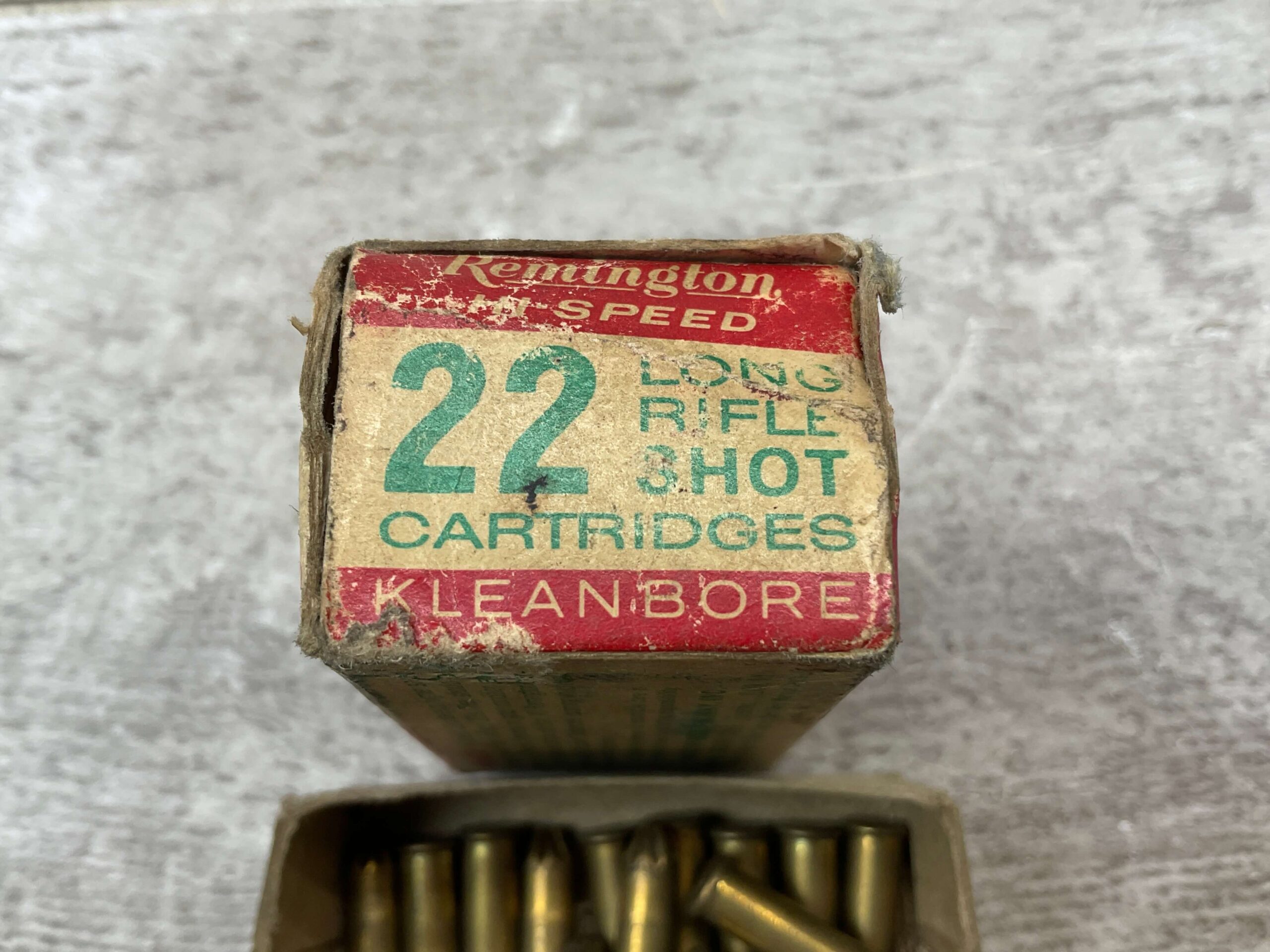 REMINGTON .HI-SPEED .22LR SHOT AMMO, KLEANBORE INDEX 9322, QTY 14, VINTAGE, BOX HAS SOME DISCOLORATION AND BREAKAGE, BUT IS IN GOOD CONDITION FOR AGE AND STILL DISPLAYS WELL.