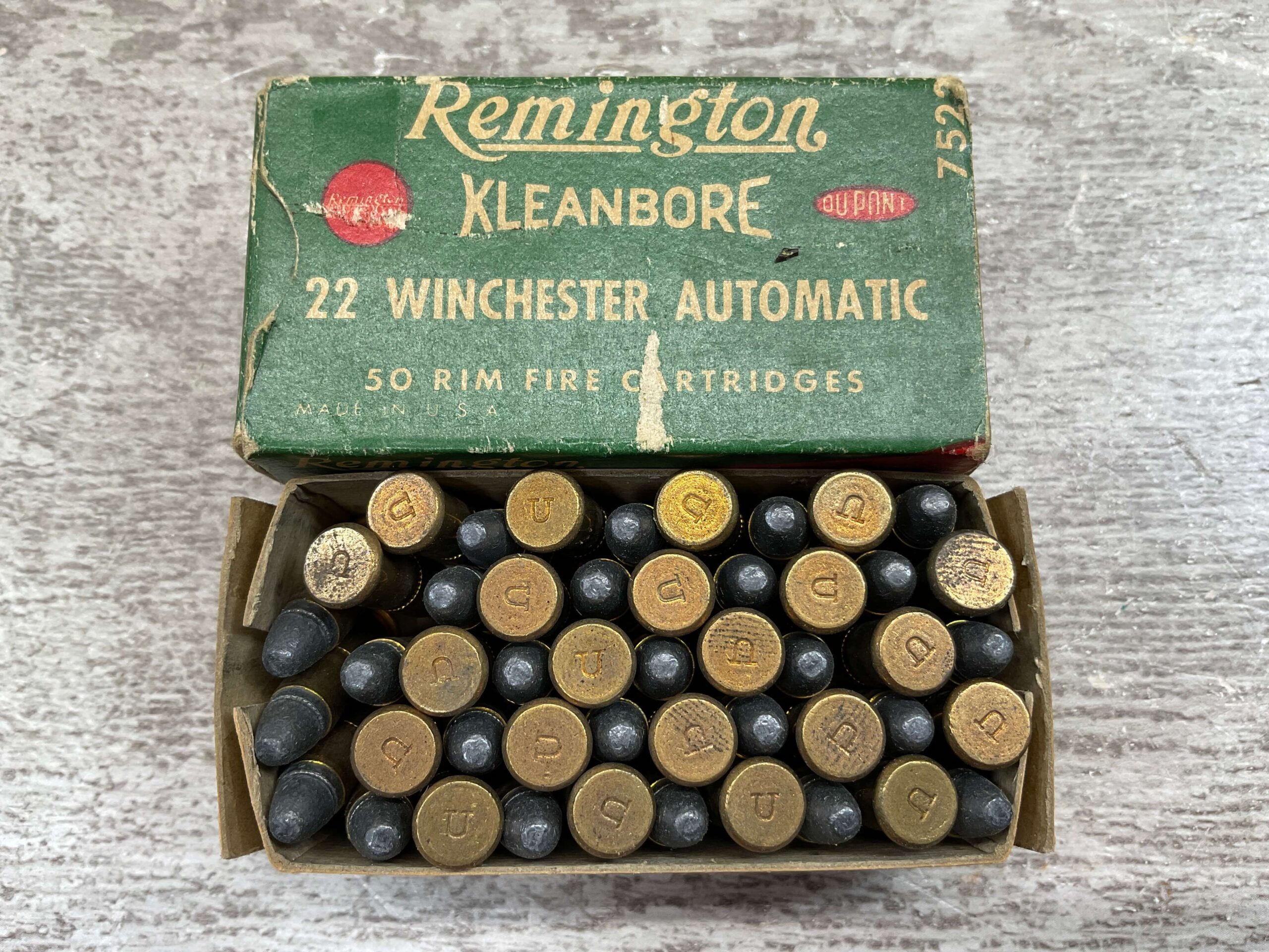 REMINGTON KLEANBORE 22 WIN. AUTOMATIC AMMO, QTY 47, VINTAGE, BOX IS IN GOOD CONDITION FOR AGE, BACK OF BOX STAMPED “913 R26L”.