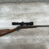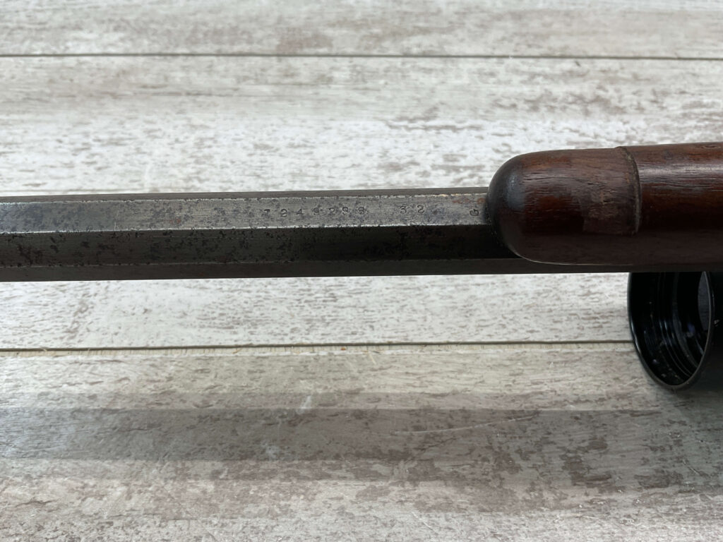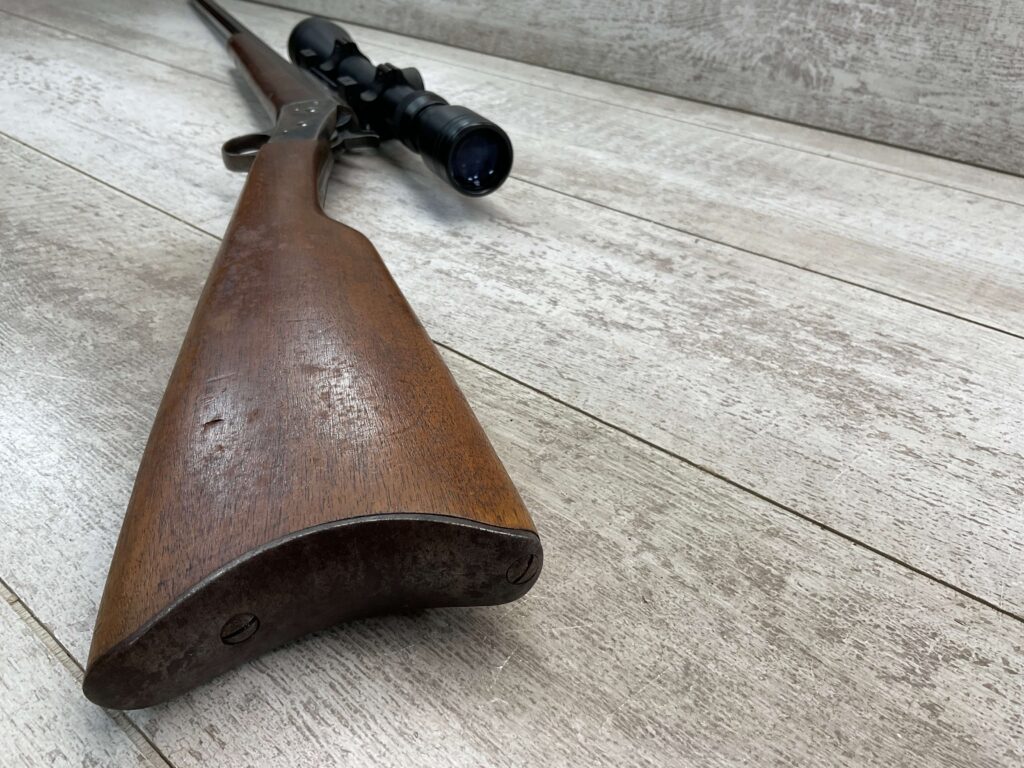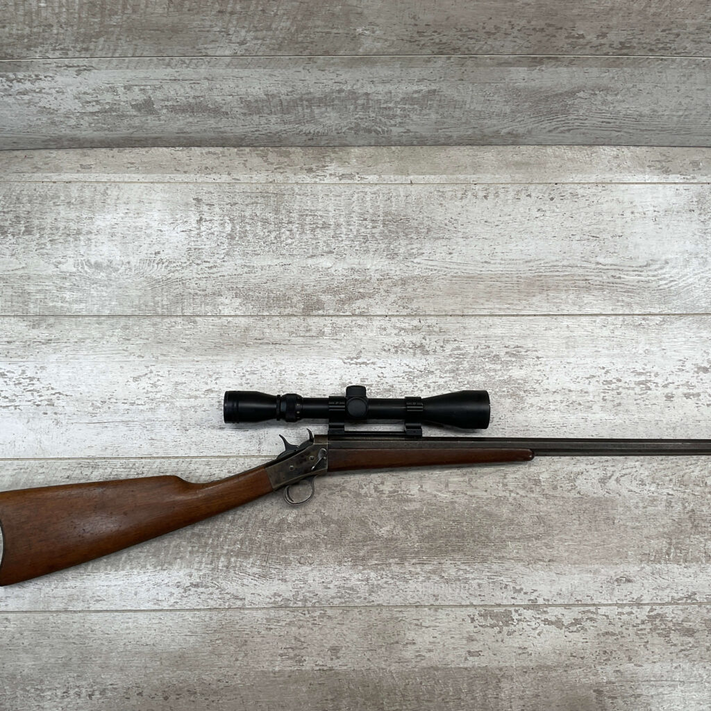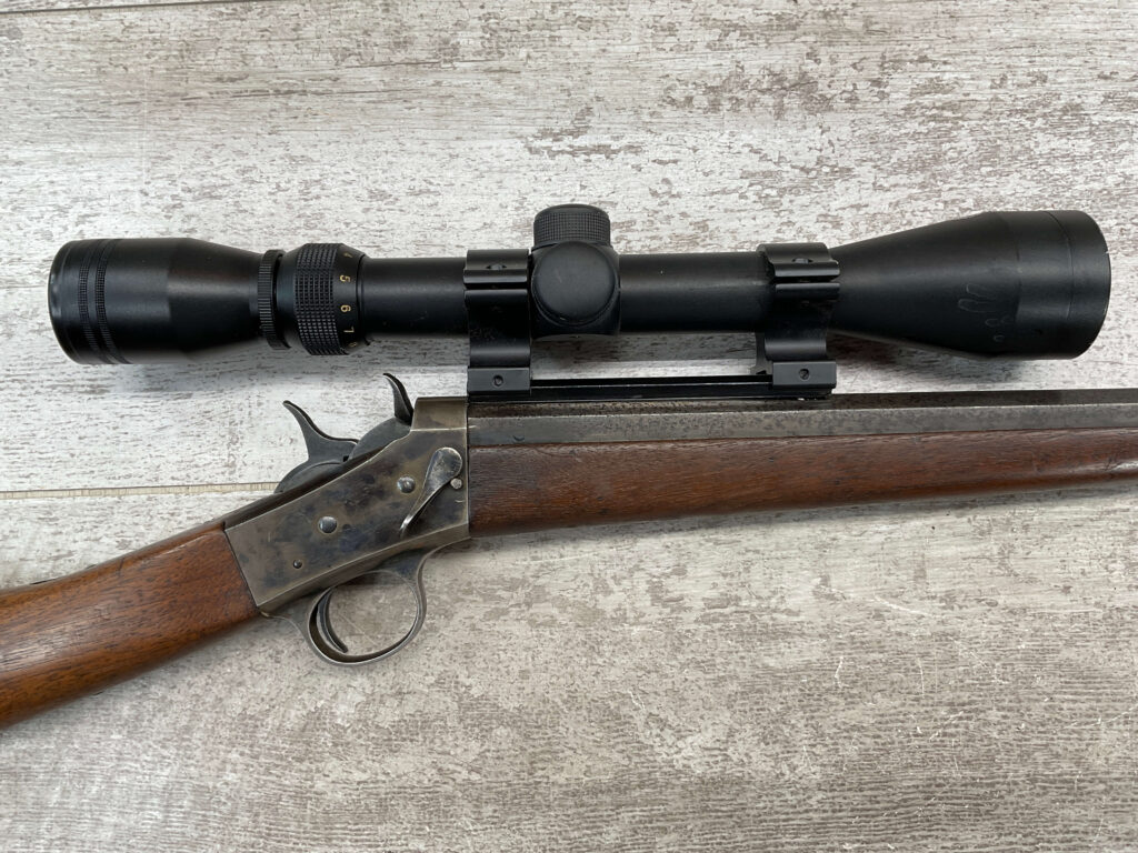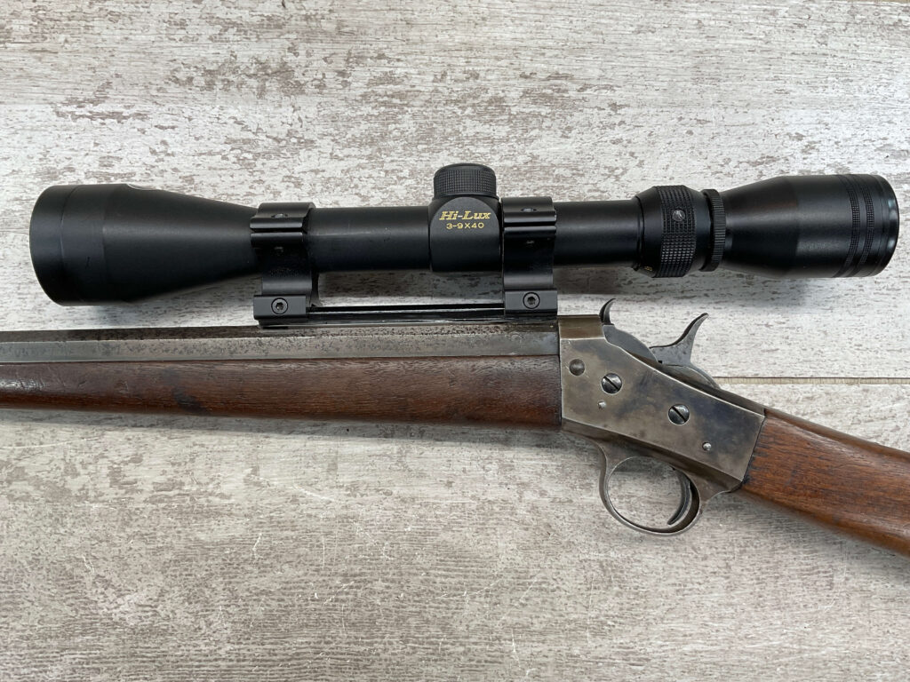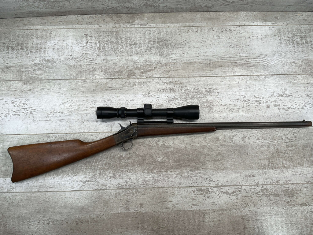 REMINGTON MODEL 4 TAKEDOWN ROLLING BLOCK .17 MACH 2 SINGLE SHOT RIFLE W/SCOPE #NSA, 22 1/2″ OCTAGON BARREL, FROSTED BORE W/WEAK RIFLING, METAL HAS TURNED GREY/BROWN PATINA, WOOD IS APPROPRIATE FOR AGE & USE, SMOOTH ACTION, EXTRACTOR FUNCTIONS, SMOOTH ACTION, HI-LUX 3-9X40 SCOPE, DOES FIRE & IS PRETTY ACCURATE!