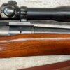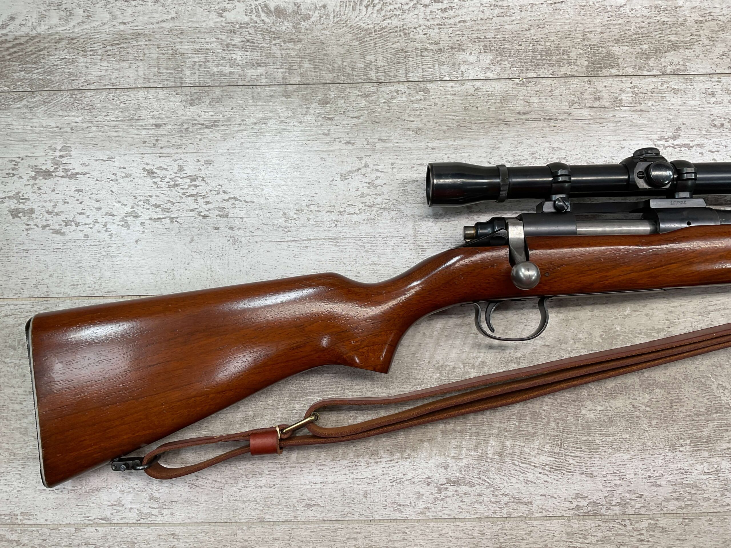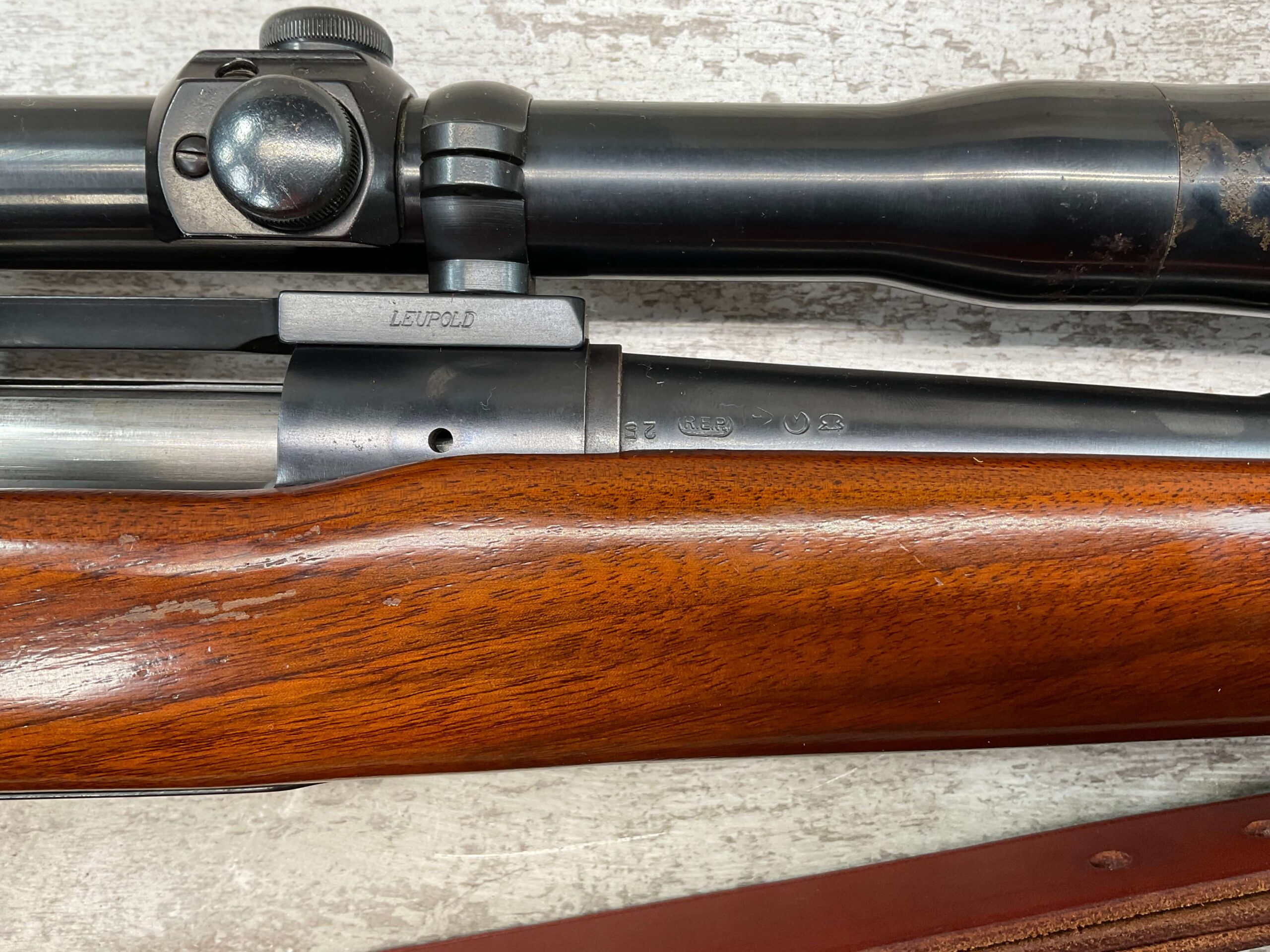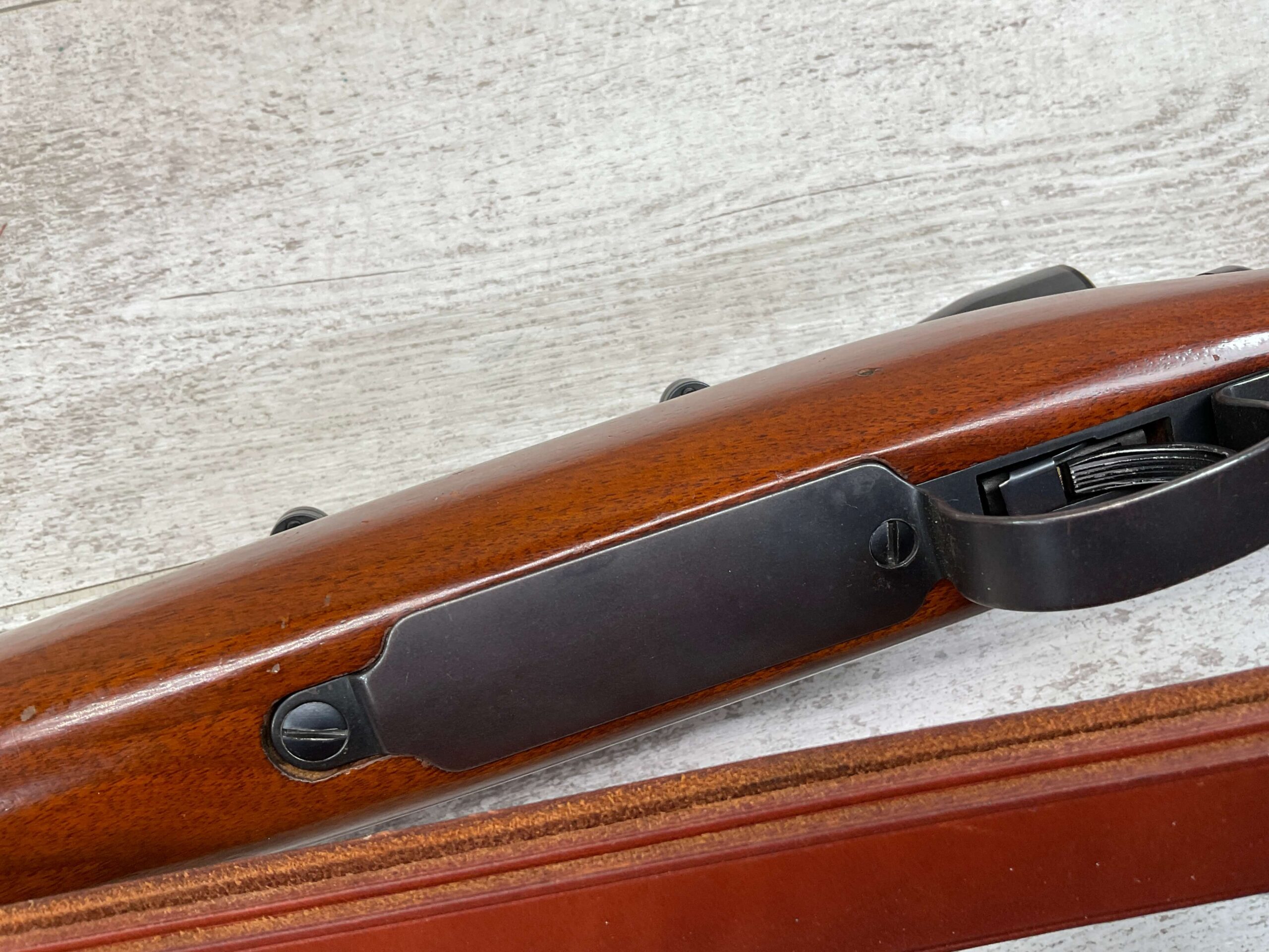 REMINGTON MODEL 722 .222 CAL BOLT ACTION RIFLE W/SCOPE #305000, 26″ ROUND BARREL, EXC BRIGHT MIRROR BORE & RIFLING (10/10), FRONT & REAR SIGHTS REMOVED, EXC WALNUT STOCK W/VERY FEW DINGS, EXC ORIGINAL BLUE, LATAGO SLING, LEUPOLD SCOPE MOUNT, VINTAGE WEAVER K-4 SCOPE W/LITSCHERT ATTACHMENT, GLASS BEDDED BY BOB HOLMES, 1953 MFR, ORIGINAL REMINGTON PLASTIC BUTT PLATE, A REAL TACK DRIVER, 95+% OVERALL