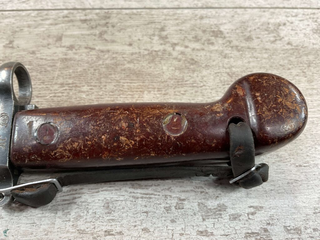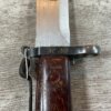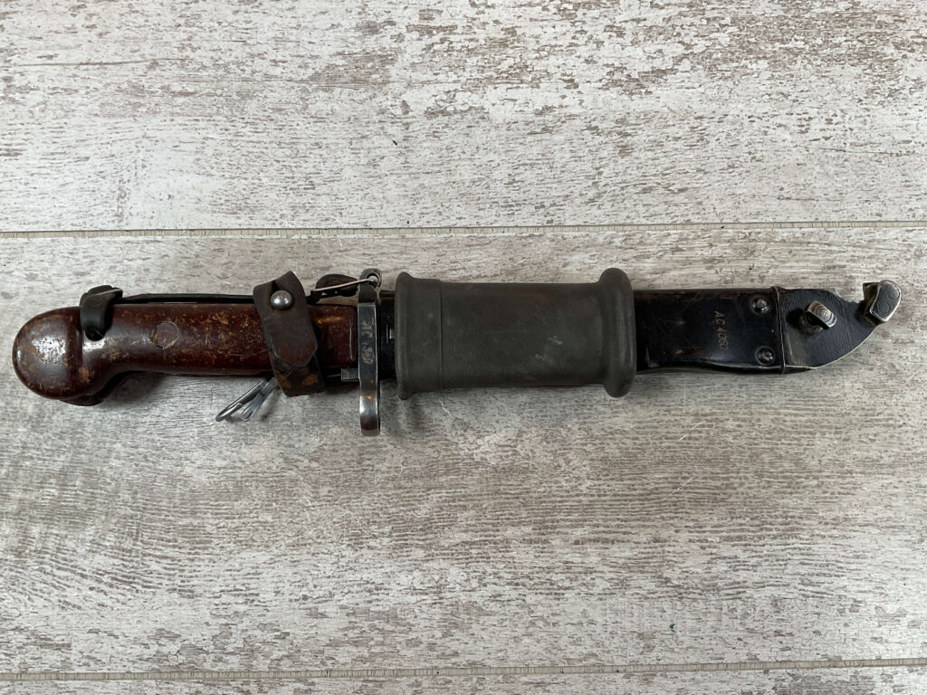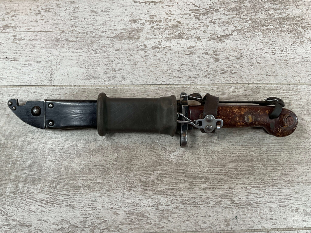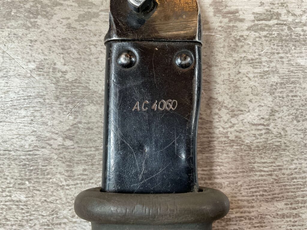 THE ONE-PIECE MOLDED PLASTIC GRIP & POMMEL; AND STAINLESS STEEL BLADE MADE THE BAYONET IMPERVIOUS TO RUST AND ROT. THE UNFULLERED CLIP-POINT BLADE HAD SAWTEETH ALONG THE SPINE. THE STEEL SCABBARD BODY HAD A LUG AT THE POINT THAT ENGAGED A WINDOW CUT INTO THE BLADE, SO THAT BAYONET AND SCABBARD COULD BE COMBINED AS A WIRECUTTER. THE SCABBARD BODY HAD A RUBBER INSULATOR, MAKING IT SAFE TO CUT ELECTRIFIED WIRE.