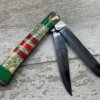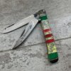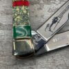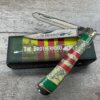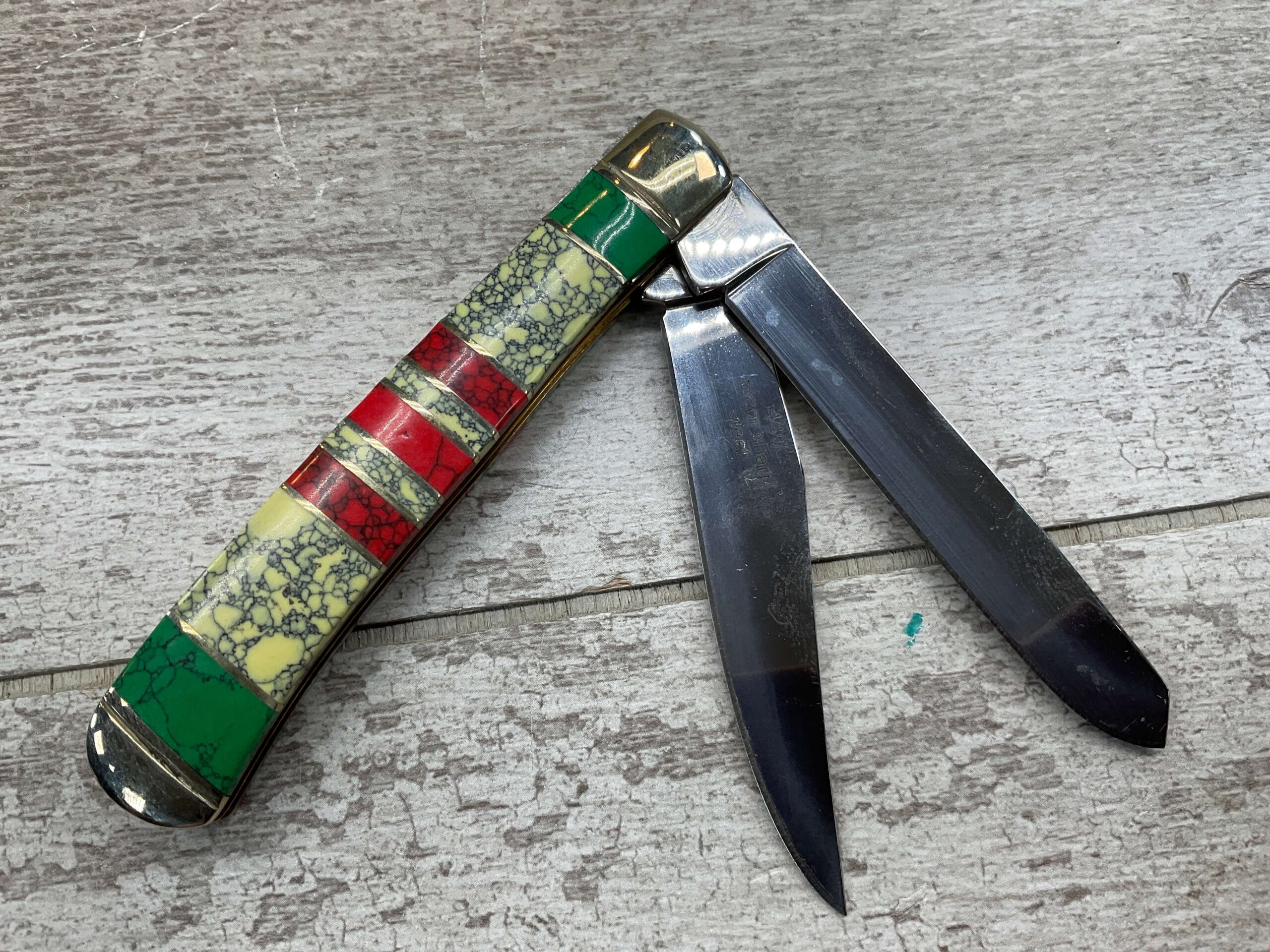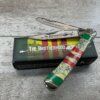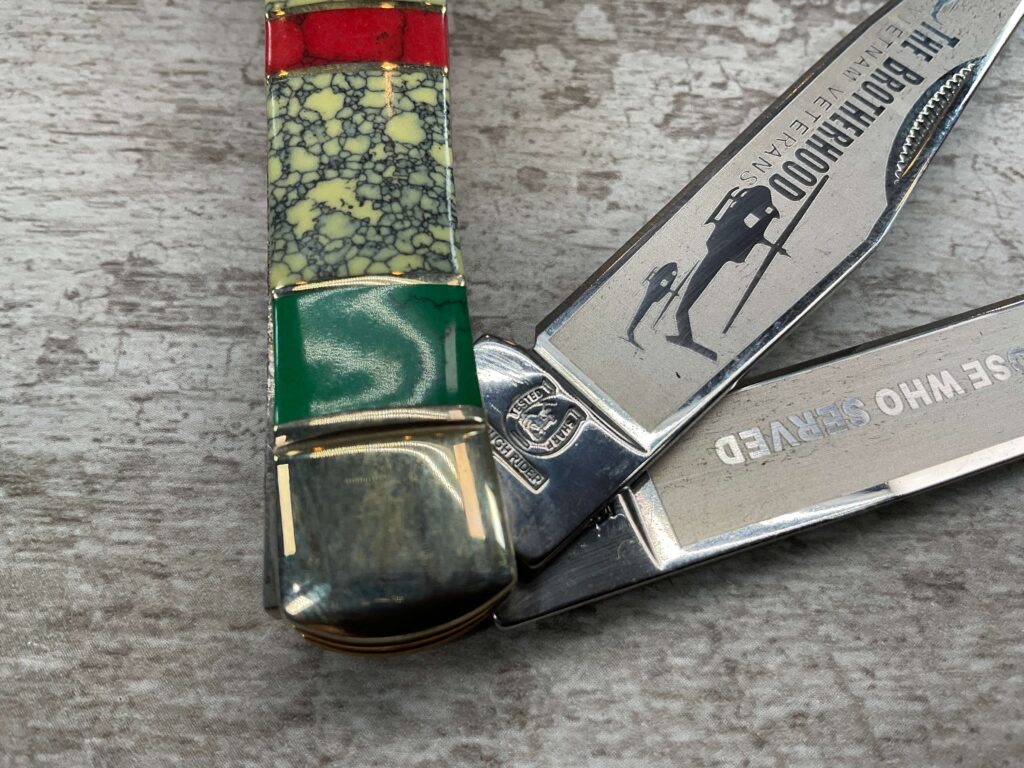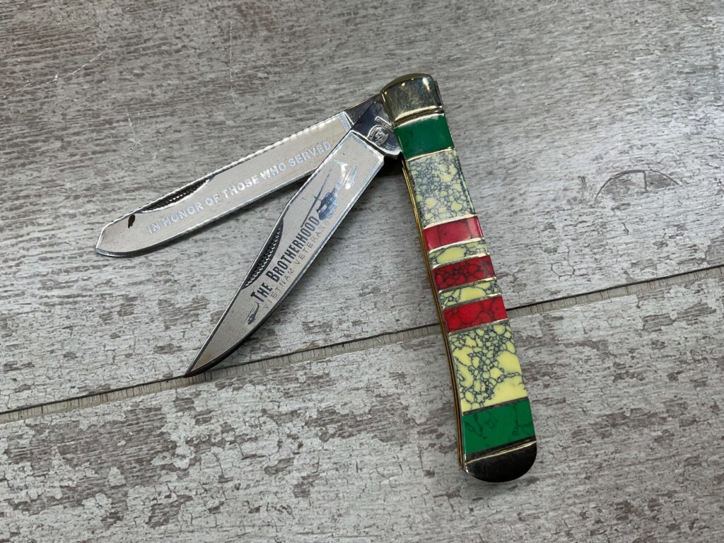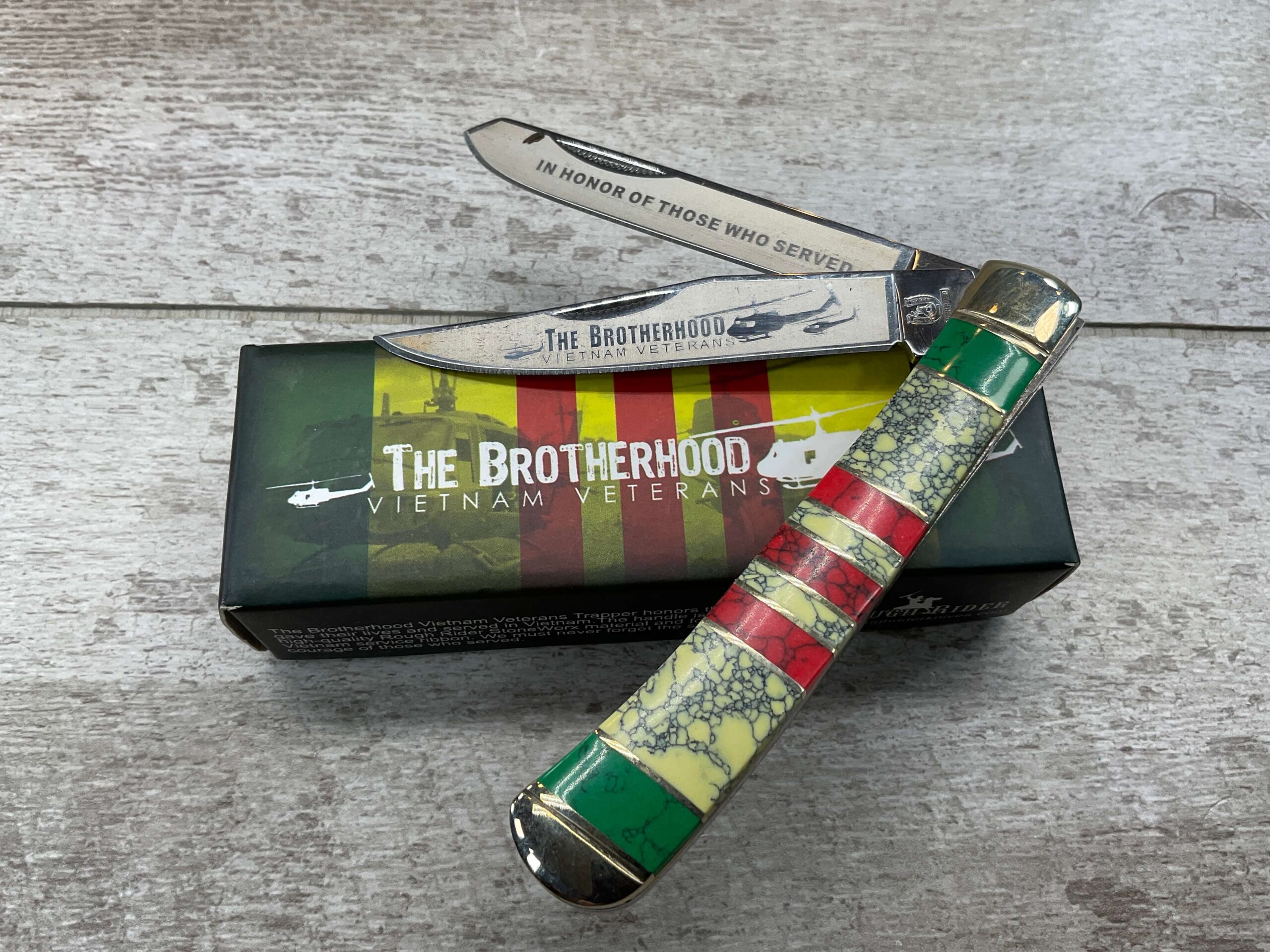 THE ROUGH RIDER ROUGH RIDER VIETNAM BROTHERHOOD TRAPPER FEATURES IMITATION TURQUOISE HANDLE AND 440A STAINLESS STEEL BLADES. SHOW YOUR SUPPORT AND GRAB ONE FOR YOURSELF OR A FRIEND TODAY. THIS KNIFE FEATURES 440A STAINLESS STEEL BLADES WITH REVERSE FROST ETCHES. STONEWORX YELLOW, GREEN AND RED IMITATION TURQUOISE HANDLE. BRASS LINERS. NICKEL SILVER RINGED BOLSTERS AND SPACERS. BLADE ETCHINGS: CLIP POINT BLADE ETCH: THE BROTHERHOOD VIETNAM VETERANS SPEY BLADE ETCH: IN HONOR OF THOSE WHO SERVED. 3-1/8″ CLIP POINT AND SPEY BLADE. BLADE THICKNESS: 1/16″. BLADE WIDTHS: 1/2″. 4-1/8″ CLOSED.