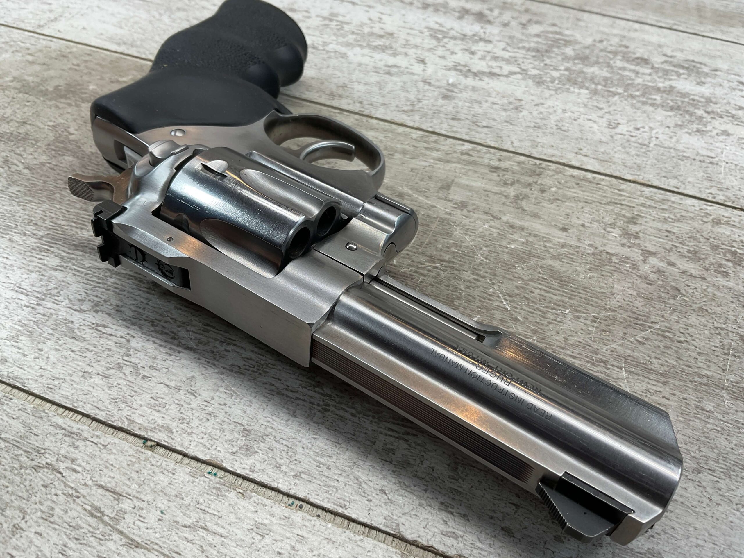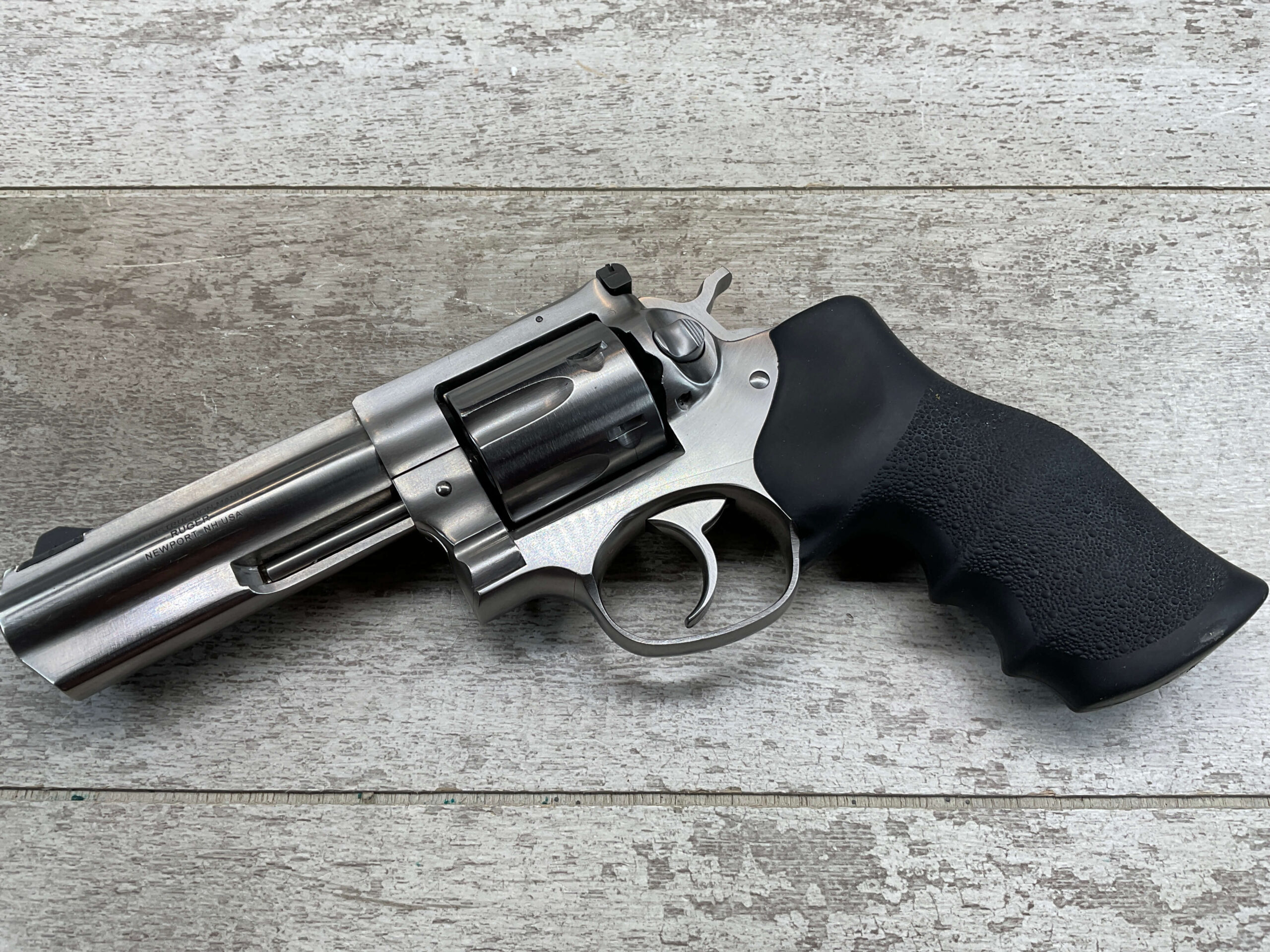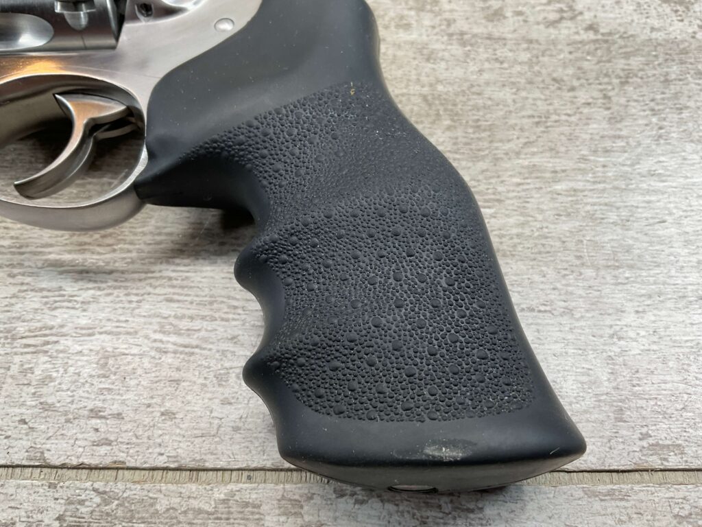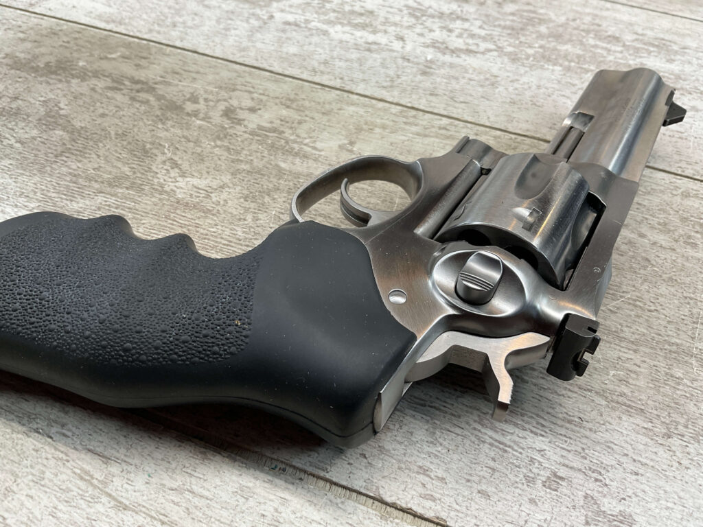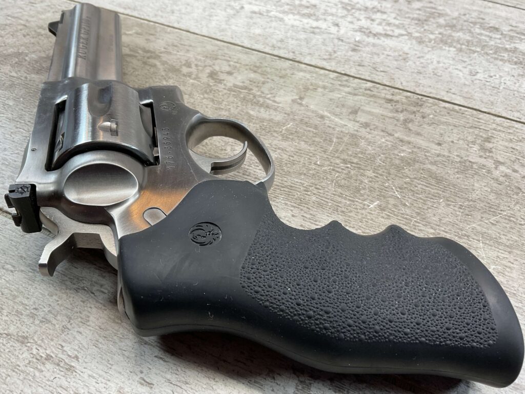 RUGER GP100 .357MAG STAINLESS STEEL REVOLVER #176-35943, 2012 MFR, DOUBLE ACTION, EXC BLACK HOGUE MONO GRIPS, 95%+ STAINLESS STEEL FINISH W/LIGHT USE MARKS, 4.2″ BARREL, 6-RD, ADJ REAR SIGHT, TRIPLE LOCKING CYLINDER, EXC BORE & RIFLING, 95%+ OVERALL
