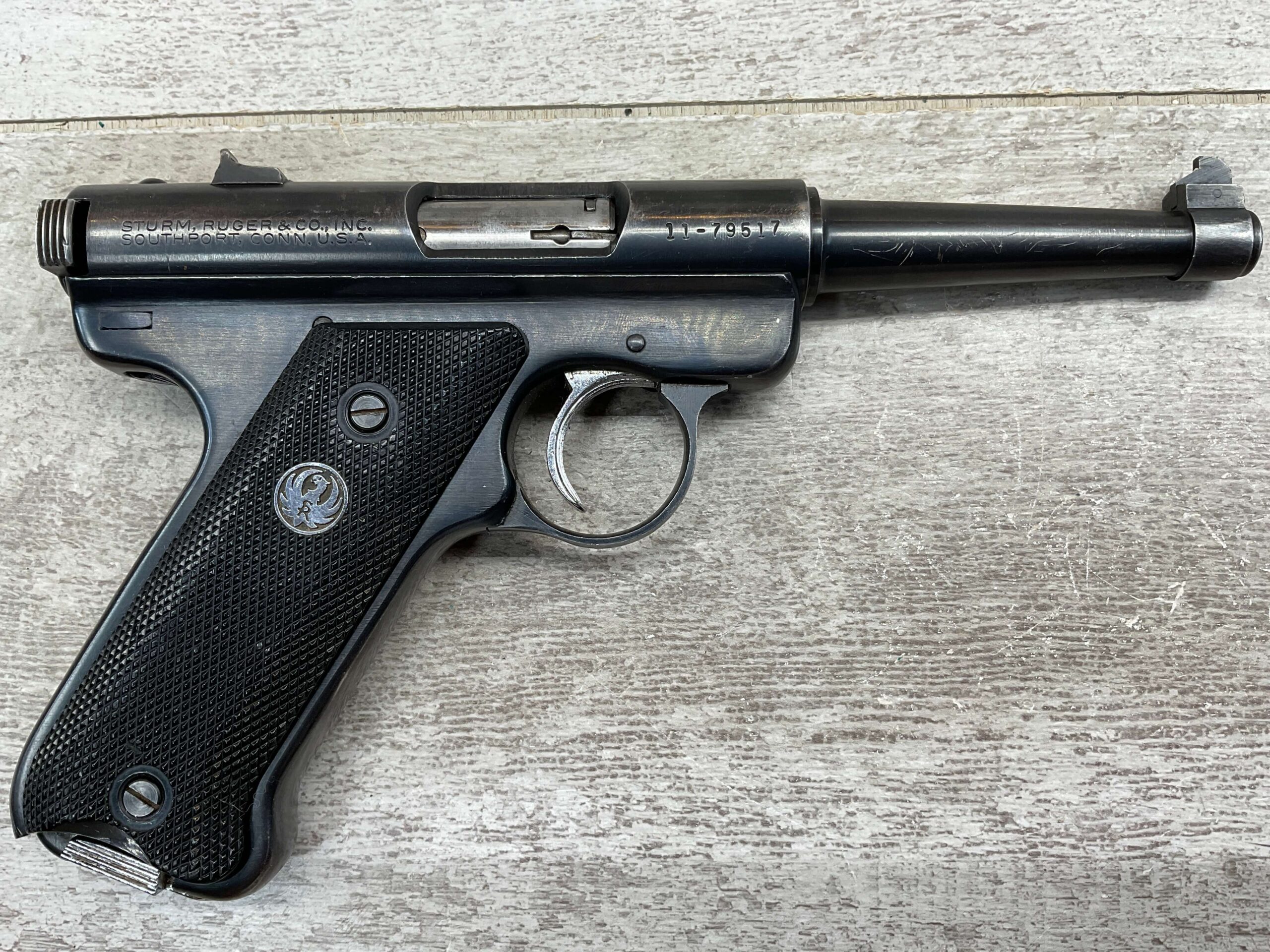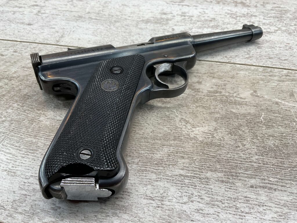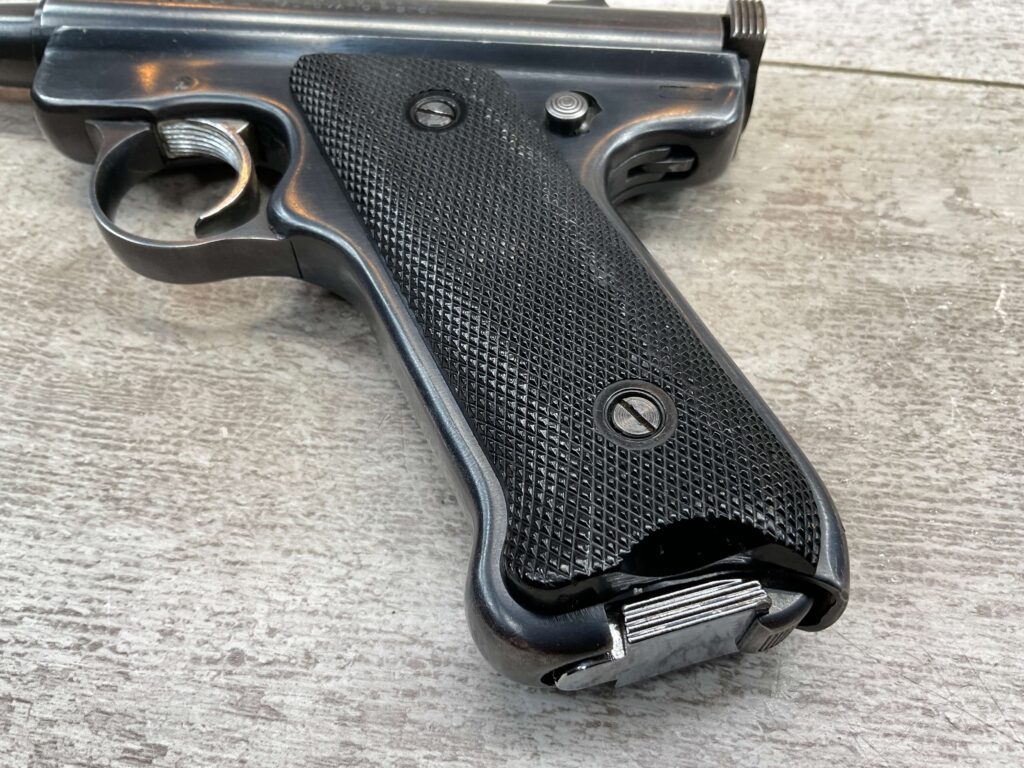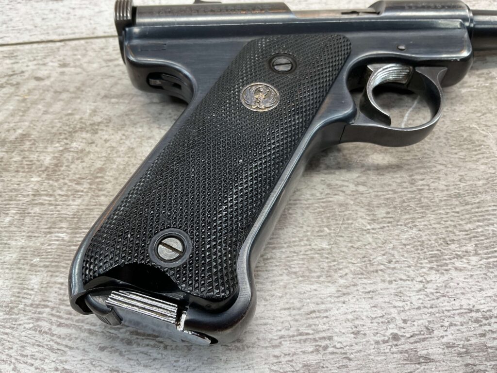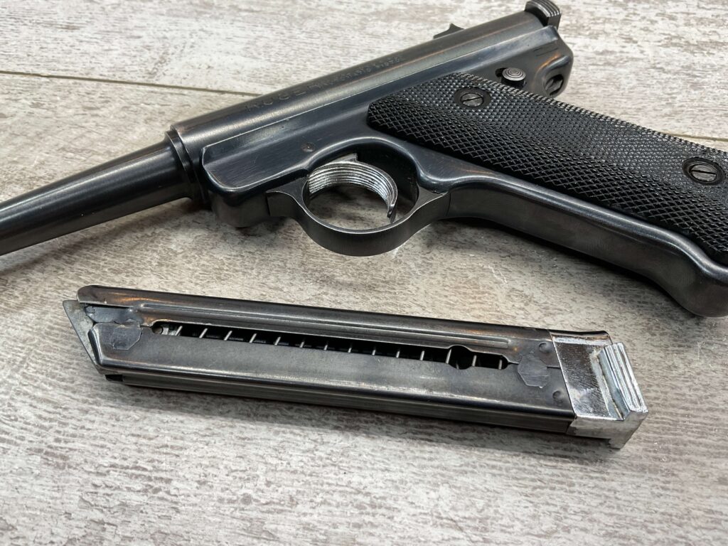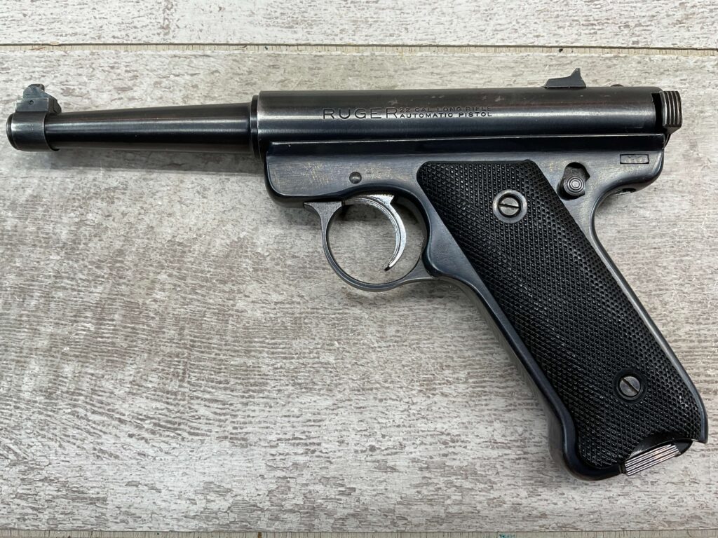RUGER MARK I STANDARD 4 3/4″ PENCIL BBL 22LR PISTOL #11-79517, 1973 MFR, VG-EXC BLUE W/LIGHT SCRATCHES FROM USE & HIGH EDGE WEAR, EXC CHECKERED GRIPS W/SILVER EAGLE ON RIGHT GRIP, 1 FACTORY MAGAZINES, SMOOTH ACTION, VG-EXC OVERALL & C&R ELIGIBLE!!