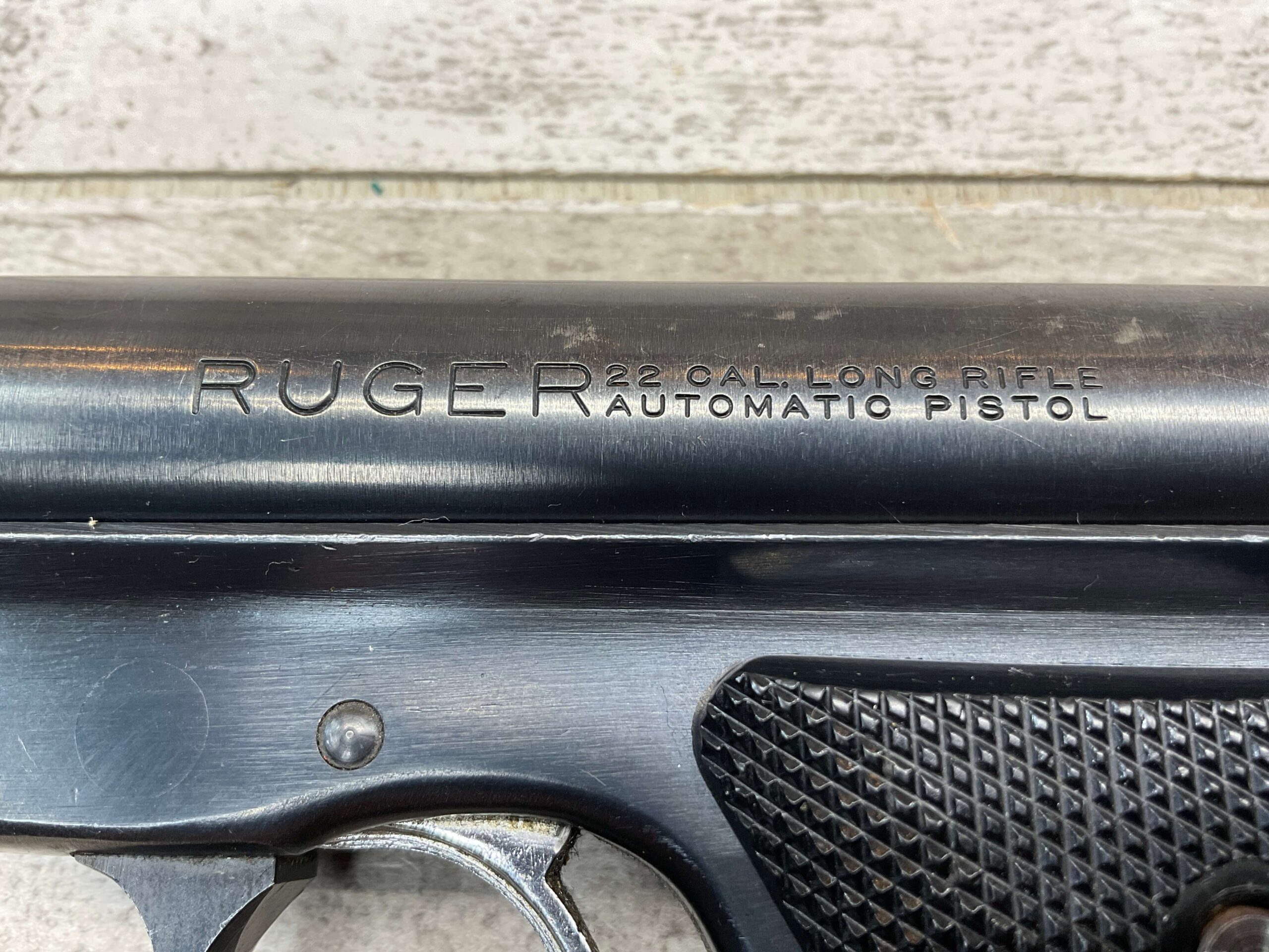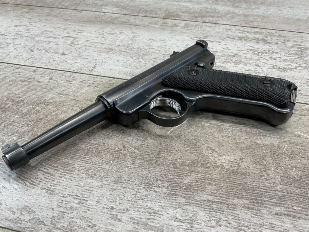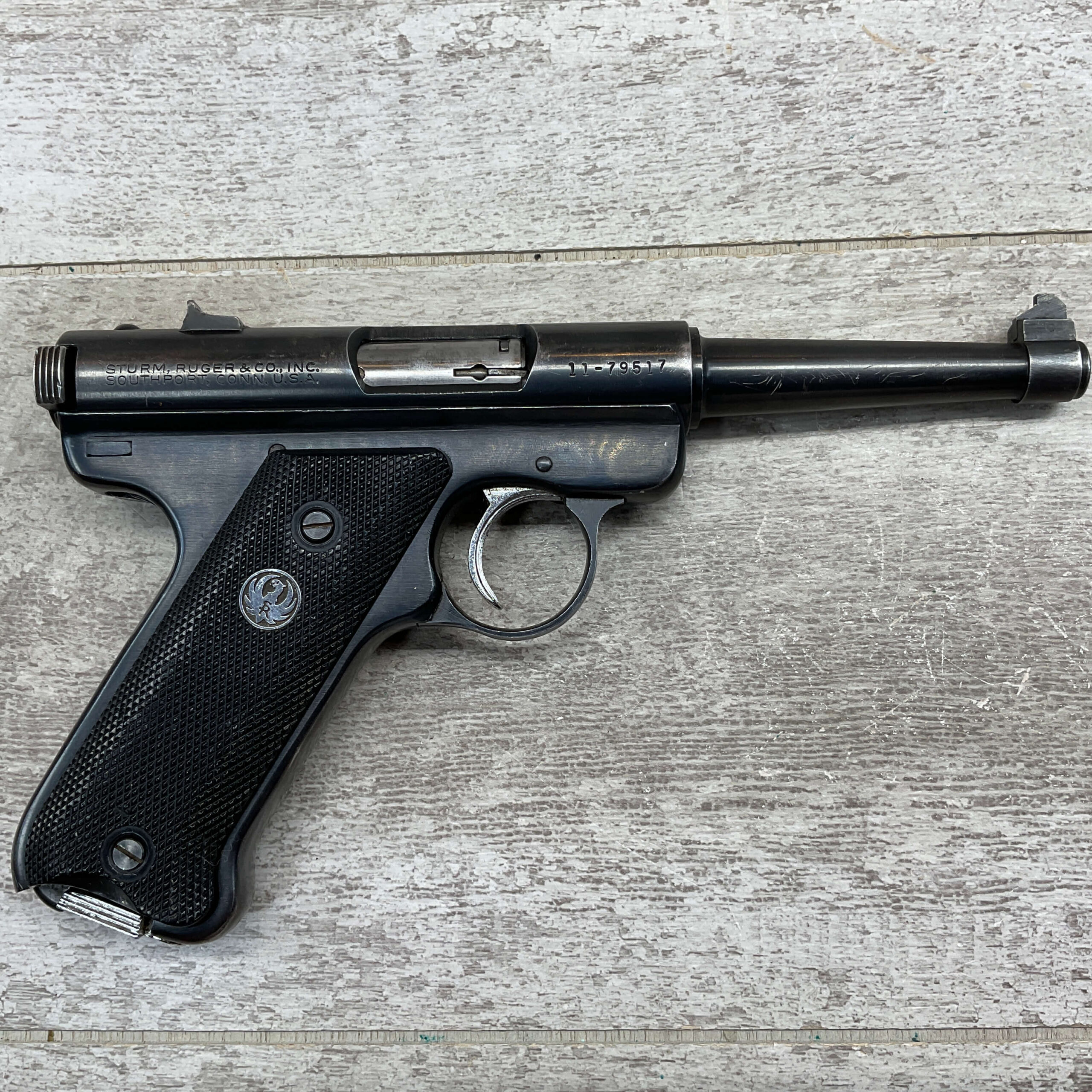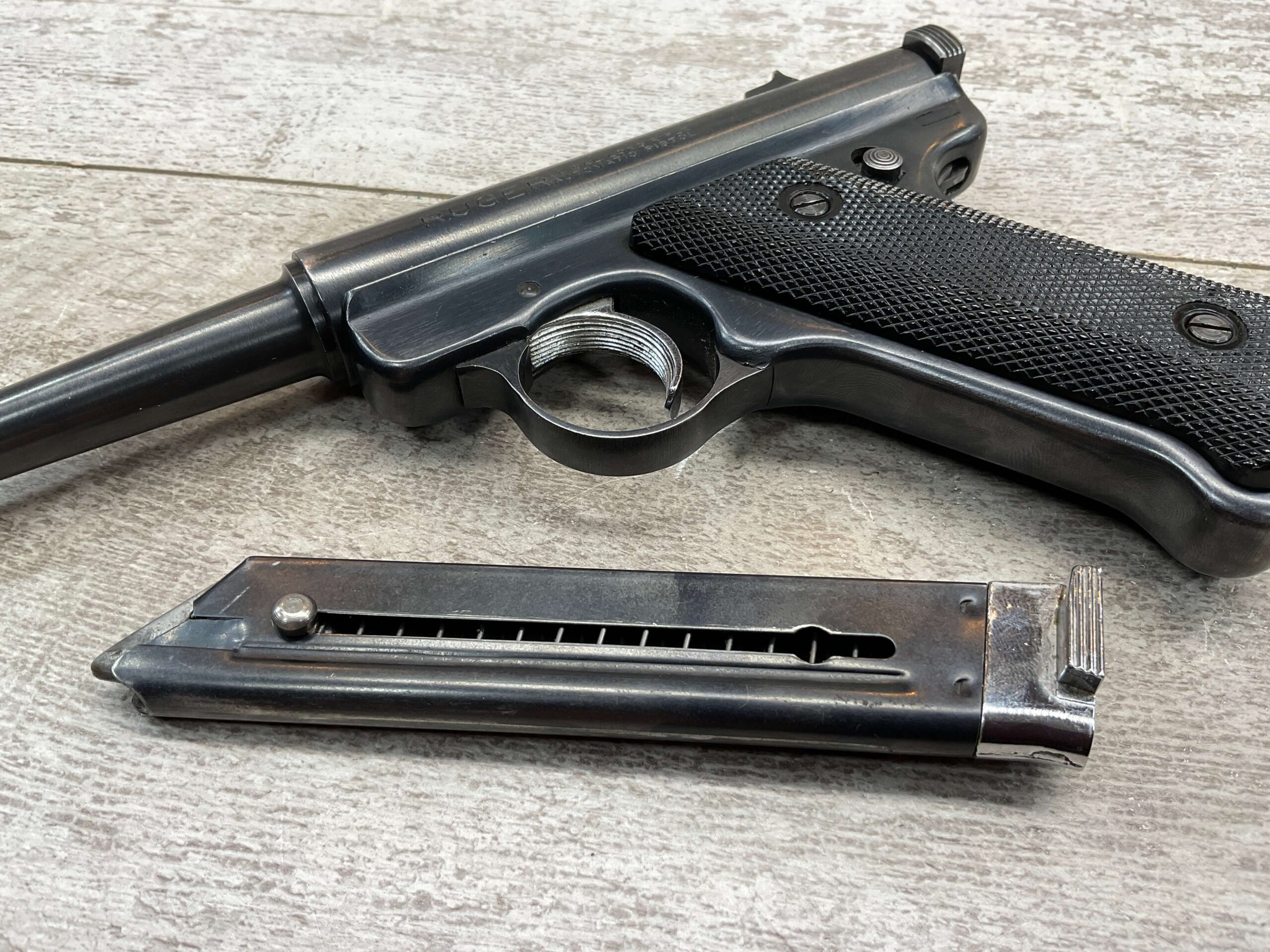 RUGER MARK I STANDARD 4 3/4″ PENCIL BBL 22LR PISTOL #11-79517, 1973 MFR, VG-EXC BLUE W/LIGHT SCRATCHES FROM USE & HIGH EDGE WEAR, EXC CHECKERED GRIPS W/SILVER EAGLE ON RIGHT GRIP, 1 FACTORY MAGAZINES, SMOOTH ACTION, VG-EXC OVERALL & C&R ELIGIBLE!!