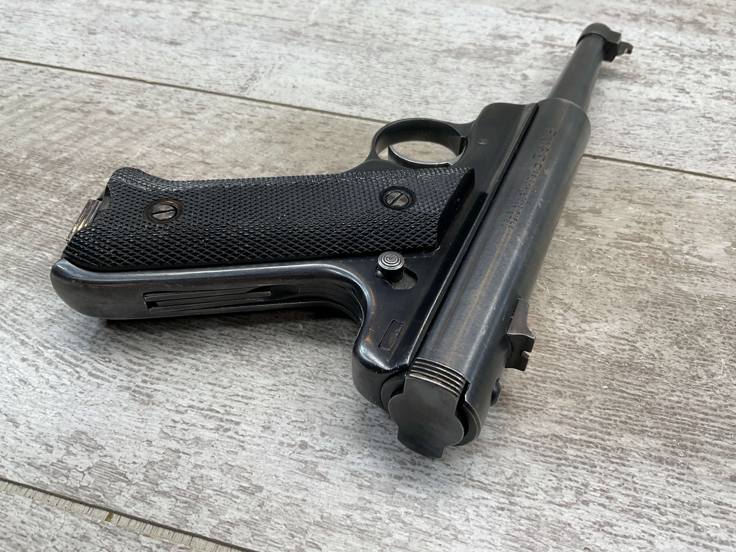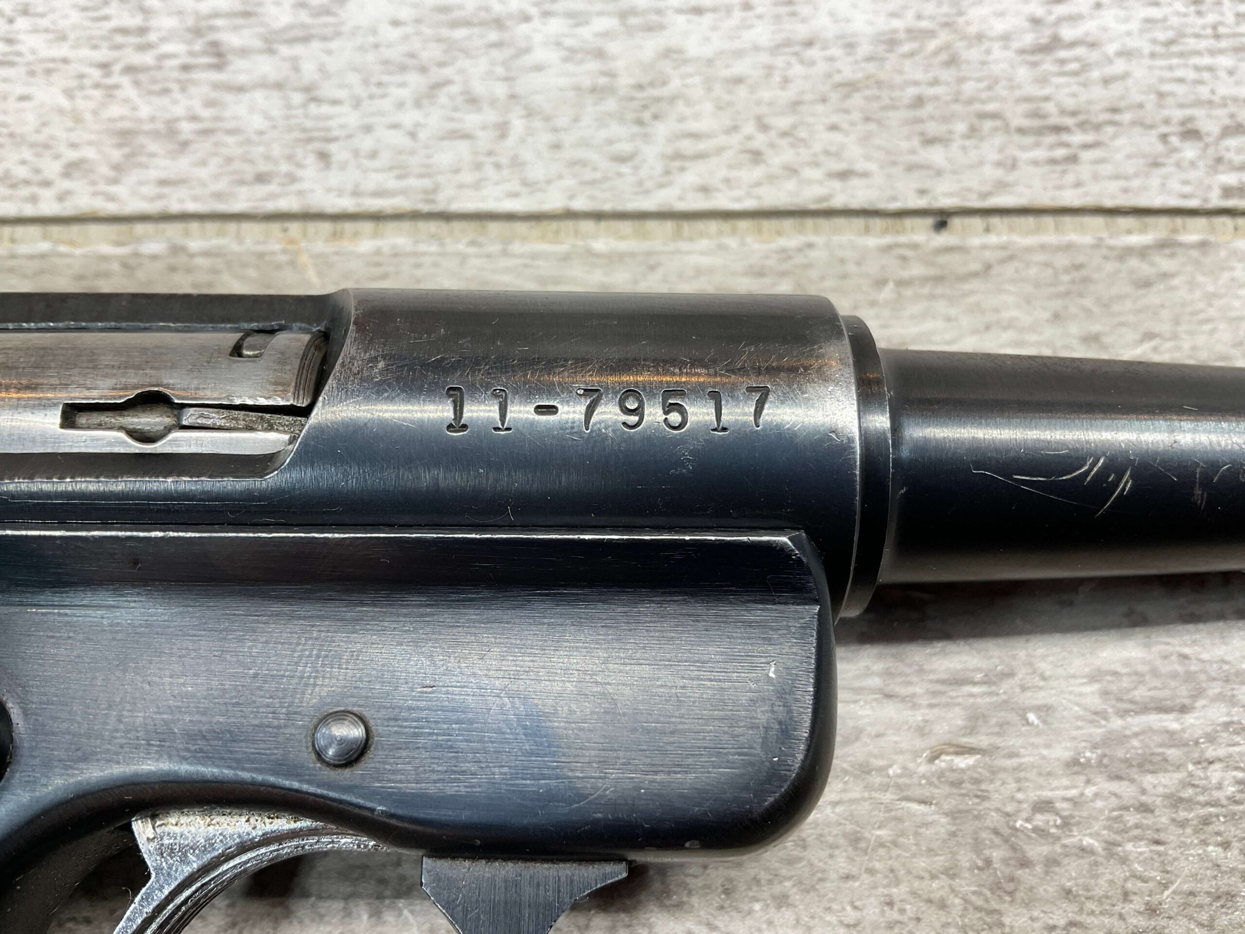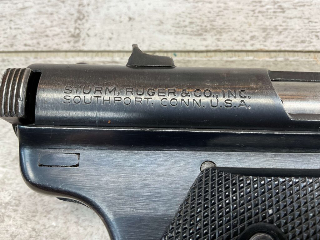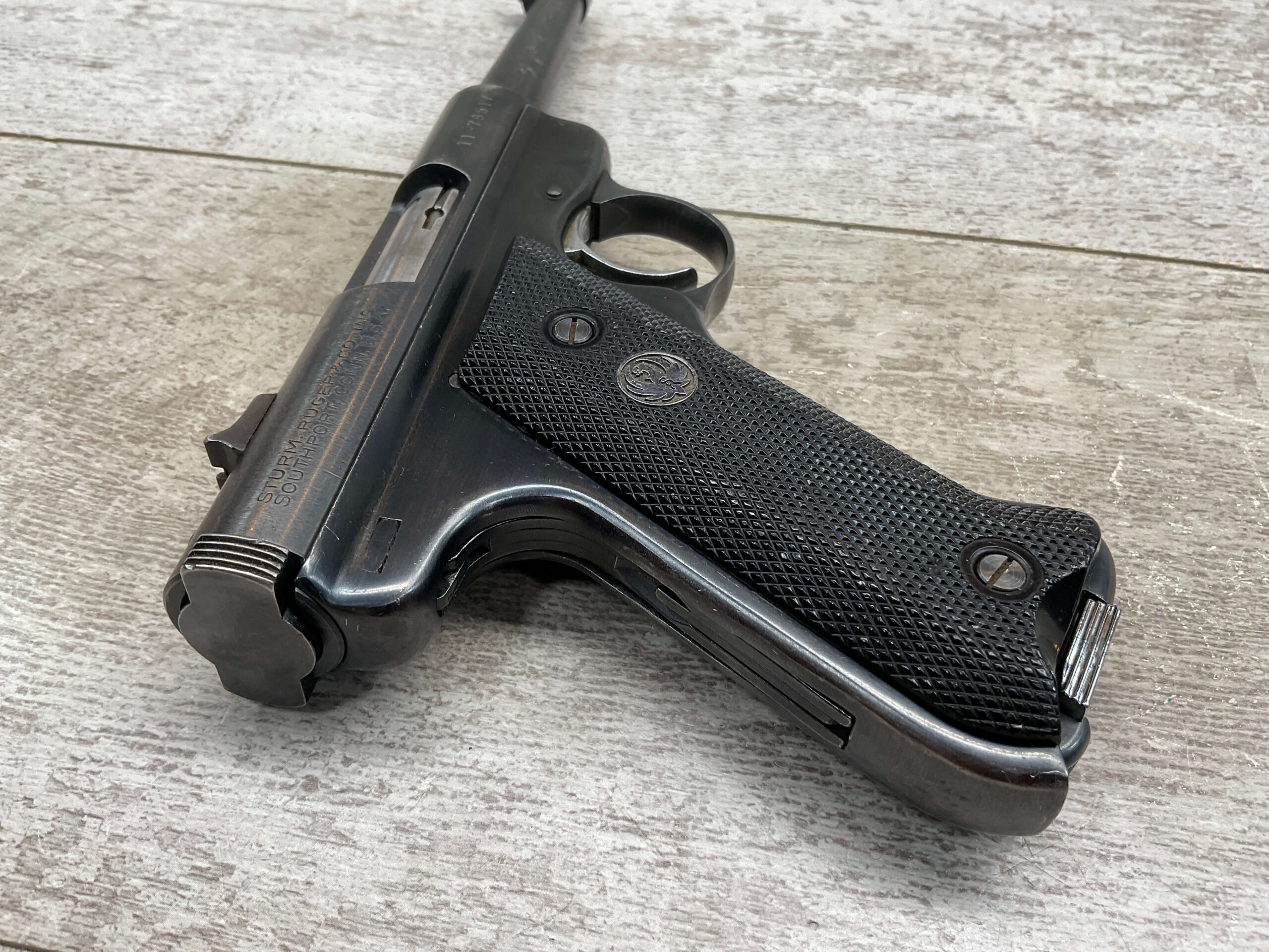 RUGER MARK I STANDARD 4 3/4″ PENCIL BBL 22LR PISTOL #11-79517, 1973 MFR, VG-EXC BLUE W/LIGHT SCRATCHES FROM USE & HIGH EDGE WEAR, EXC CHECKERED GRIPS W/SILVER EAGLE ON RIGHT GRIP, 1 FACTORY MAGAZINES, SMOOTH ACTION, VG-EXC OVERALL & C&R ELIGIBLE!!