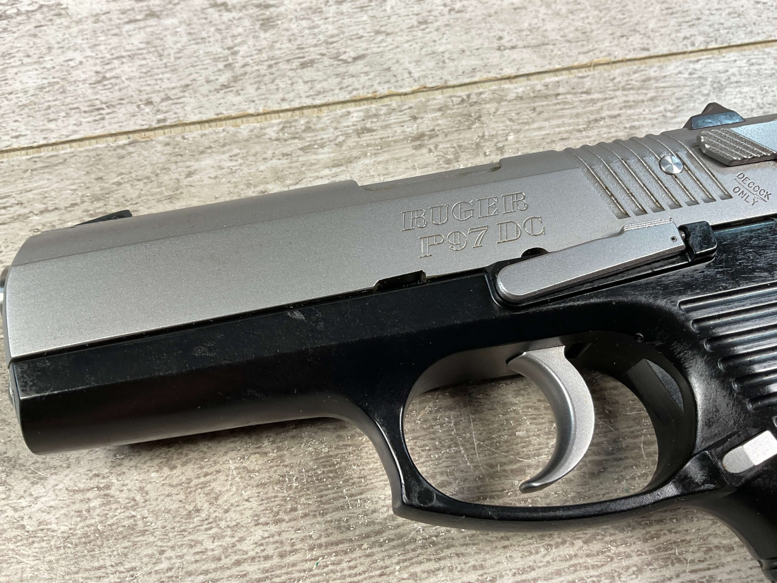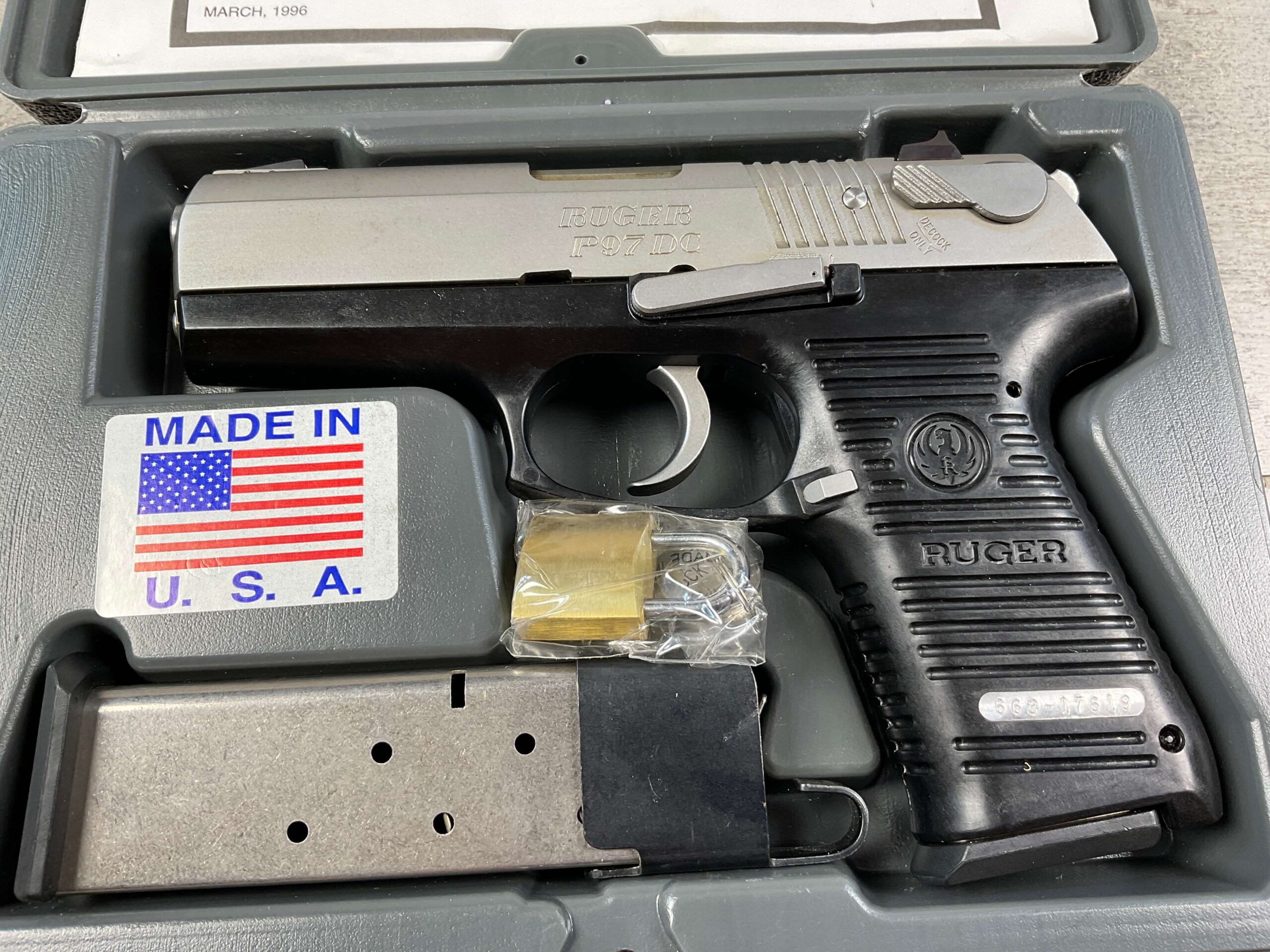 RUGER P97DC .45CAL SEMI AUTO PISTOL, IN BOX #663-17619, EXC STAINLESS SLIDE & BLACK POLYMER RECEIVER, EXC BORE & RIFLING, DECOCKER, PURCHASED IN 2000 NEW, 2 FACTORY SINGLE STACK MAGAZINES, LOADING TOOL, MANUAL, LOCK & PAPERWORK, LIKE NEW IN ORIGINAL BOX, CONDITION AS SHOWN IN PICTURES