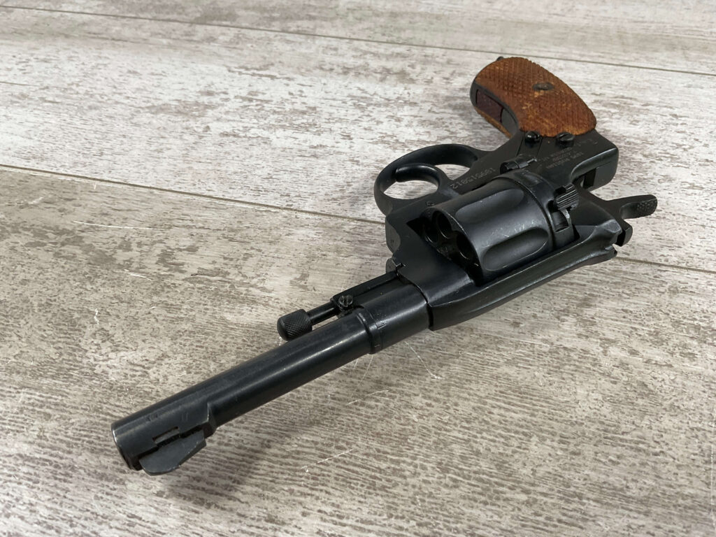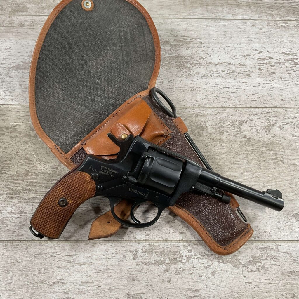 RUSSIAN NAGANT M1895 REVOLVER 1932 DATE TULA ARSENAL #25170, 7.62x38r, 4.5″ BARREL, CAI IMPORT MARKS ON RIGHT SIDE OF FRAME, FAIR BORE W/PITTING THROUGHOUT, GOOD RIFLING, VG-EXC ORIGINAL WALNUT CHECKERED GRIPS, LIGHT MUZZLE WEAR, MECHANICALLY EXCELLENT, LANYARD LOOP, RUSSIAN PEBBLE HOLSTER ARTIFICIAL KIRZA LEATHER DATED 1965/LEATHER BELT LOOPS/CLOSURE STRAP/SPARE AMMO POUCH/CLEANING ROD INCLUDED, 90+% OVERALL