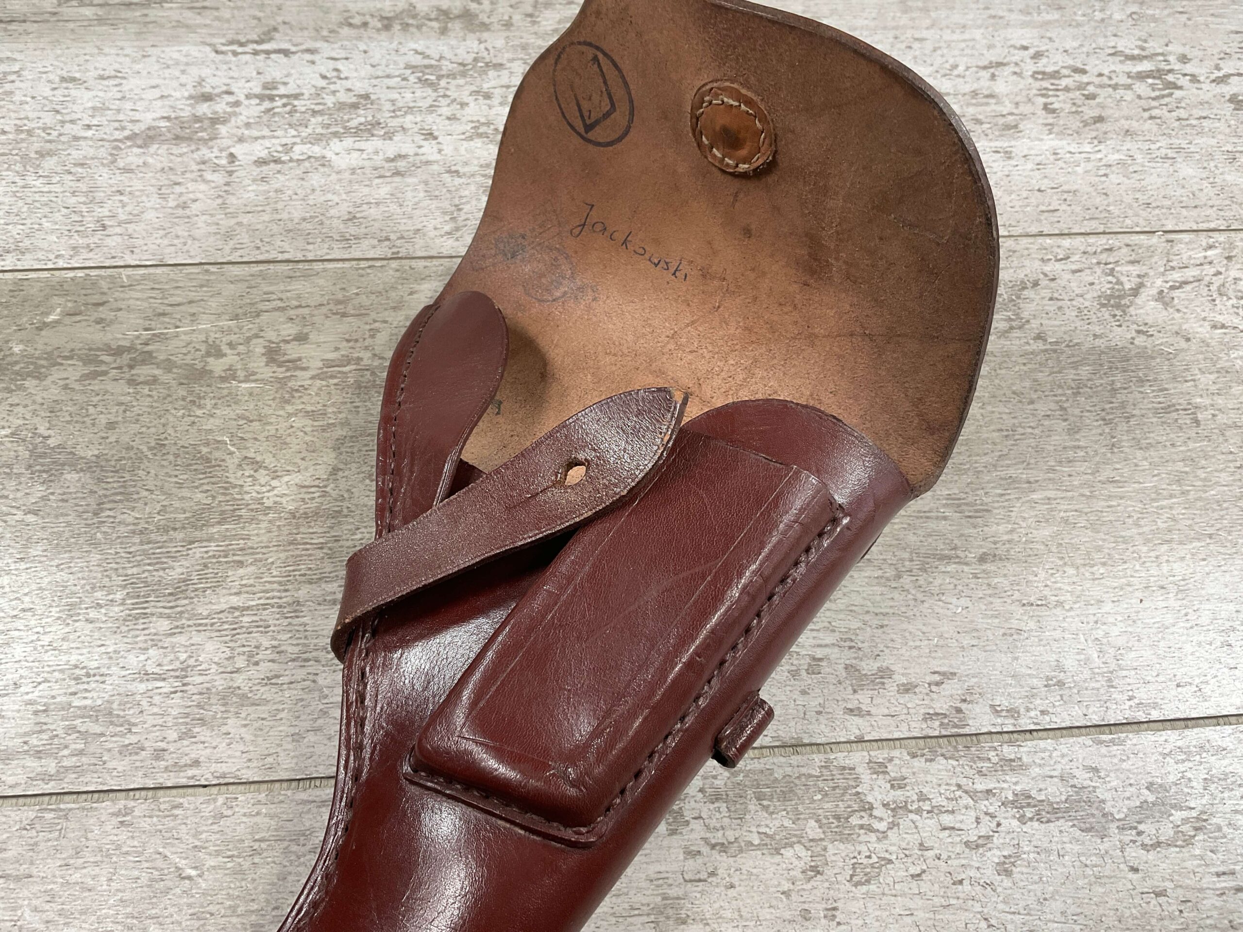 RUSSIAN TT-33 BROWN HOLSTER , “JACKOWSKI” HAND WRITTEN INSIDE UNDER THE FLAP, MULTIPLE STAMPS INSIDE INDER FLAP AS WELL, METAL D RINGS FOR ATTACHING TO SHOULDER STRAP, CLEANING ROD LOOPS, EXC STITCHING AND OVERALL CONDITION