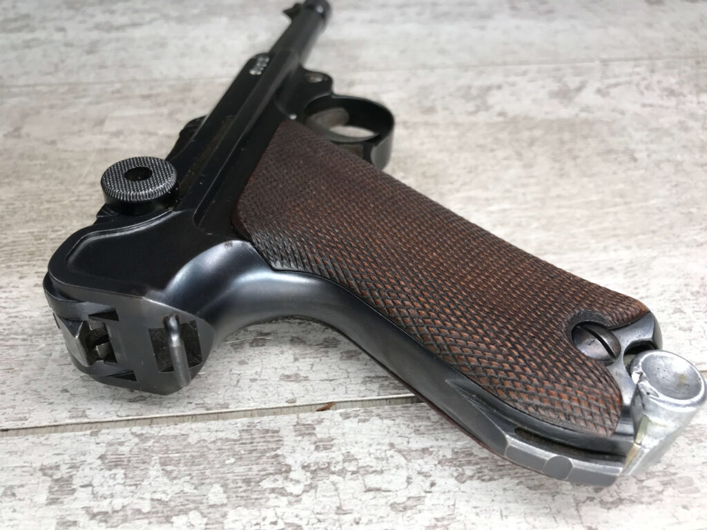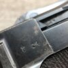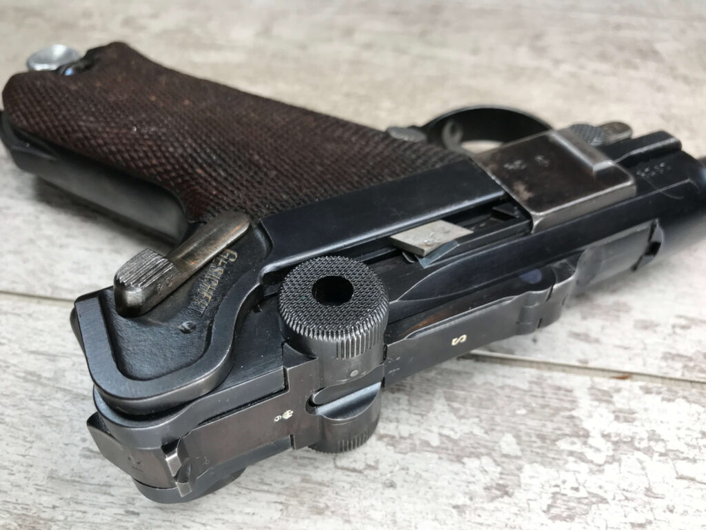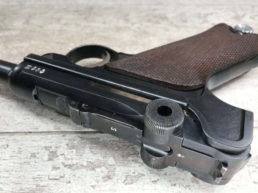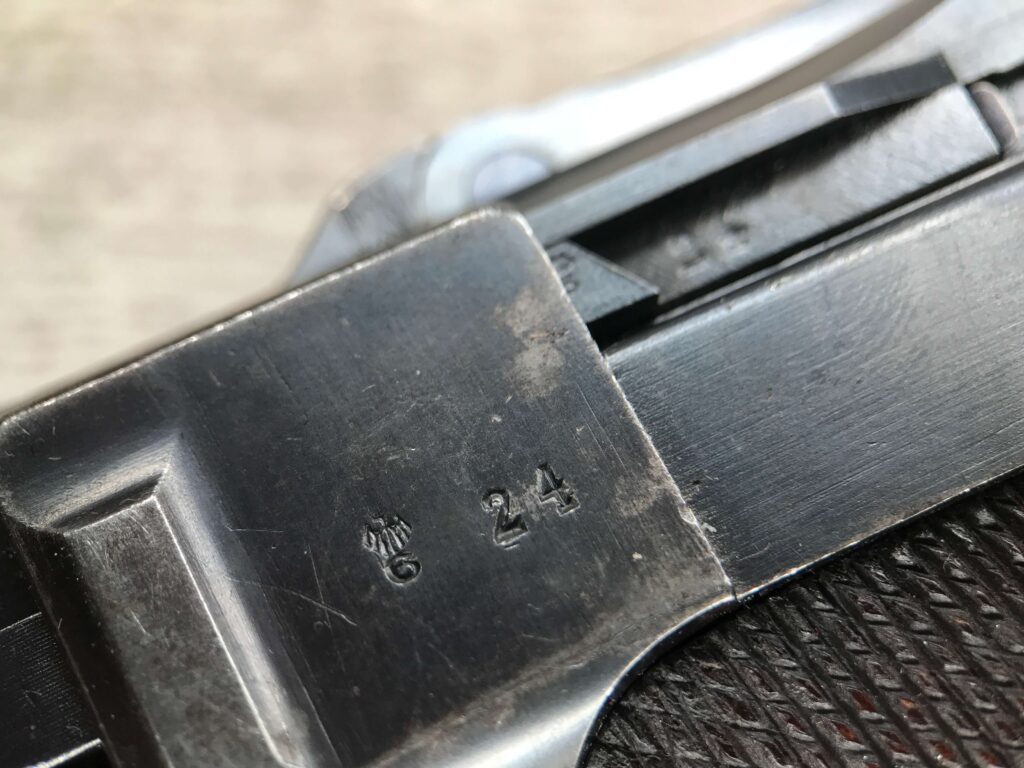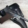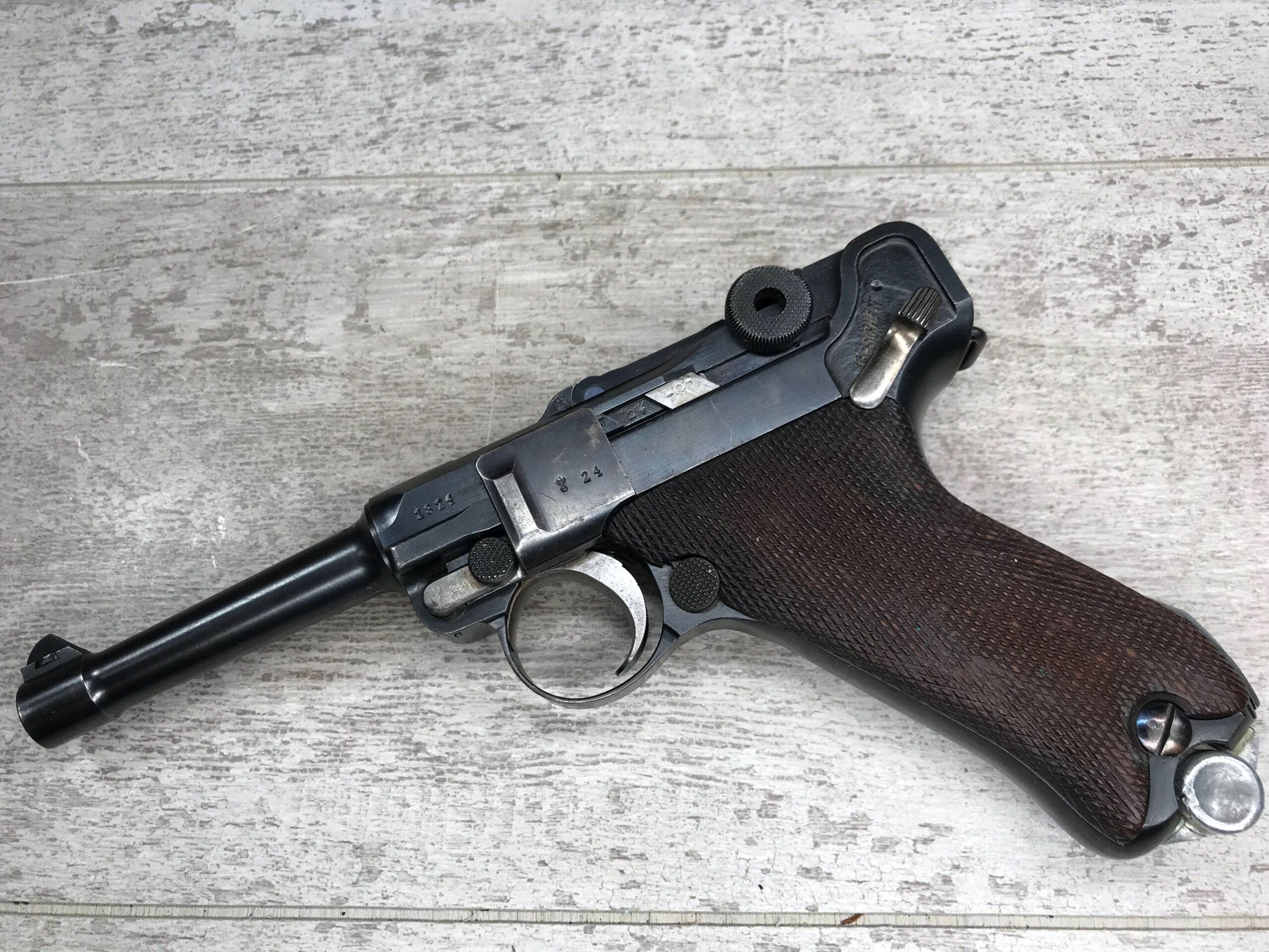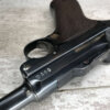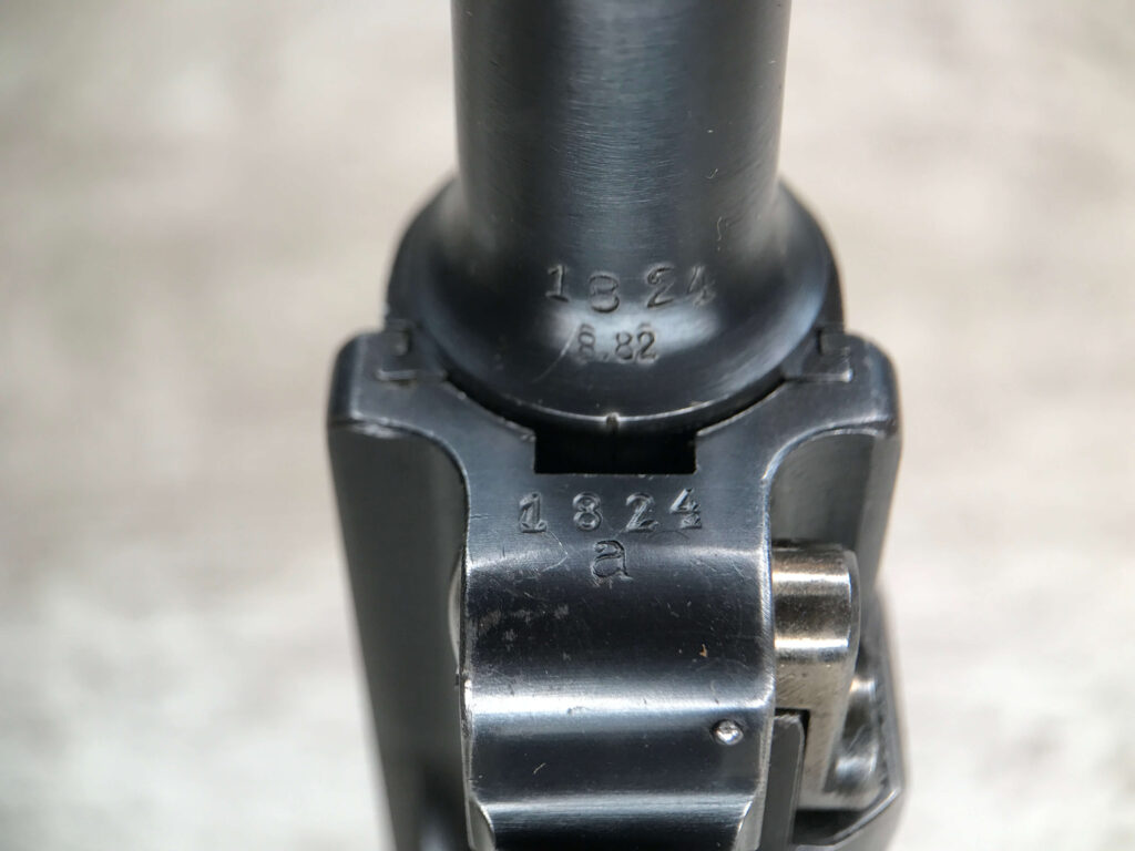 SIMSON & CO “S” CODE 9MM LUGER P08 PISTOL #1824a, 4″ BBL GERMAN CODE “S” ON THE TOGGLE W/BLANK CHAMBER, EAGLE/6 PROOFS THROUGHOUT, MATCHIN SERIAL INCLUDING THE MAG, 95% BLUE W/20% STRAW ON TRIGGER AND SAFETY, VG BRIGHT BORE W/EXC RIFLING, LIGHT WEAR ON GRIPS, BLACK HOLSTER MARKED “ROBERT LARSEN/BERLIN/1935”, EXC CONDITION HOLSTER, 95+%