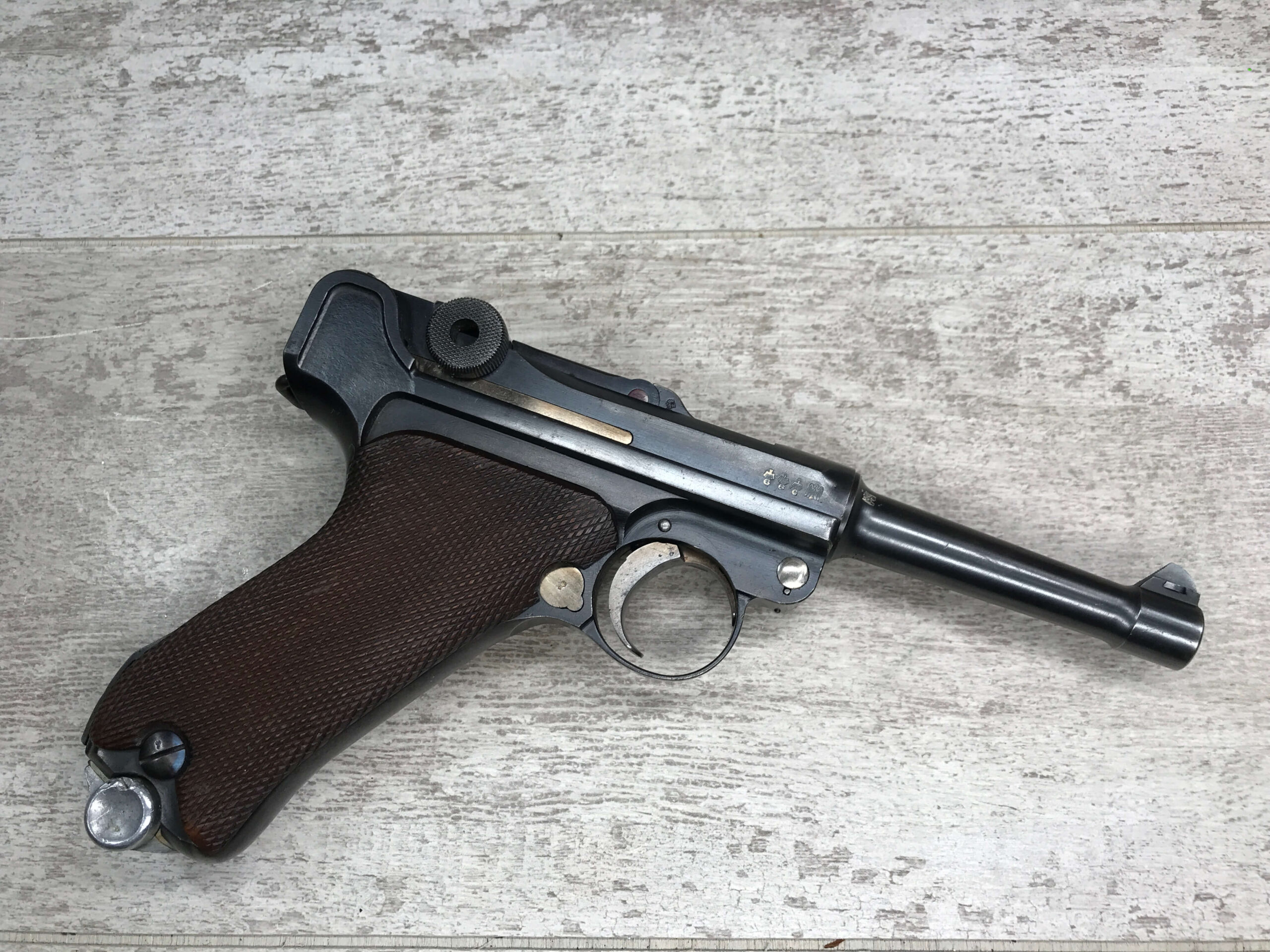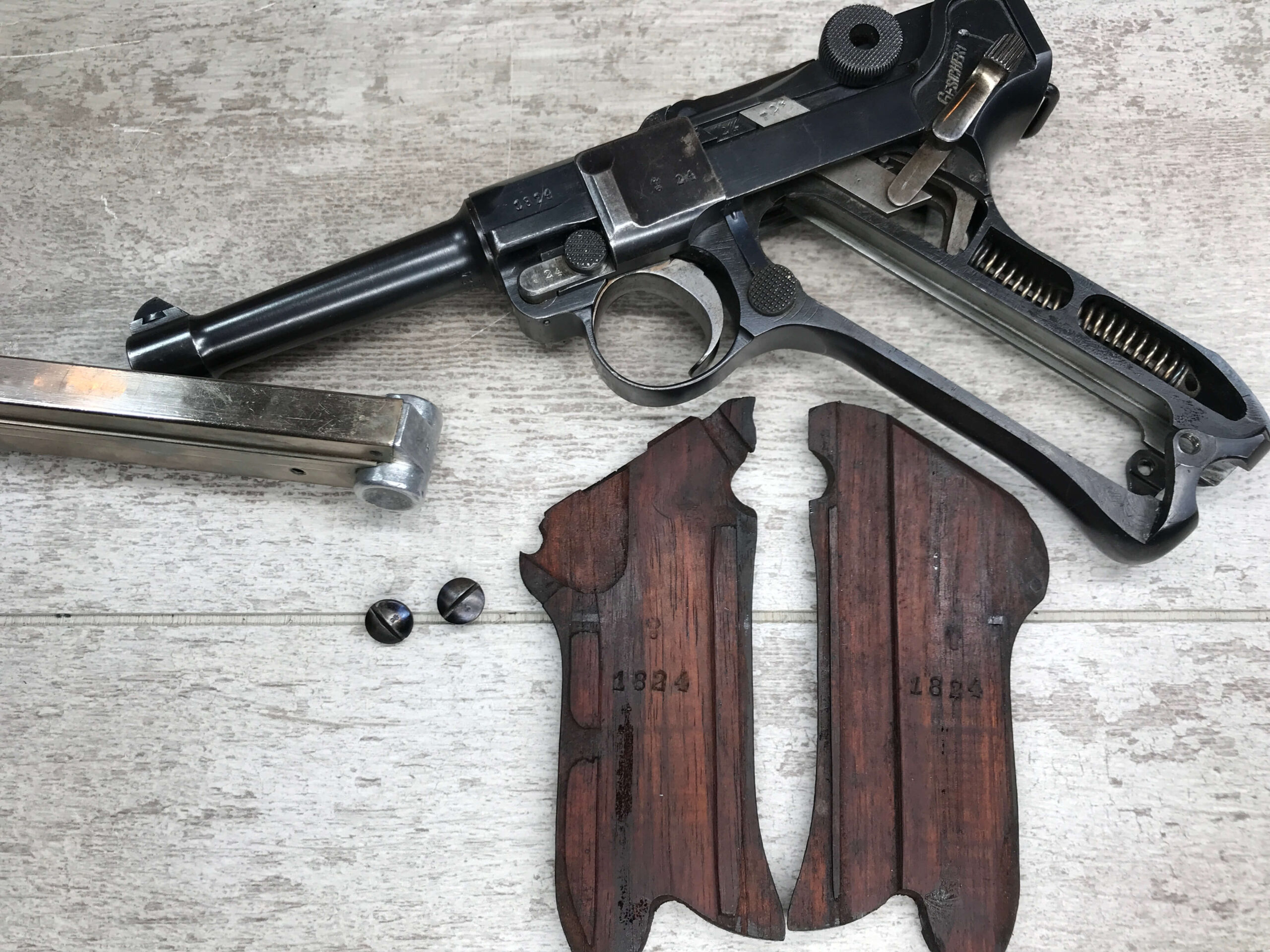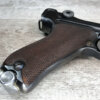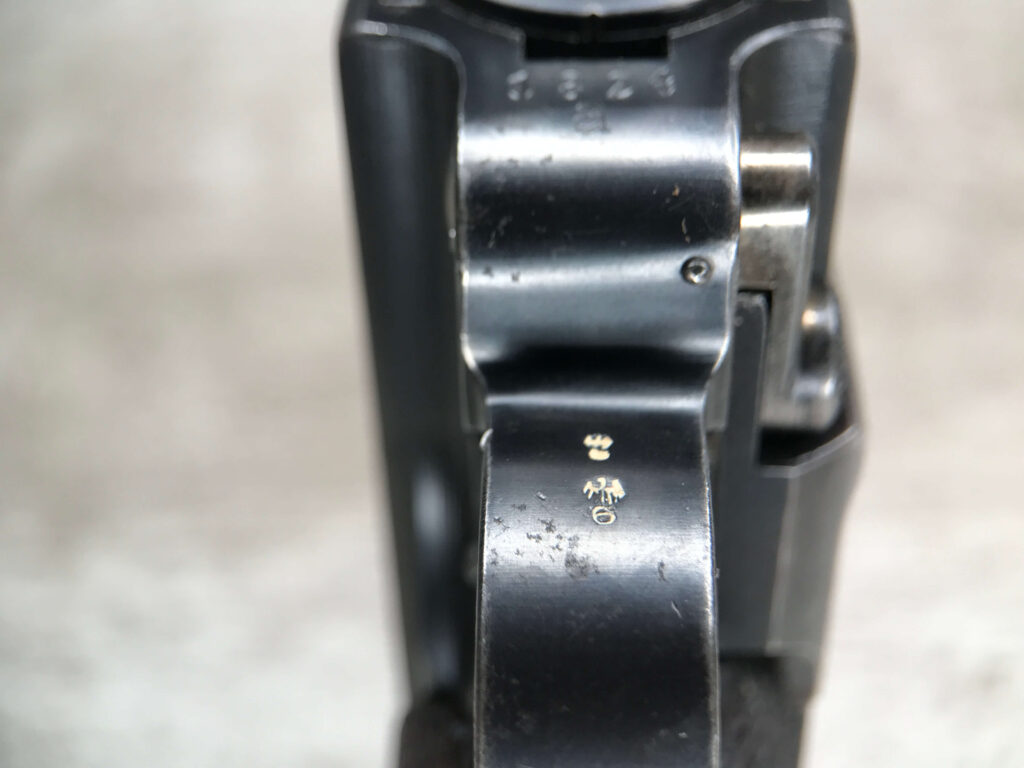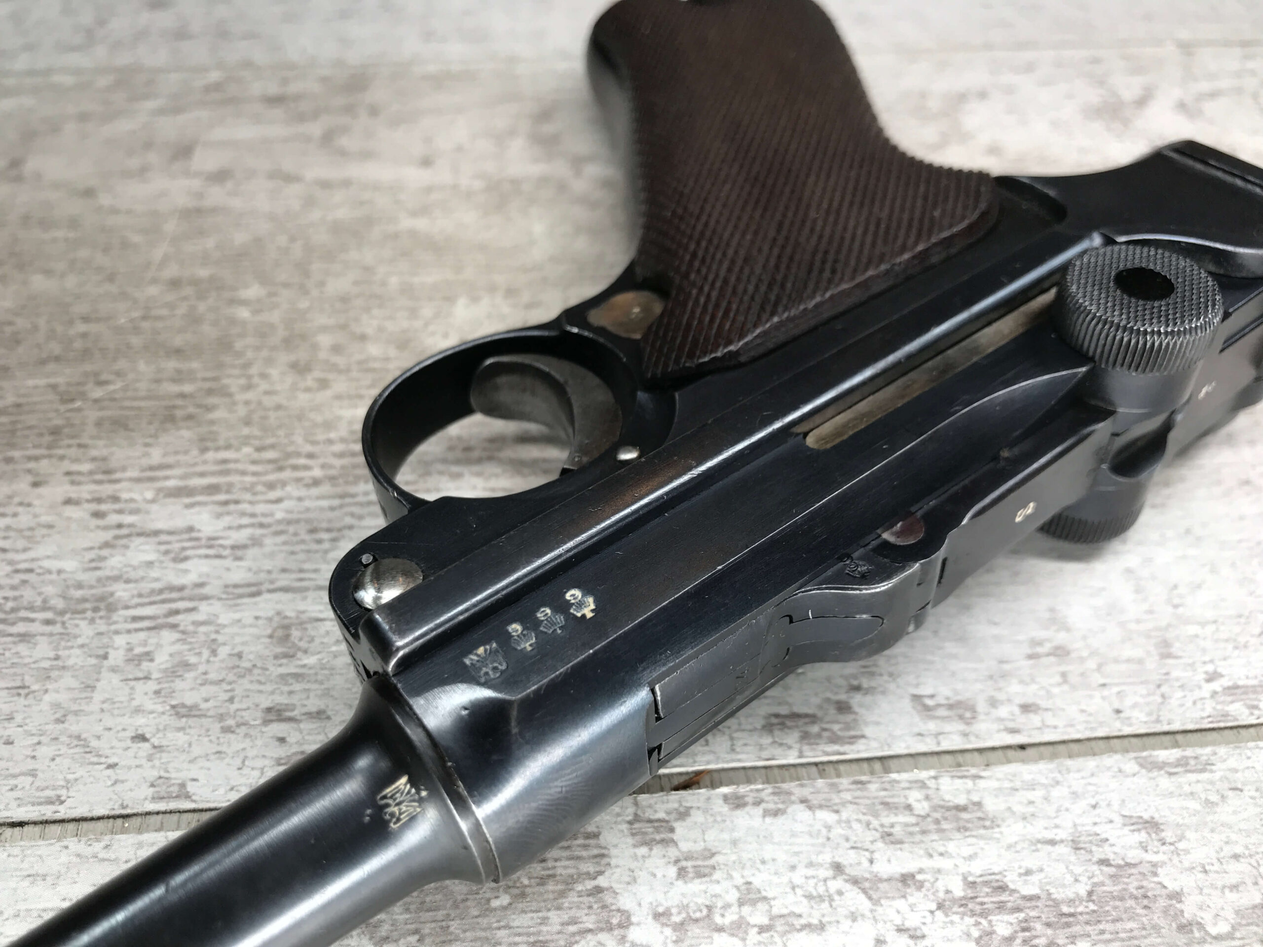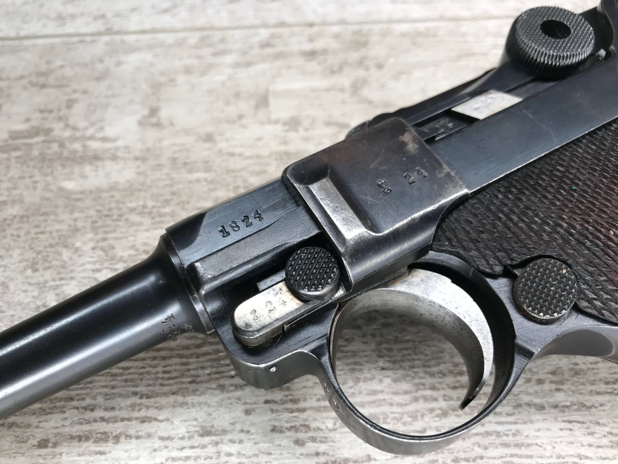 SIMSON & CO “S” CODE 9MM LUGER P08 PISTOL #1824a, 4″ BBL GERMAN CODE “S” ON THE TOGGLE W/BLANK CHAMBER, EAGLE/6 PROOFS THROUGHOUT, MATCHIN SERIAL INCLUDING THE MAG, 95% BLUE W/20% STRAW ON TRIGGER AND SAFETY, VG BRIGHT BORE W/EXC RIFLING, LIGHT WEAR ON GRIPS, BLACK HOLSTER MARKED “ROBERT LARSEN/BERLIN/1935”, EXC CONDITION HOLSTER, 95+%