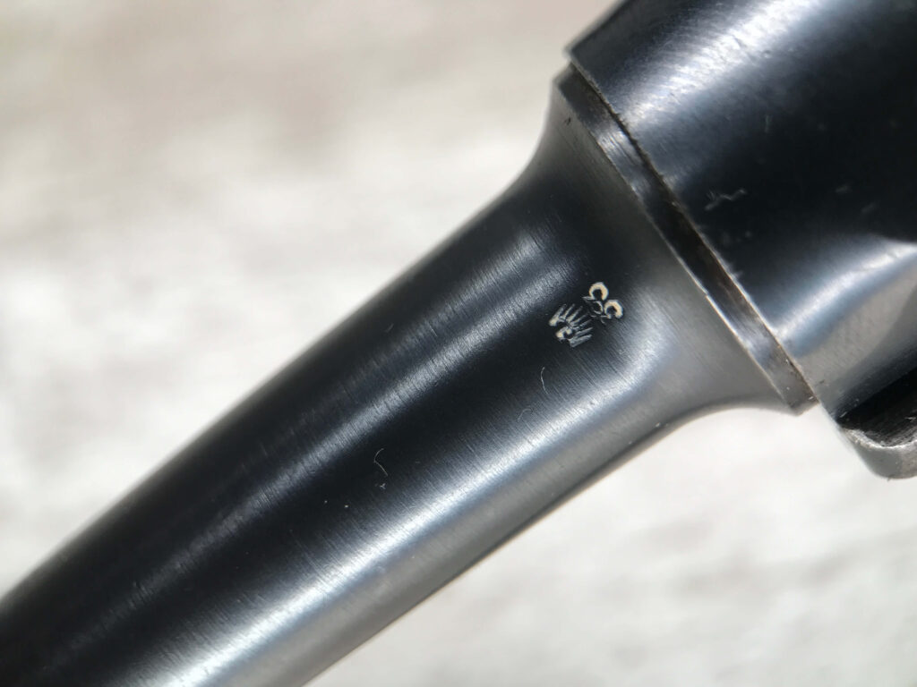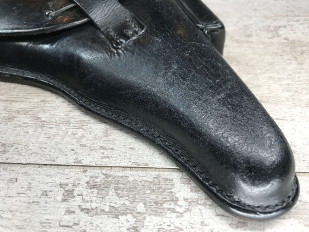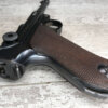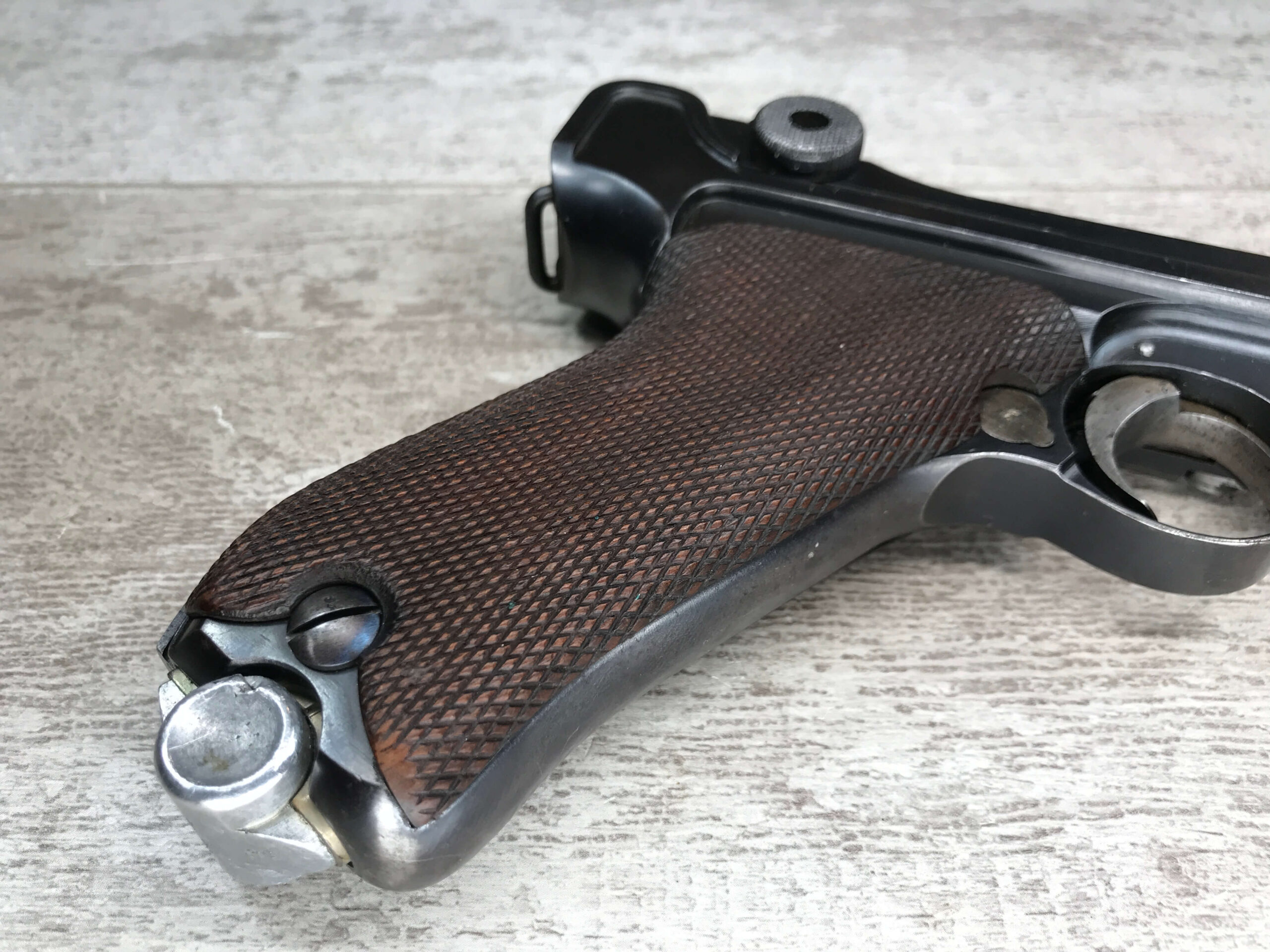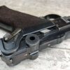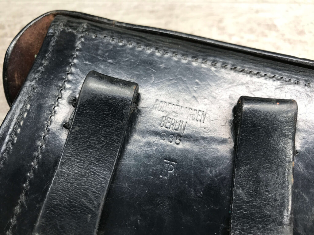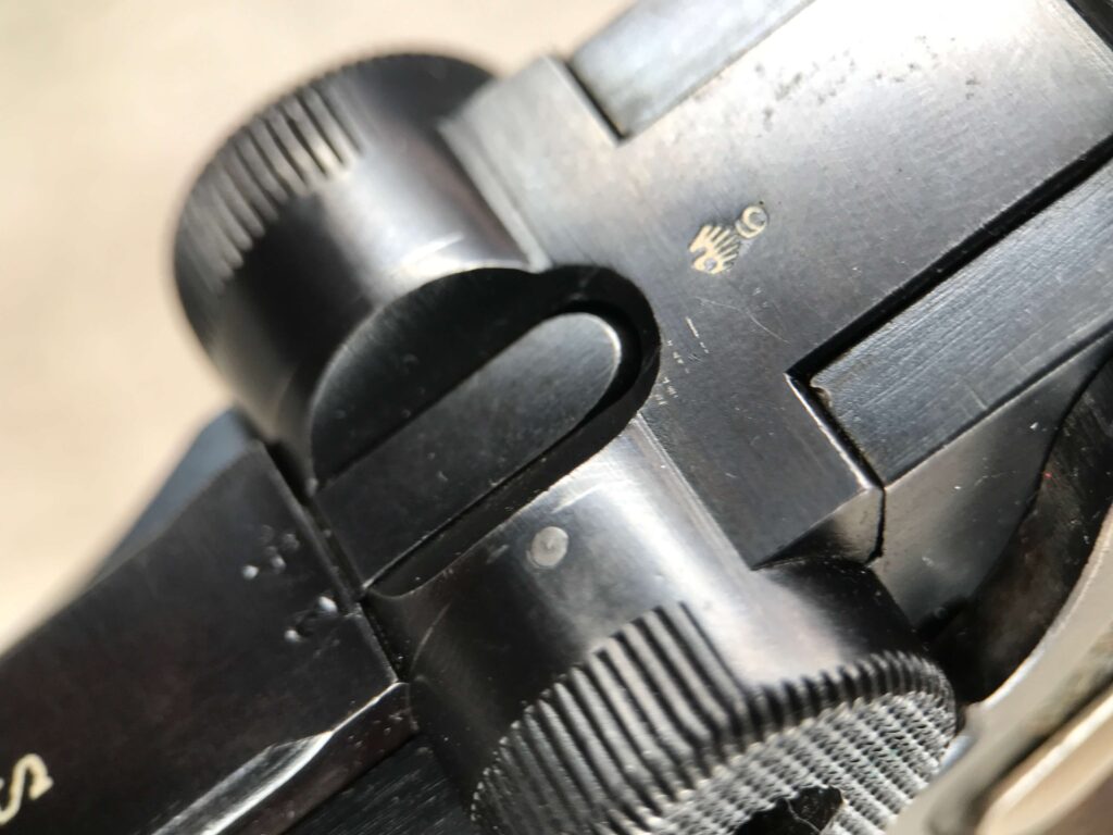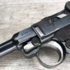 SIMSON & CO “S” CODE 9MM LUGER P08 PISTOL #1824a, 4″ BBL GERMAN CODE “S” ON THE TOGGLE W/BLANK CHAMBER, EAGLE/6 PROOFS THROUGHOUT, MATCHIN SERIAL INCLUDING THE MAG, 95% BLUE W/20% STRAW ON TRIGGER AND SAFETY, VG BRIGHT BORE W/EXC RIFLING, LIGHT WEAR ON GRIPS, BLACK HOLSTER MARKED “ROBERT LARSEN/BERLIN/1935”, EXC CONDITION HOLSTER, 95+%