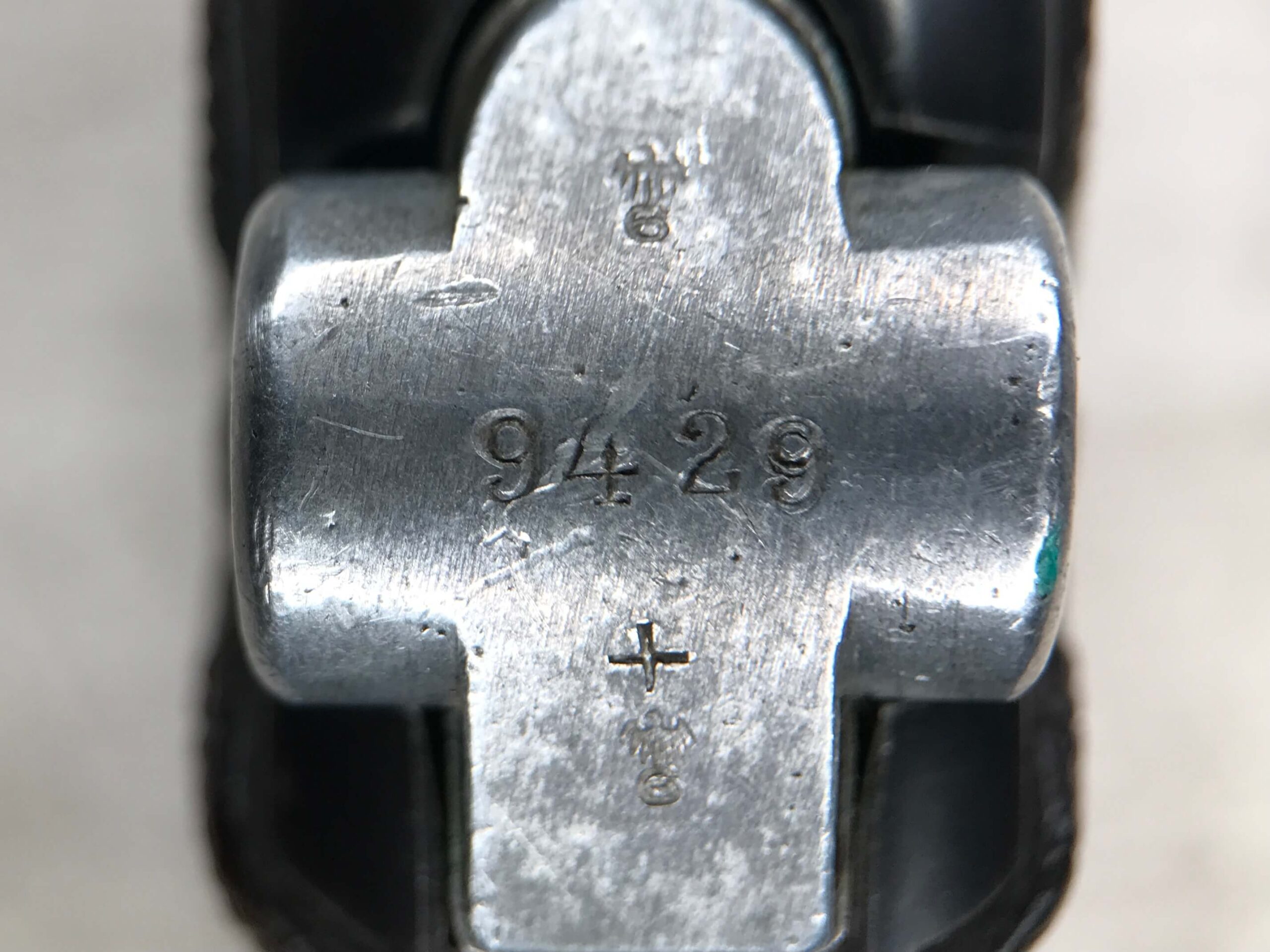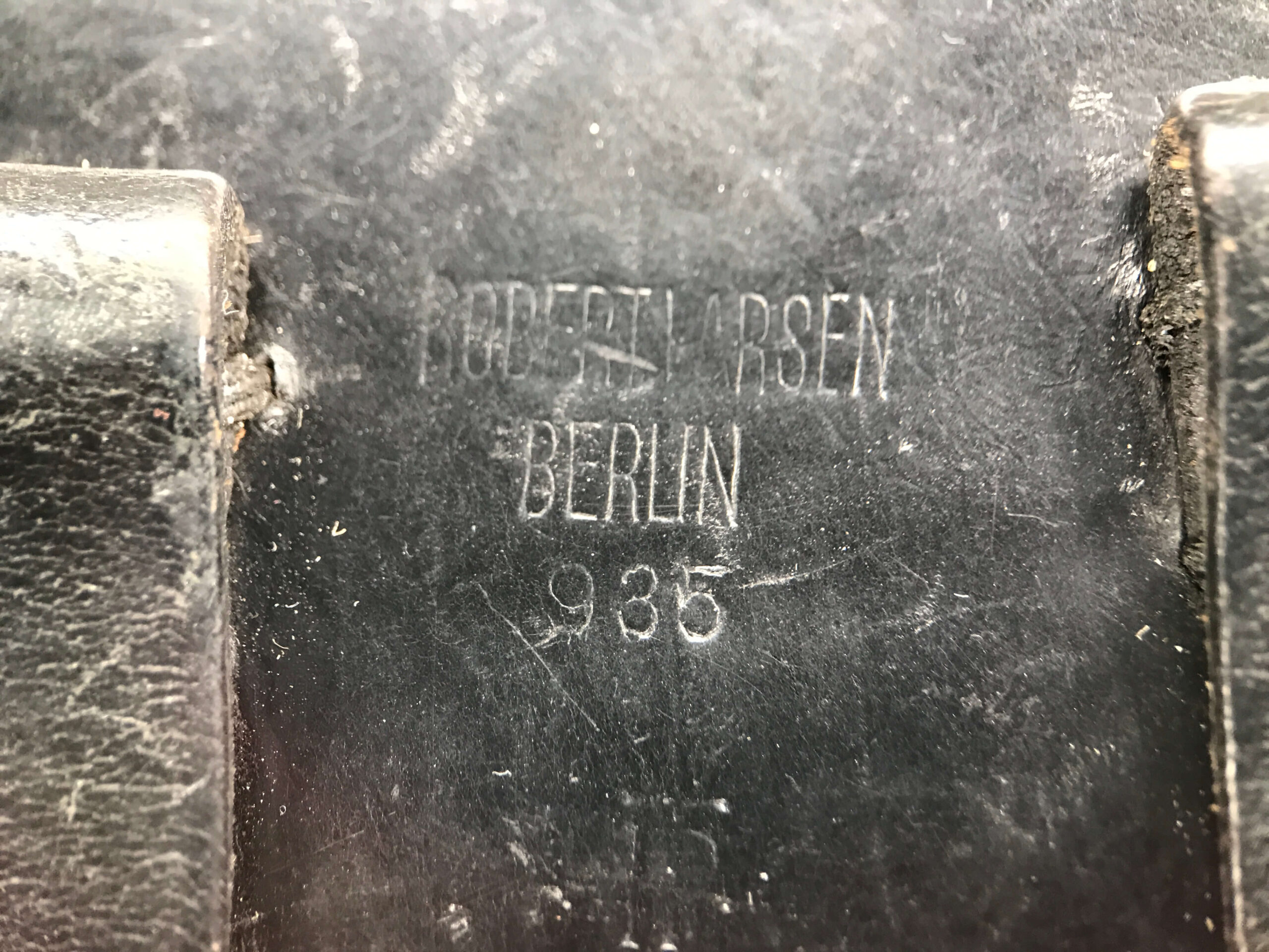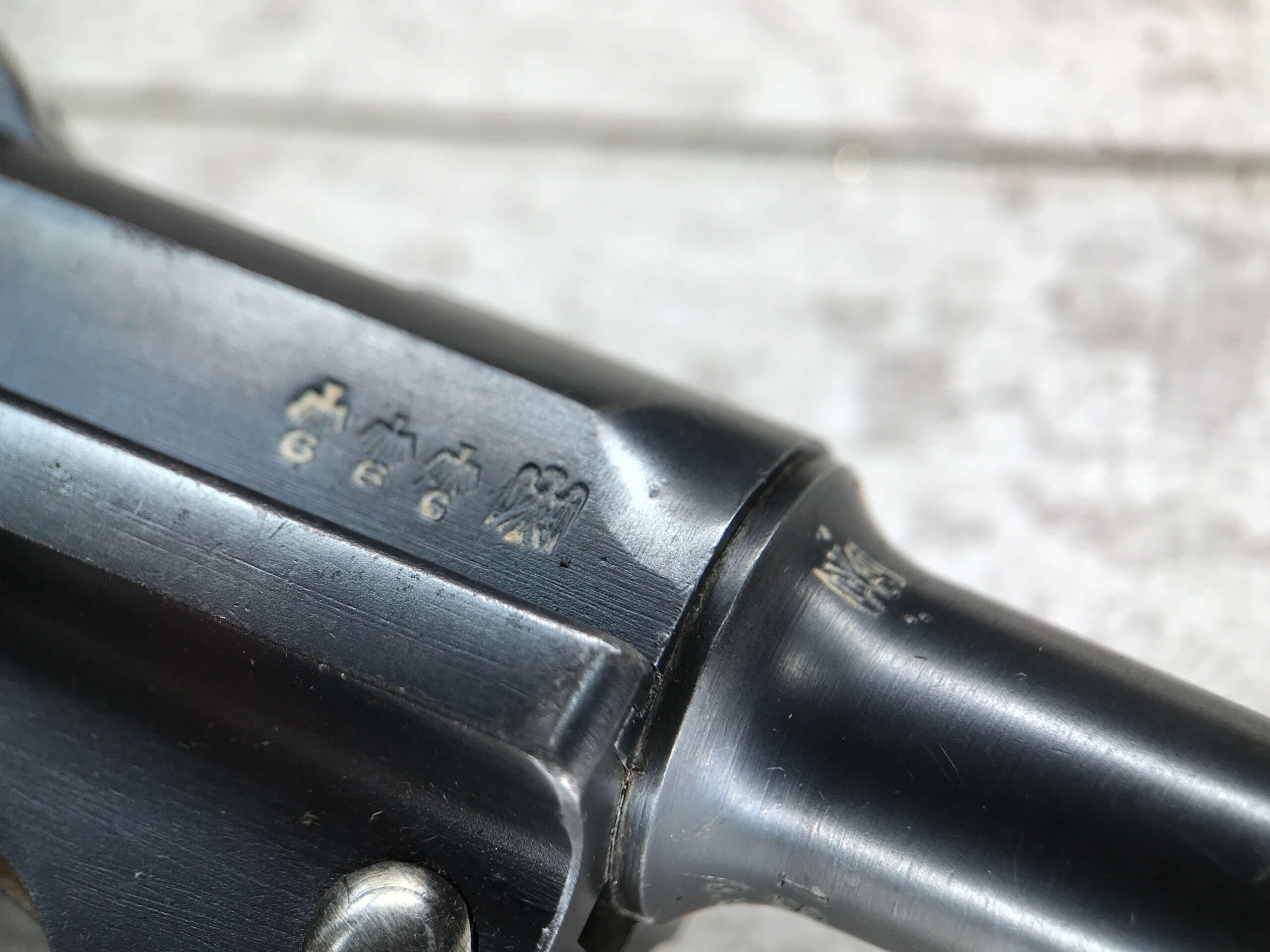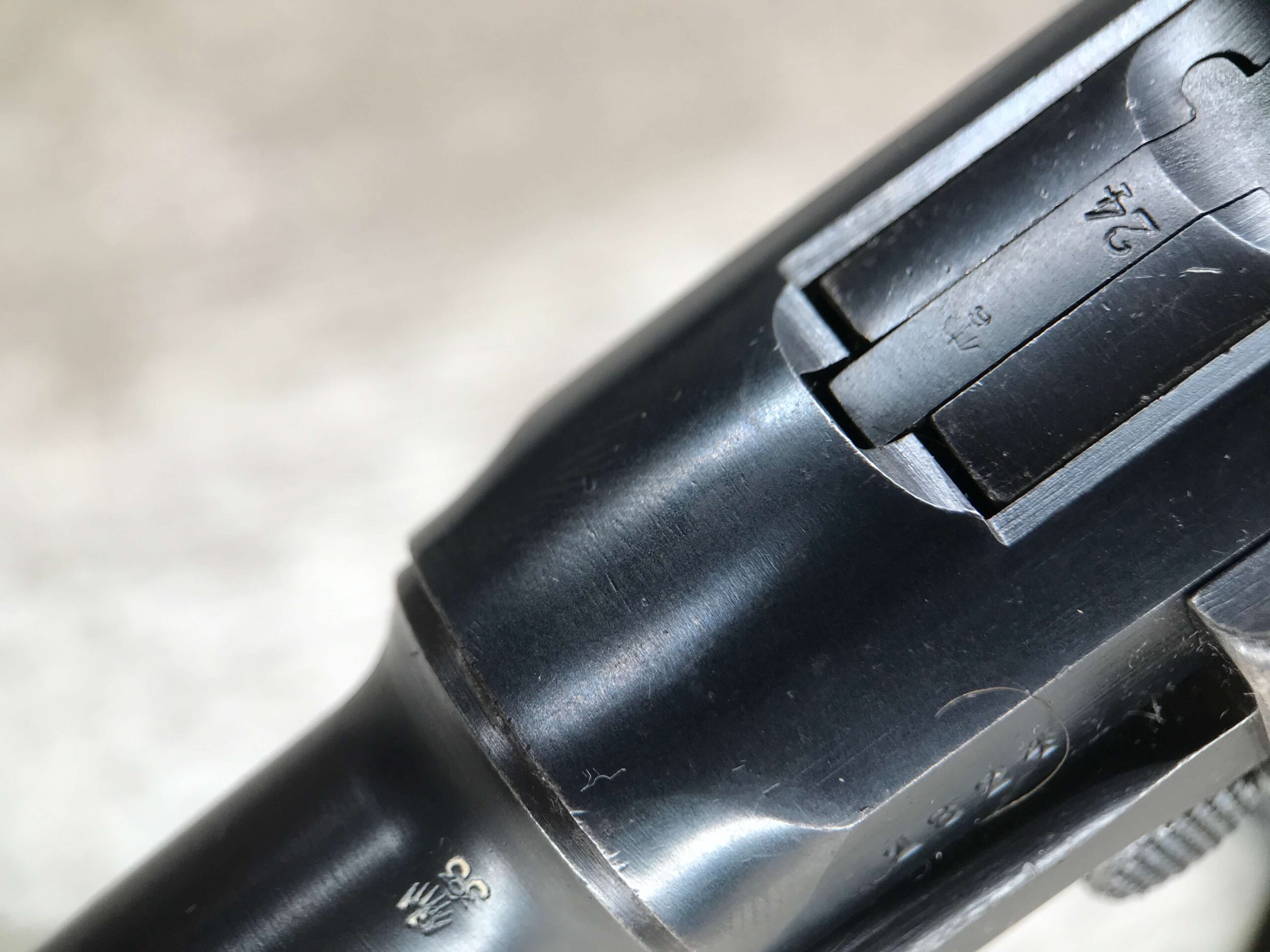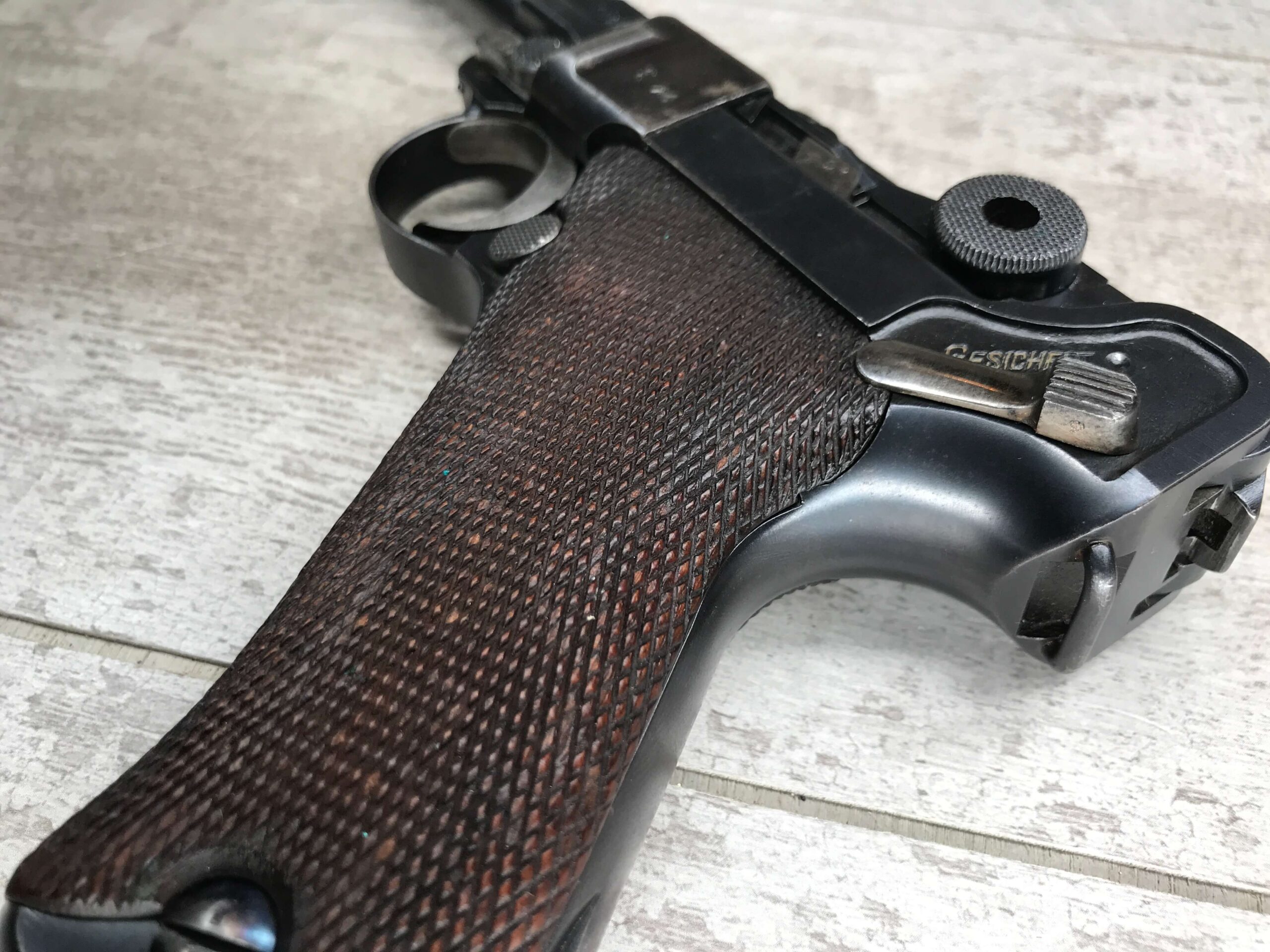 SIMSON & CO “S” CODE 9MM LUGER P08 PISTOL #1824a, 4″ BBL GERMAN CODE “S” ON THE TOGGLE W/BLANK CHAMBER, EAGLE/6 PROOFS THROUGHOUT, MATCHIN SERIAL INCLUDING THE MAG, 95% BLUE W/20% STRAW ON TRIGGER AND SAFETY, VG BRIGHT BORE W/EXC RIFLING, LIGHT WEAR ON GRIPS, BLACK HOLSTER MARKED “ROBERT LARSEN/BERLIN/1935”, EXC CONDITION HOLSTER, 95+%