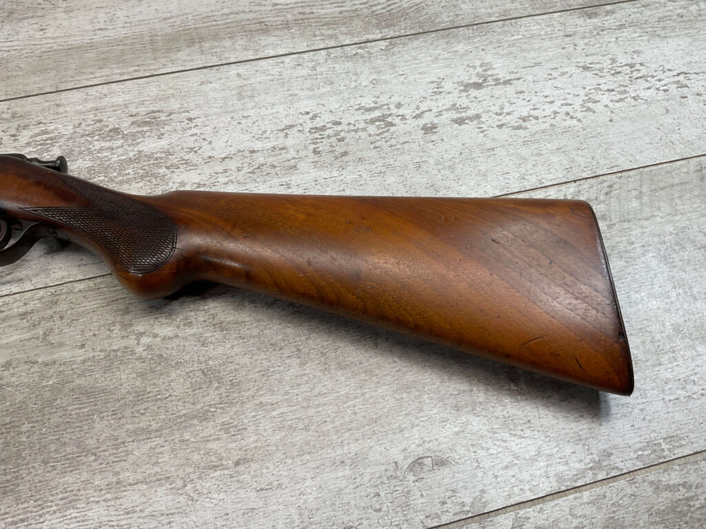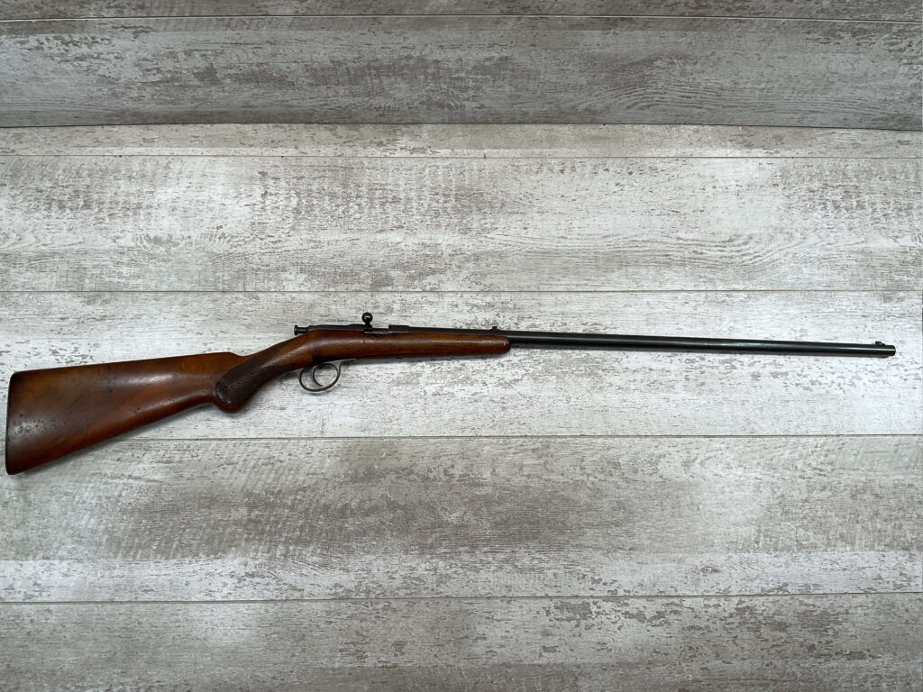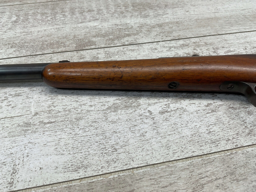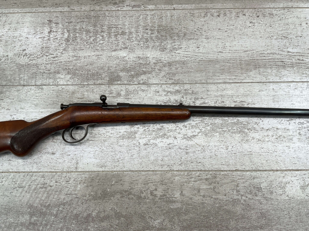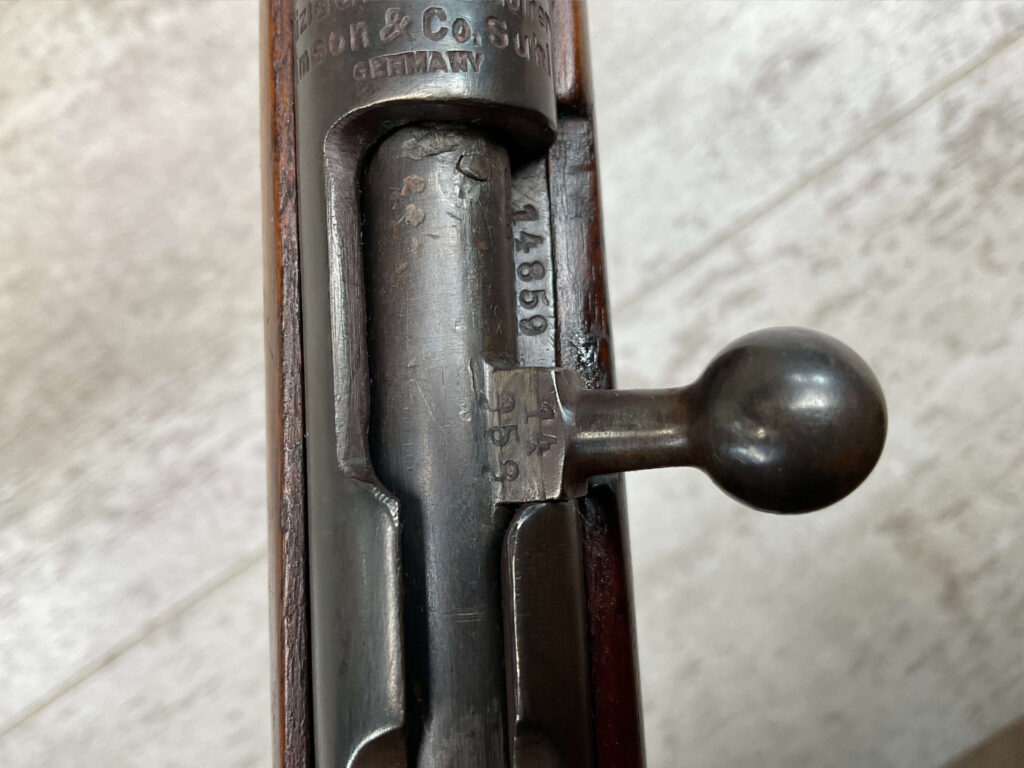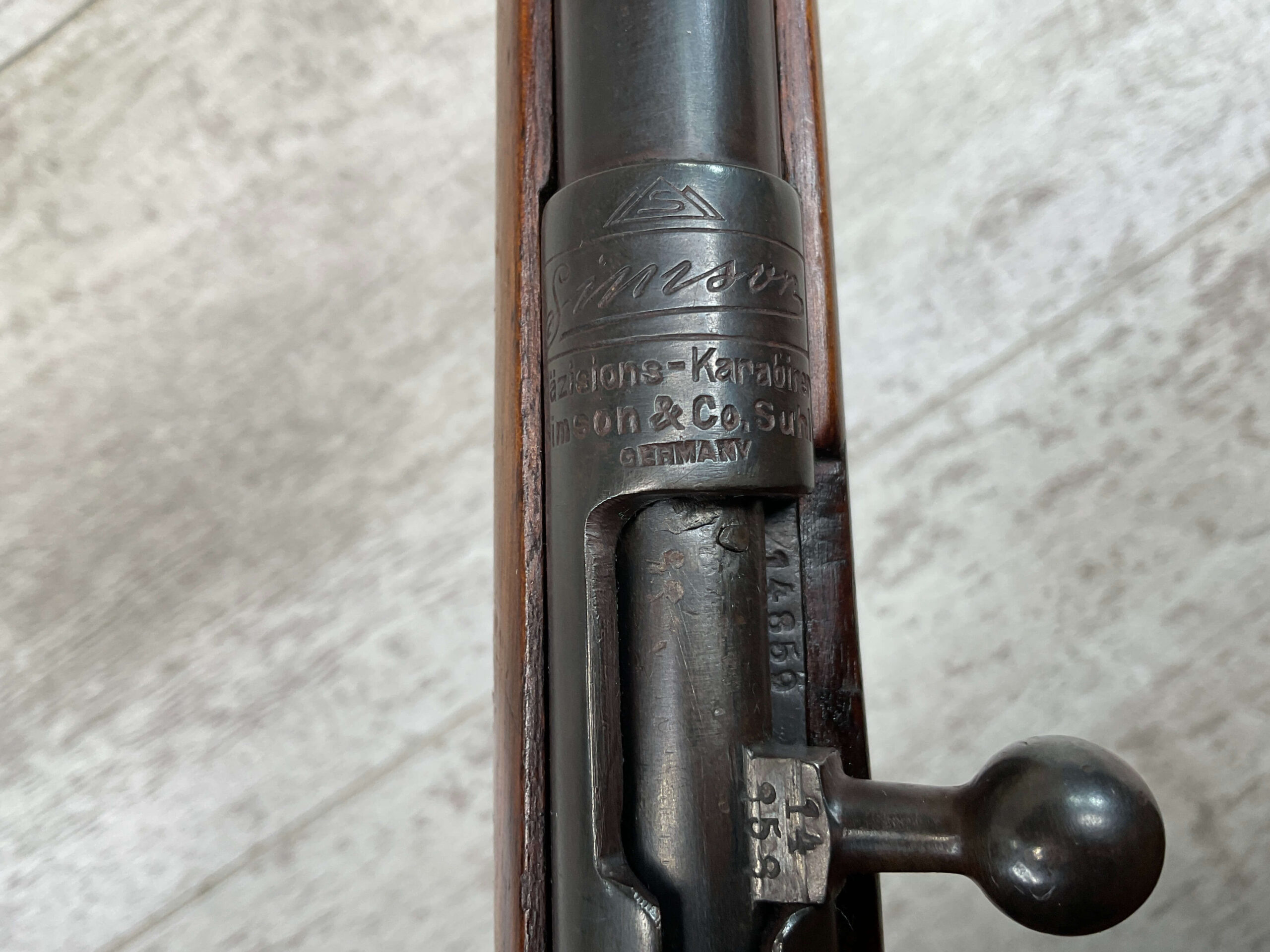 SIMSON & CO. SUHL GERMANY .22LR BOLT ACTION RIFLE, #14859, 23 1/2″ BBL, TAKEDOWN SCREW, SING SHOT, ALL MATCHING, EXC CHECKERED STOCK W/LIGHT DINGS NICKS FROM AGE/USE, STEEL BUTT PLATE, “SIMSON/PRAZISIONS-KARABINER/SIMSON & CO. SUHL/GERMANY” W/SIMSON SNAKE & PYRAMID LOGO ABOVE, CORRECT PROOFS, STEEL TRIGGER GUARD, VG BRIGHT BORE W/VG RIFLING, LIGHT FROSTING IN AREAS, ONE REALLY COOL .22LR SINGLE SHOT!