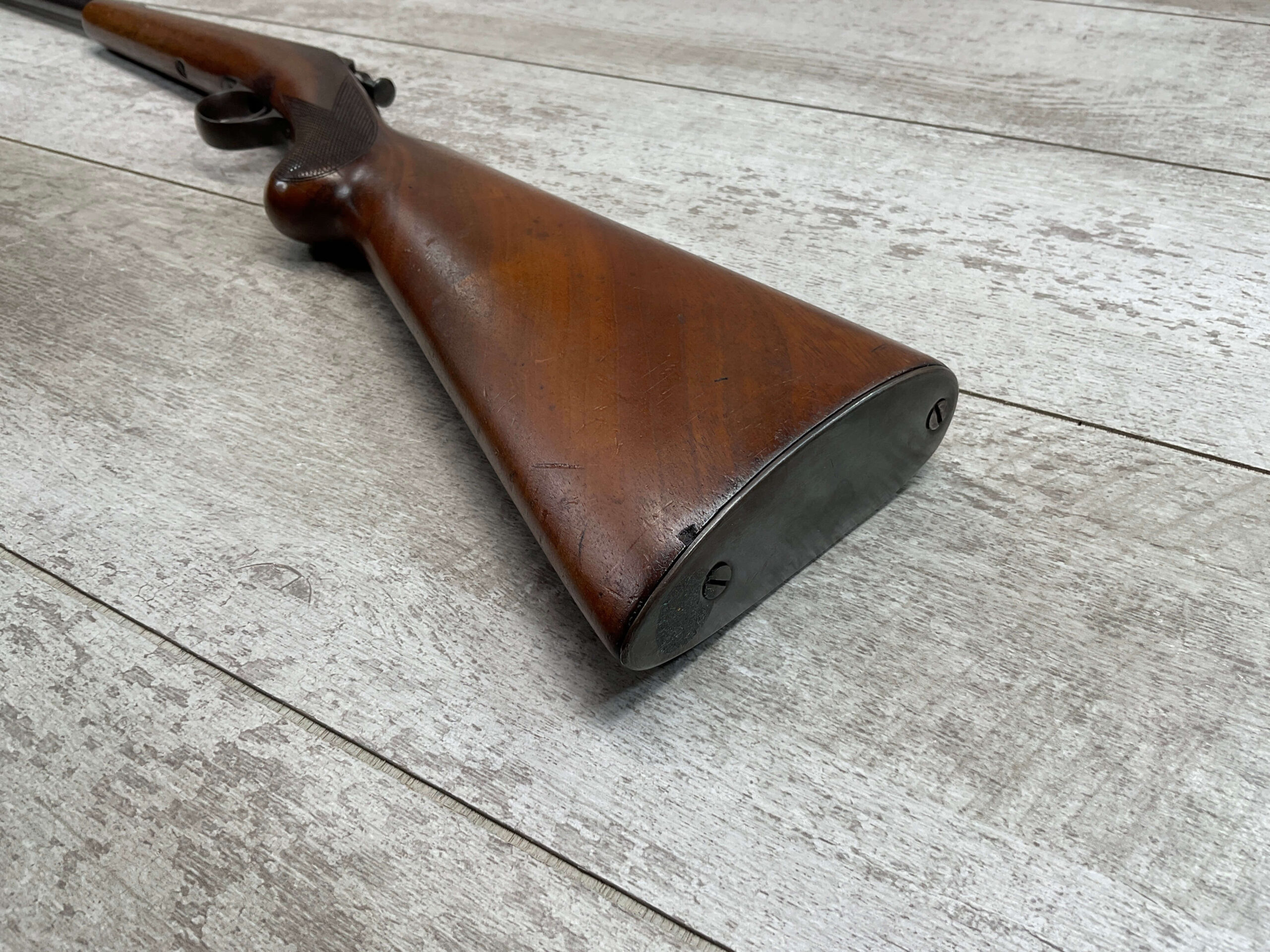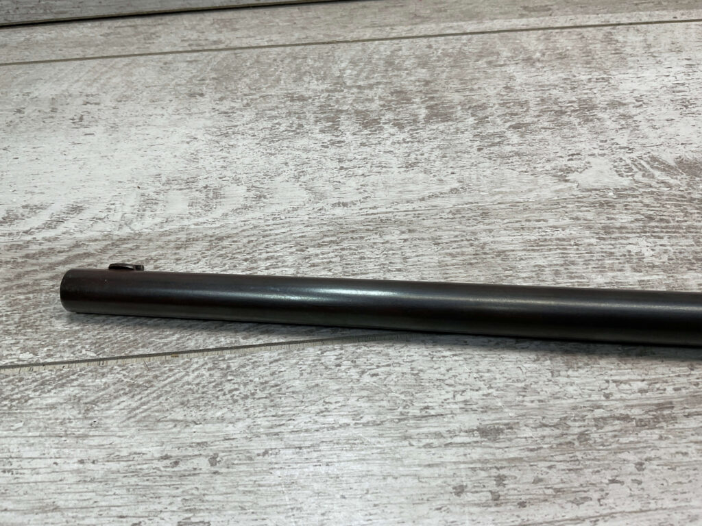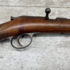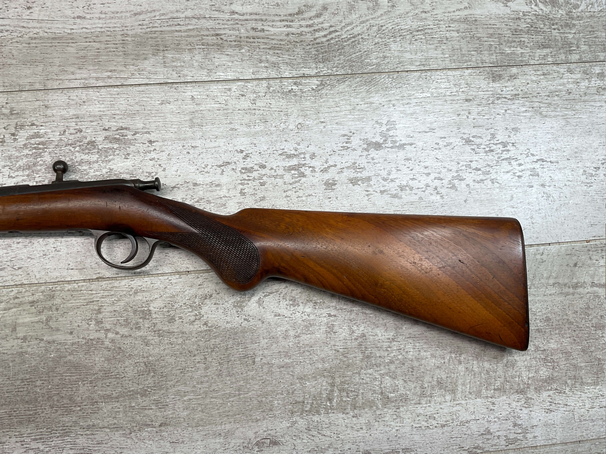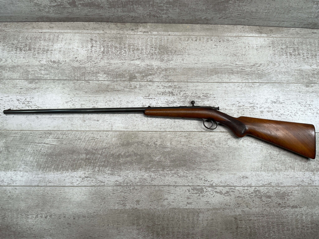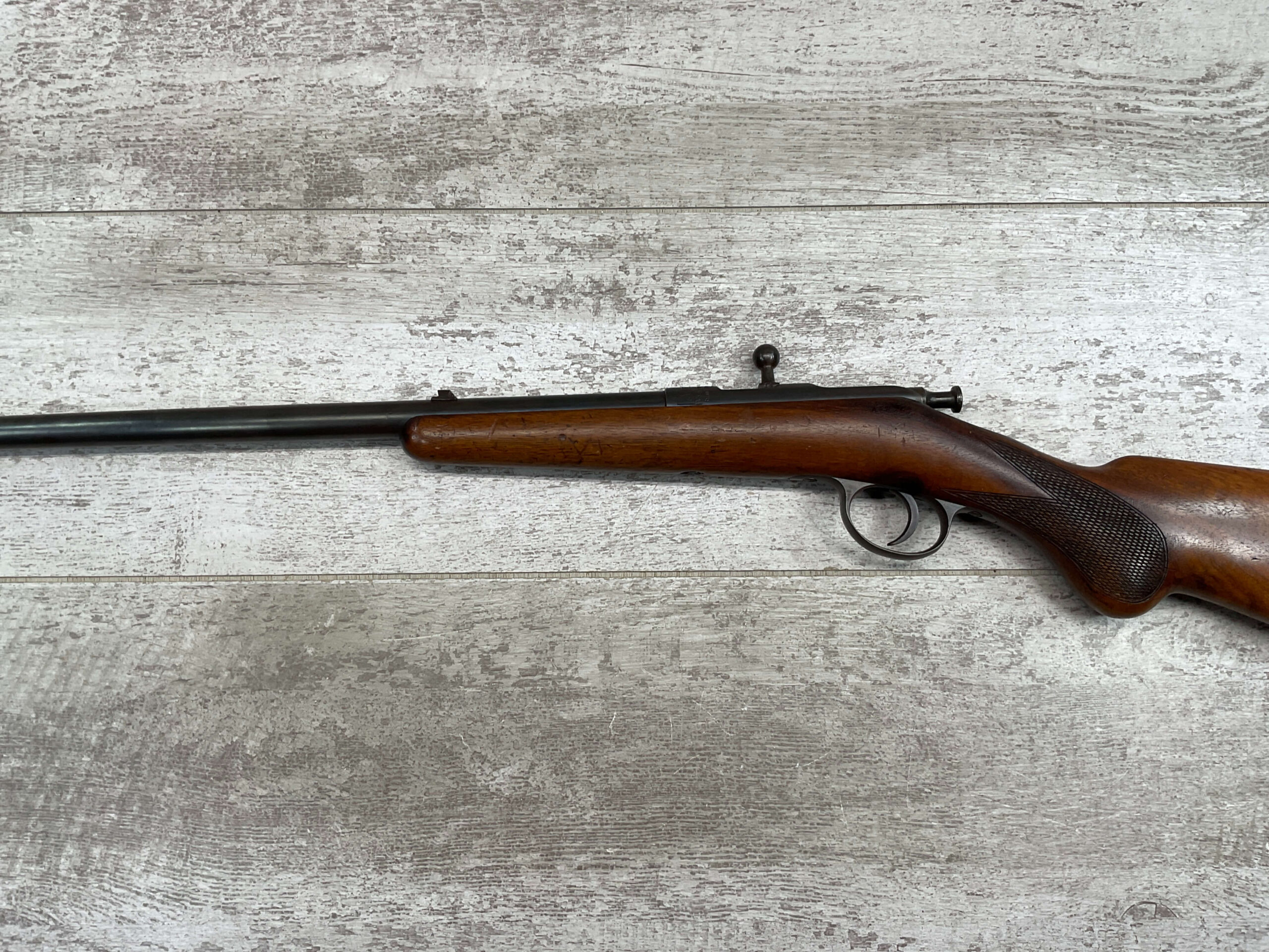 SIMSON & CO. SUHL GERMANY .22LR BOLT ACTION RIFLE, #14859, 23 1/2″ BBL, TAKEDOWN SCREW, SING SHOT, ALL MATCHING, EXC CHECKERED STOCK W/LIGHT DINGS NICKS FROM AGE/USE, STEEL BUTT PLATE, “SIMSON/PRAZISIONS-KARABINER/SIMSON & CO. SUHL/GERMANY” W/SIMSON SNAKE & PYRAMID LOGO ABOVE, CORRECT PROOFS, STEEL TRIGGER GUARD, VG BRIGHT BORE W/VG RIFLING, LIGHT FROSTING IN AREAS, ONE REALLY COOL .22LR SINGLE SHOT!