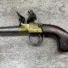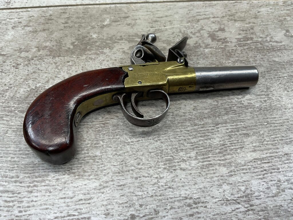 SMITH MUFF FLINTLOCK .32 CAL PISTOL, ANTIQUE #NSN, VG BRASS FRAME, ENGRAVED, “LONDON” PROOF ON RIGHT SIDE OF FRAME, “SMITH” MARKED ON LEFT SIDE OF FRAME, POOR BORE W/ FROSTING THROUGHOUT, NOT A REPRODUCTION, OVERALL CONDITION AS SEEN IN PHOTOS!!