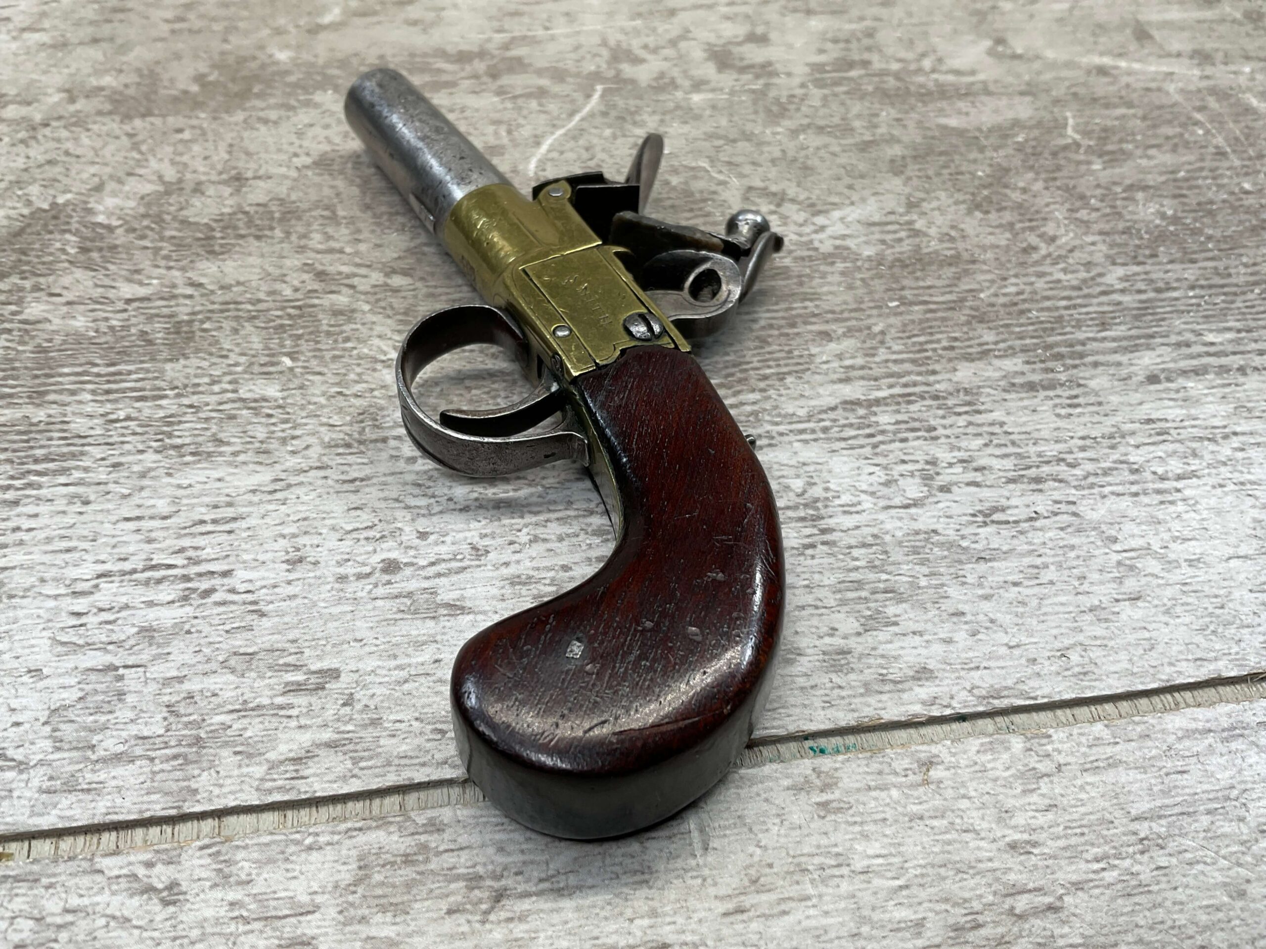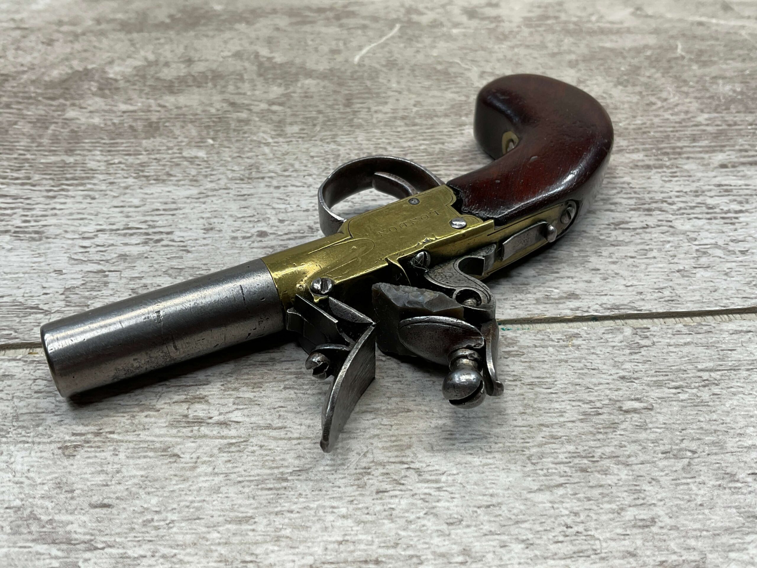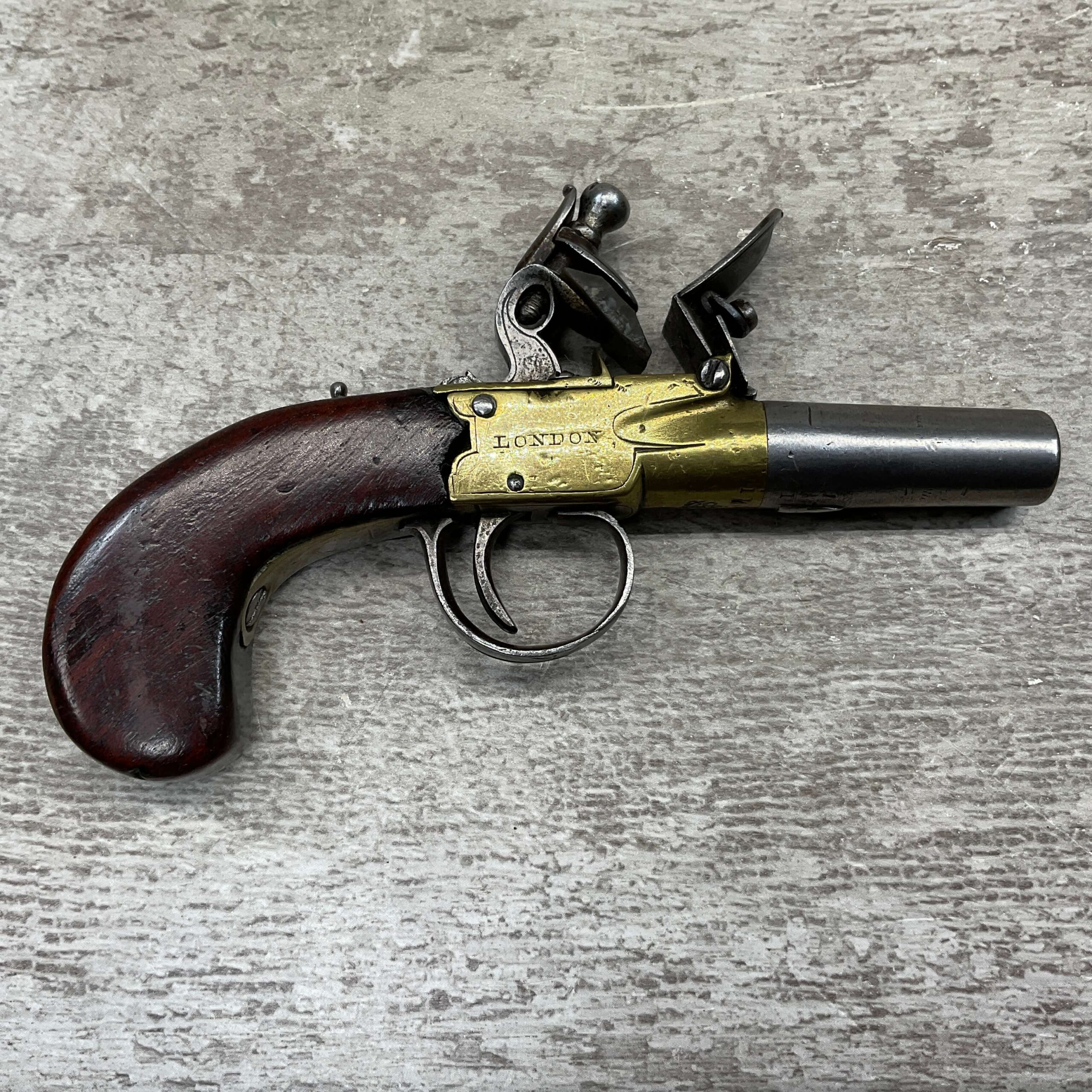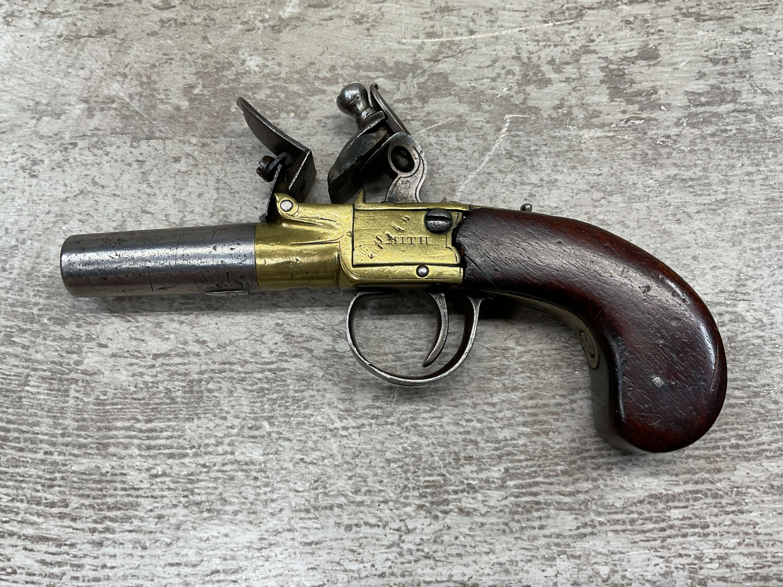 SMITH MUFF FLINTLOCK .32 CAL PISTOL, ANTIQUE #NSN, VG BRASS FRAME, ENGRAVED, “LONDON” PROOF ON RIGHT SIDE OF FRAME, “SMITH” MARKED ON LEFT SIDE OF FRAME, POOR BORE W/ FROSTING THROUGHOUT, NOT A REPRODUCTION, OVERALL CONDITION AS SEEN IN PHOTOS!!