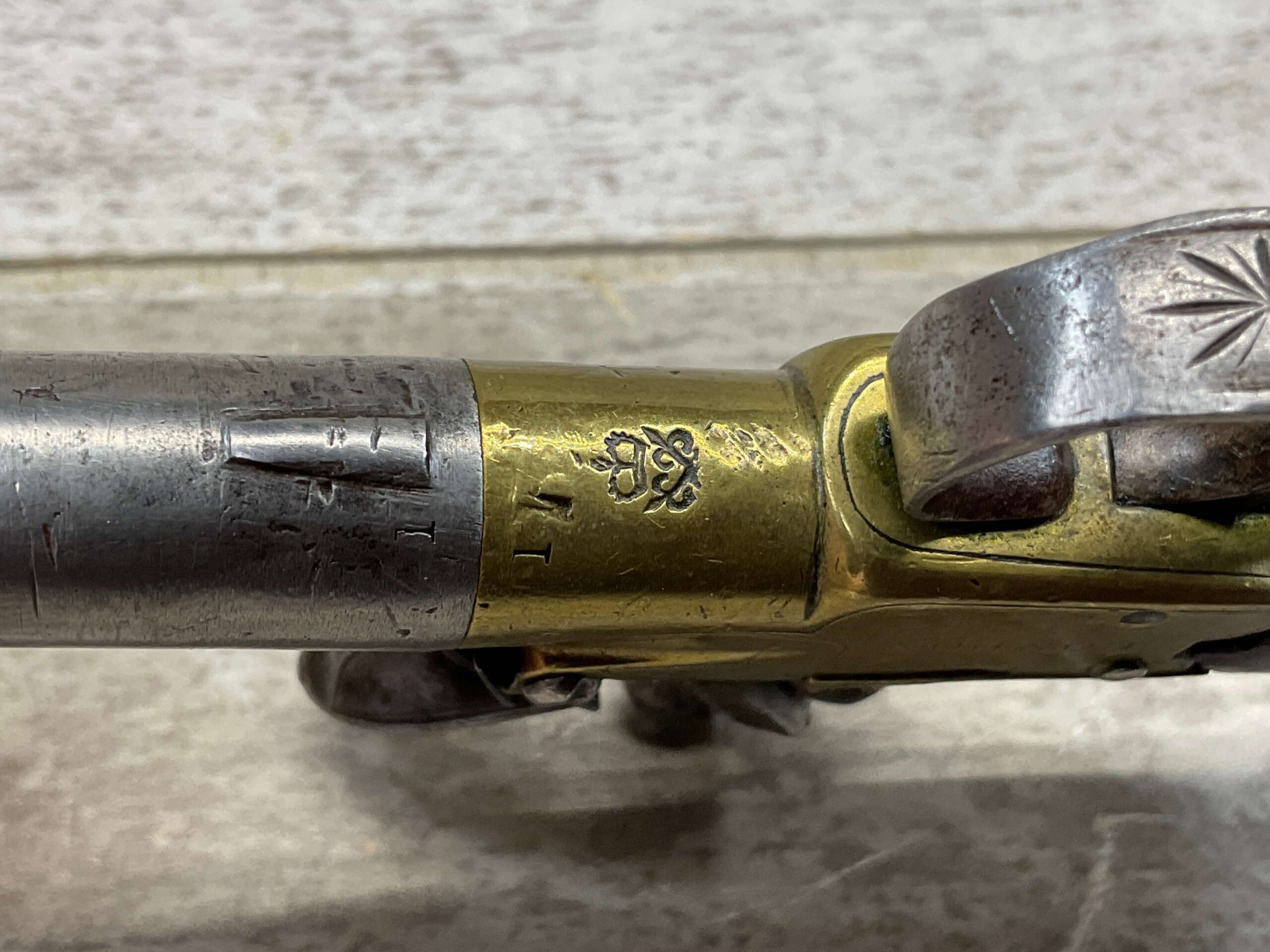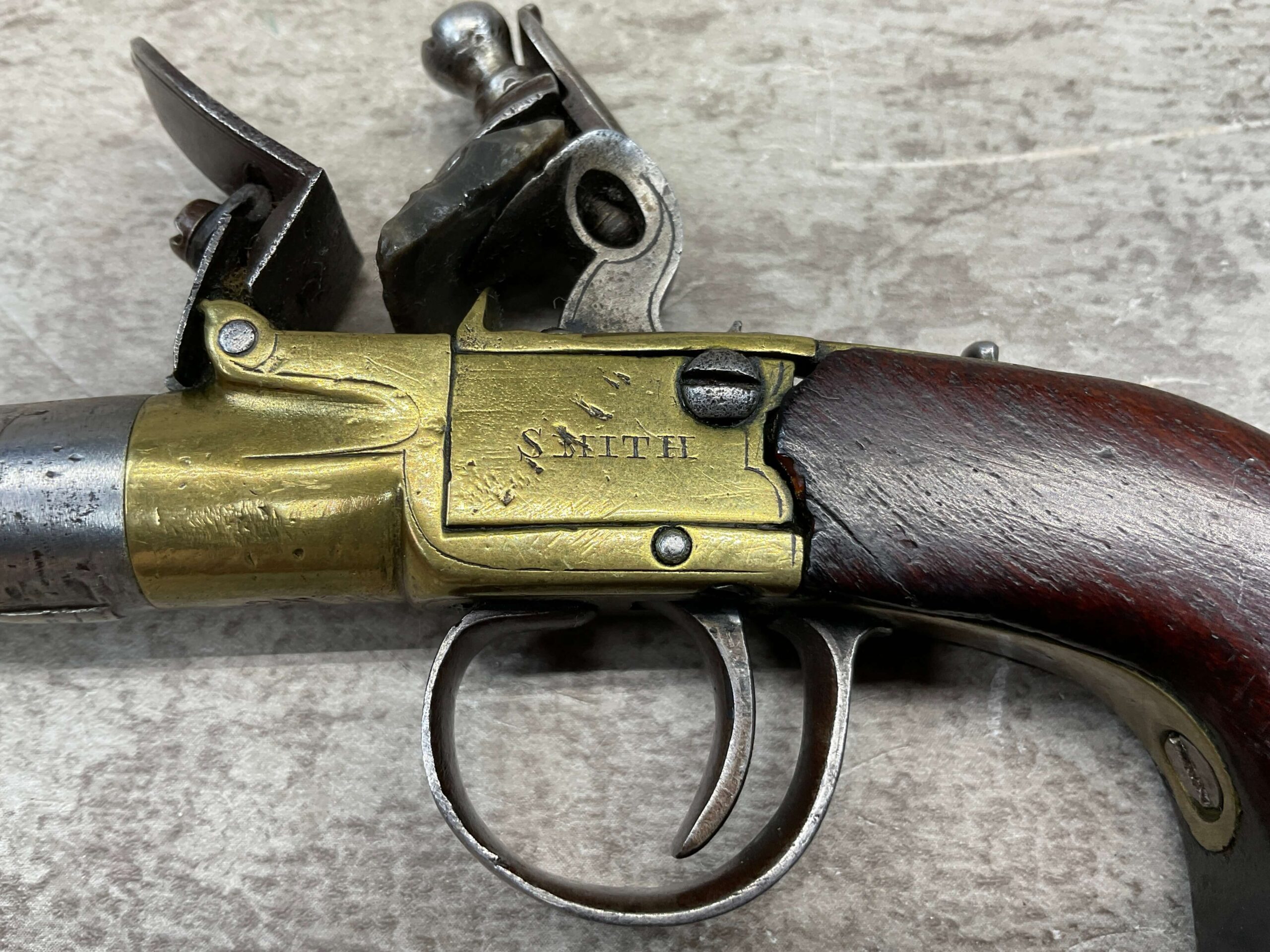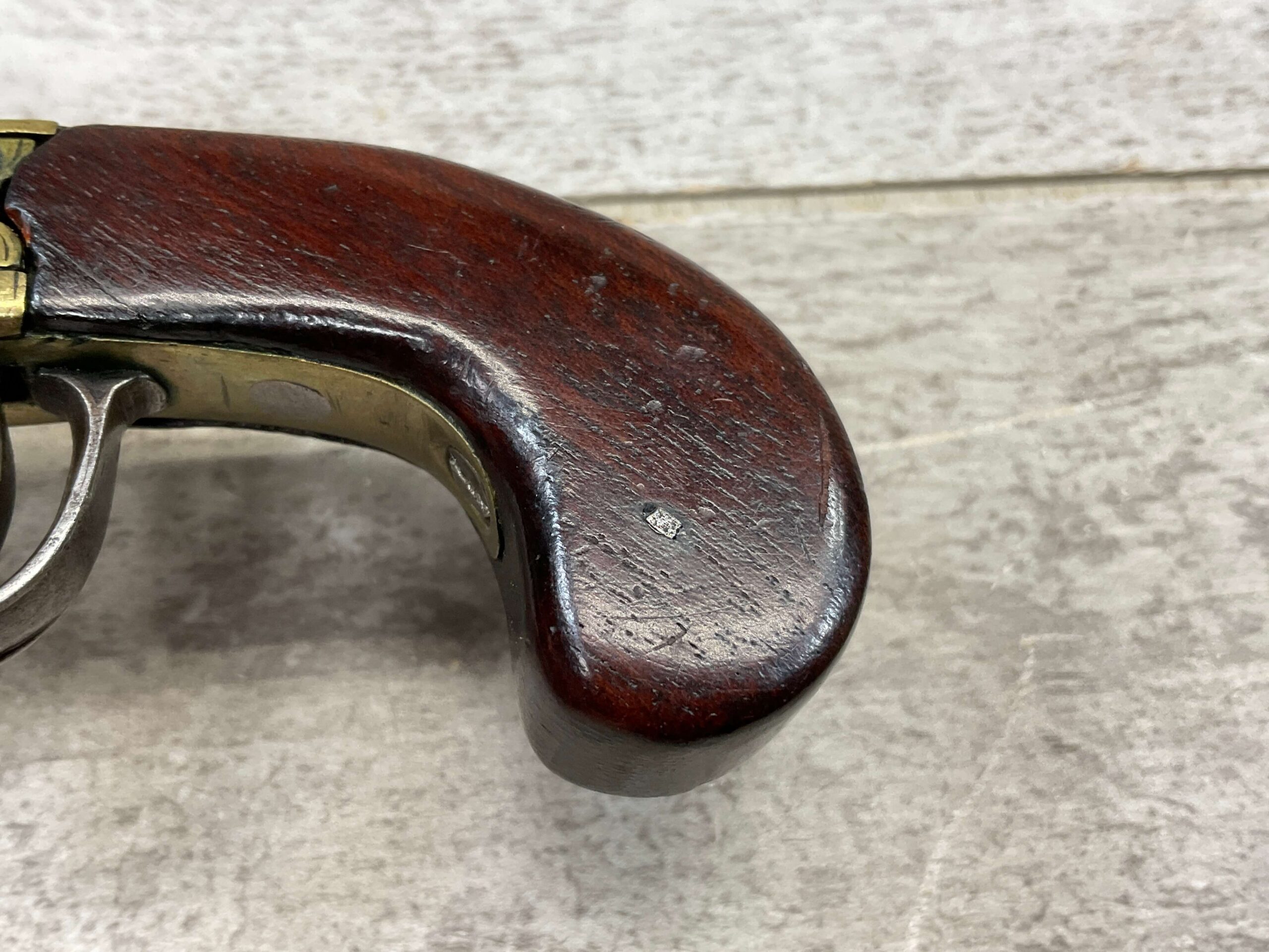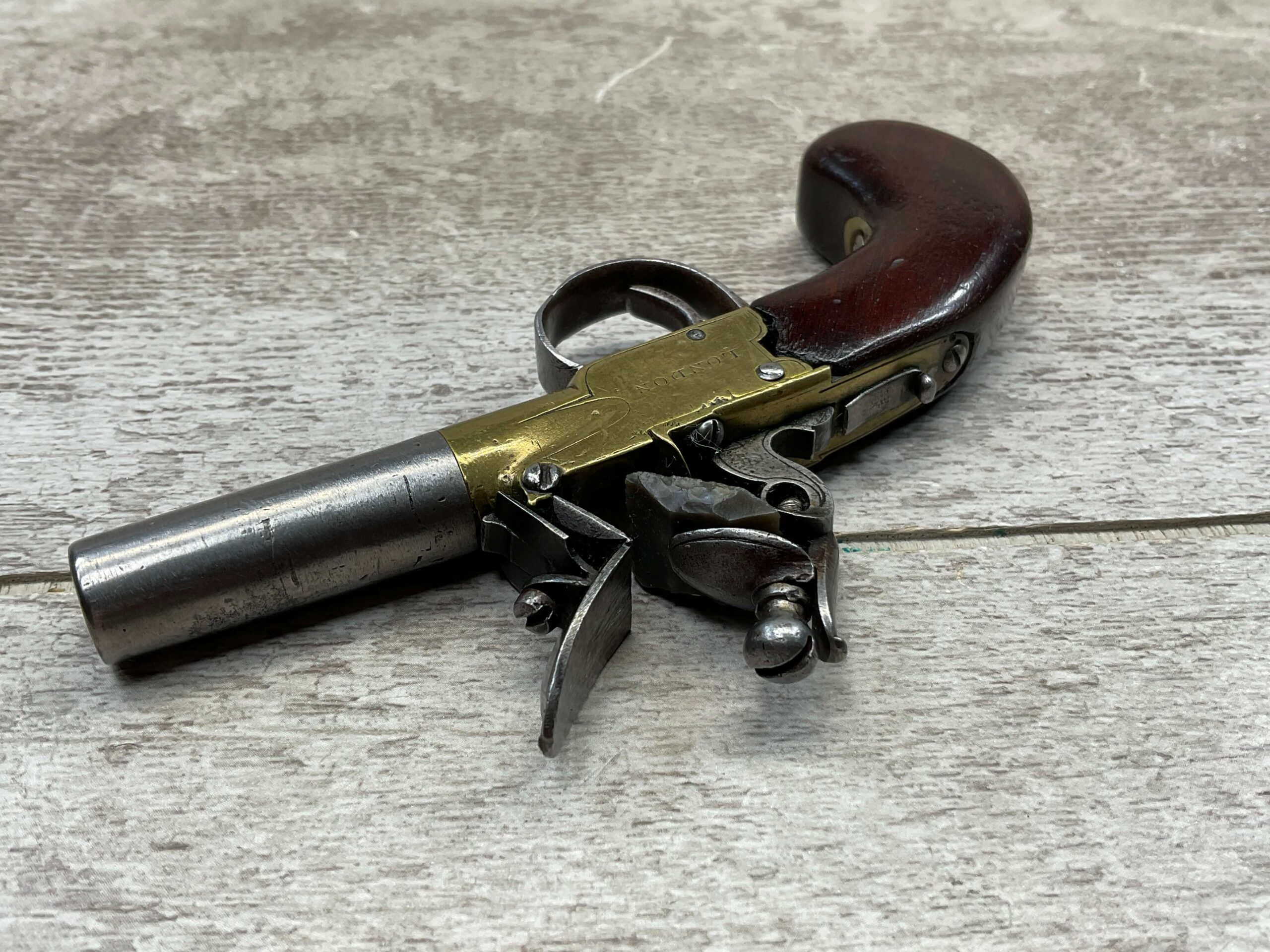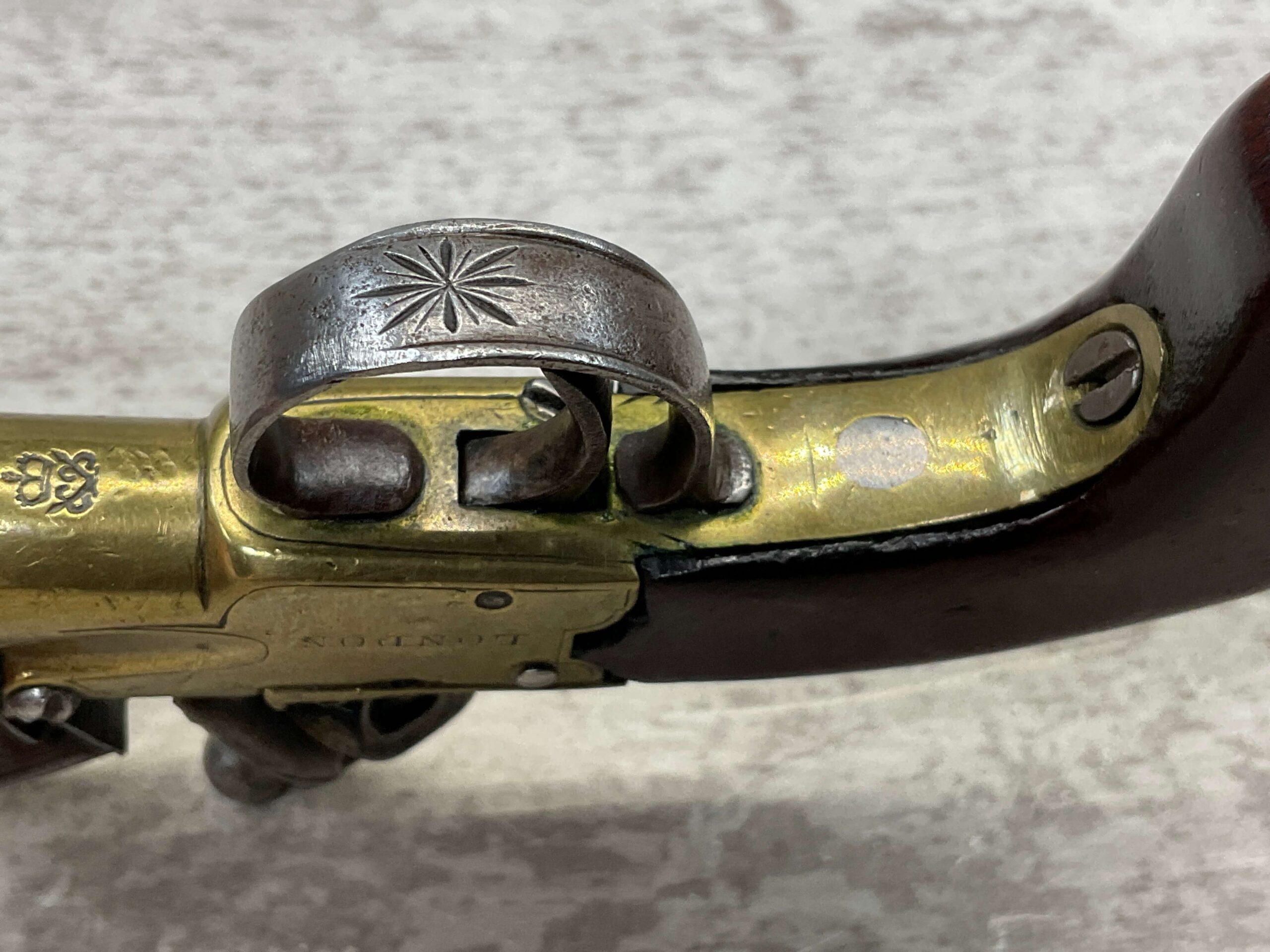 SMITH MUFF FLINTLOCK .32 CAL PISTOL, ANTIQUE #NSN, VG BRASS FRAME, ENGRAVED, “LONDON” PROOF ON RIGHT SIDE OF FRAME, “SMITH” MARKED ON LEFT SIDE OF FRAME, POOR BORE W/ FROSTING THROUGHOUT, NOT A REPRODUCTION, OVERALL CONDITION AS SEEN IN PHOTOS!!