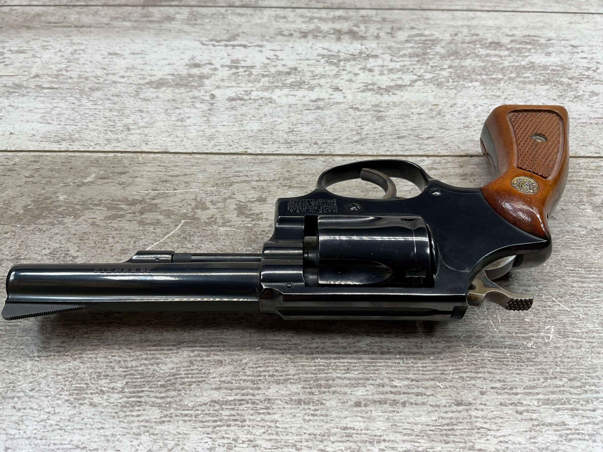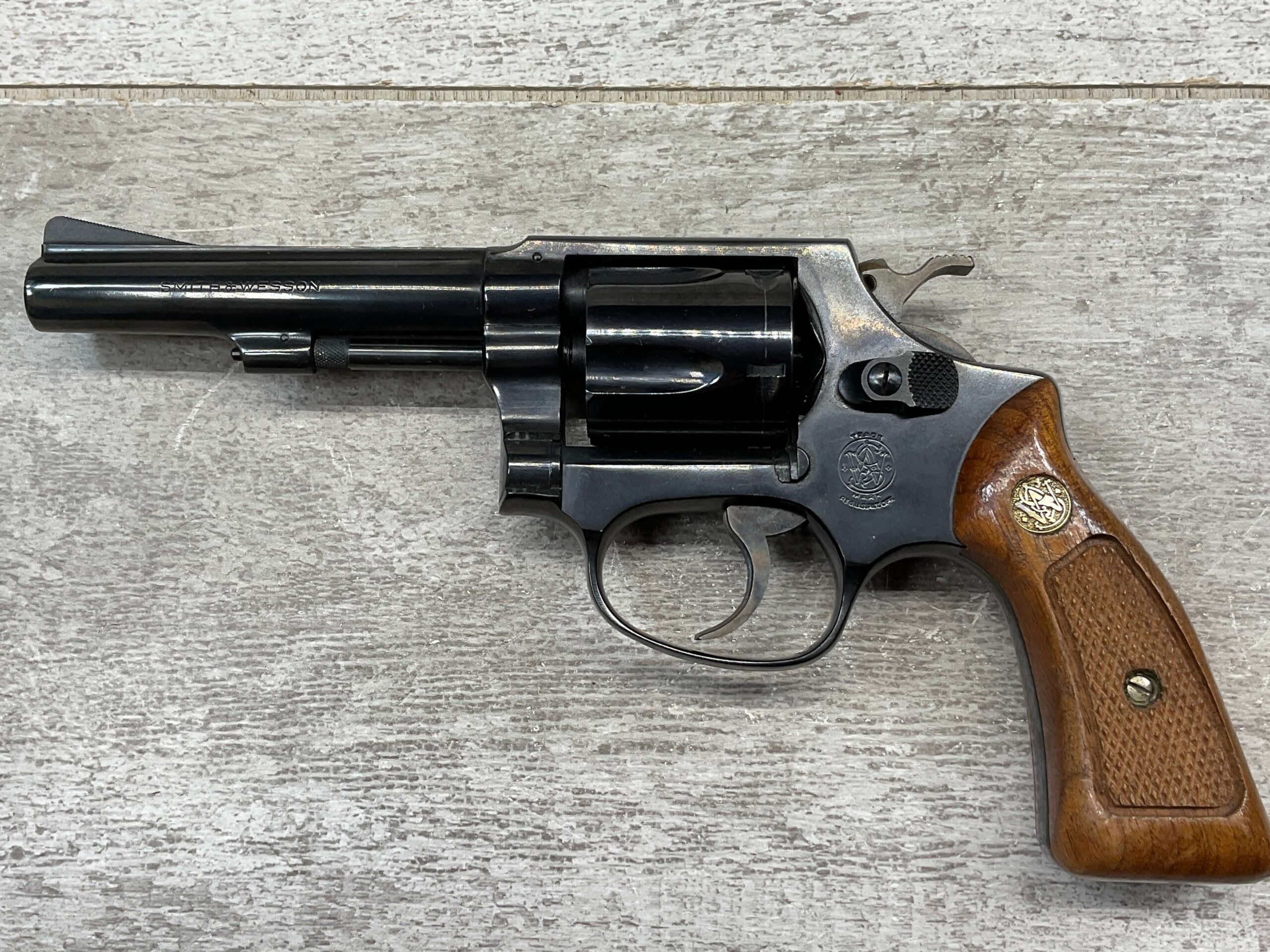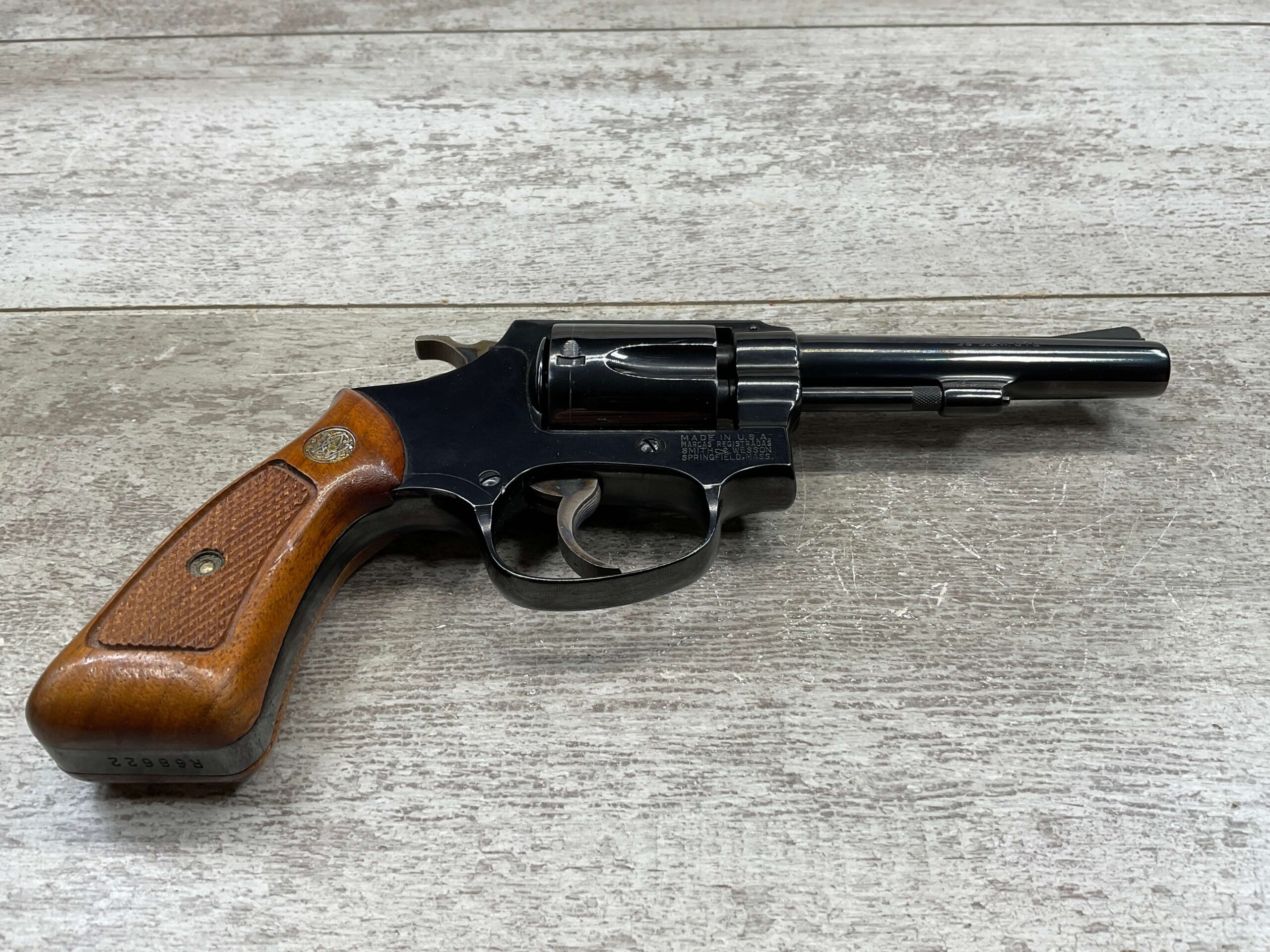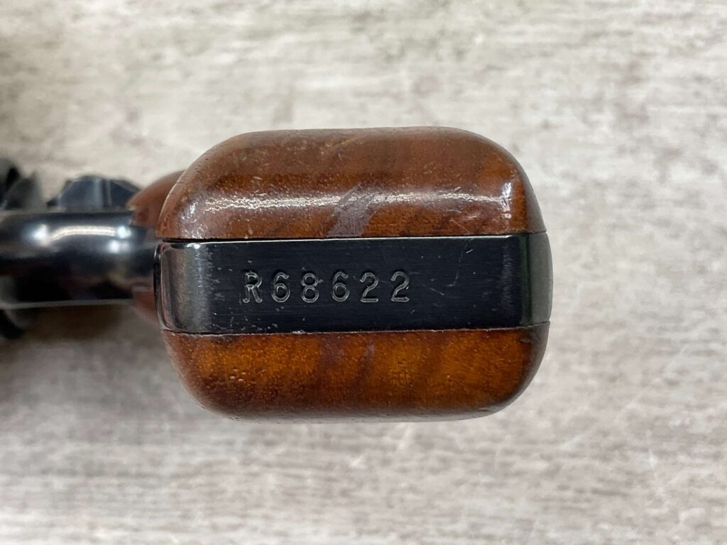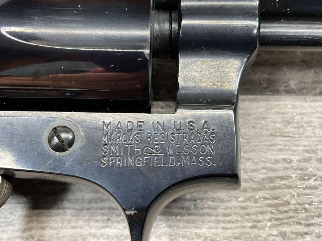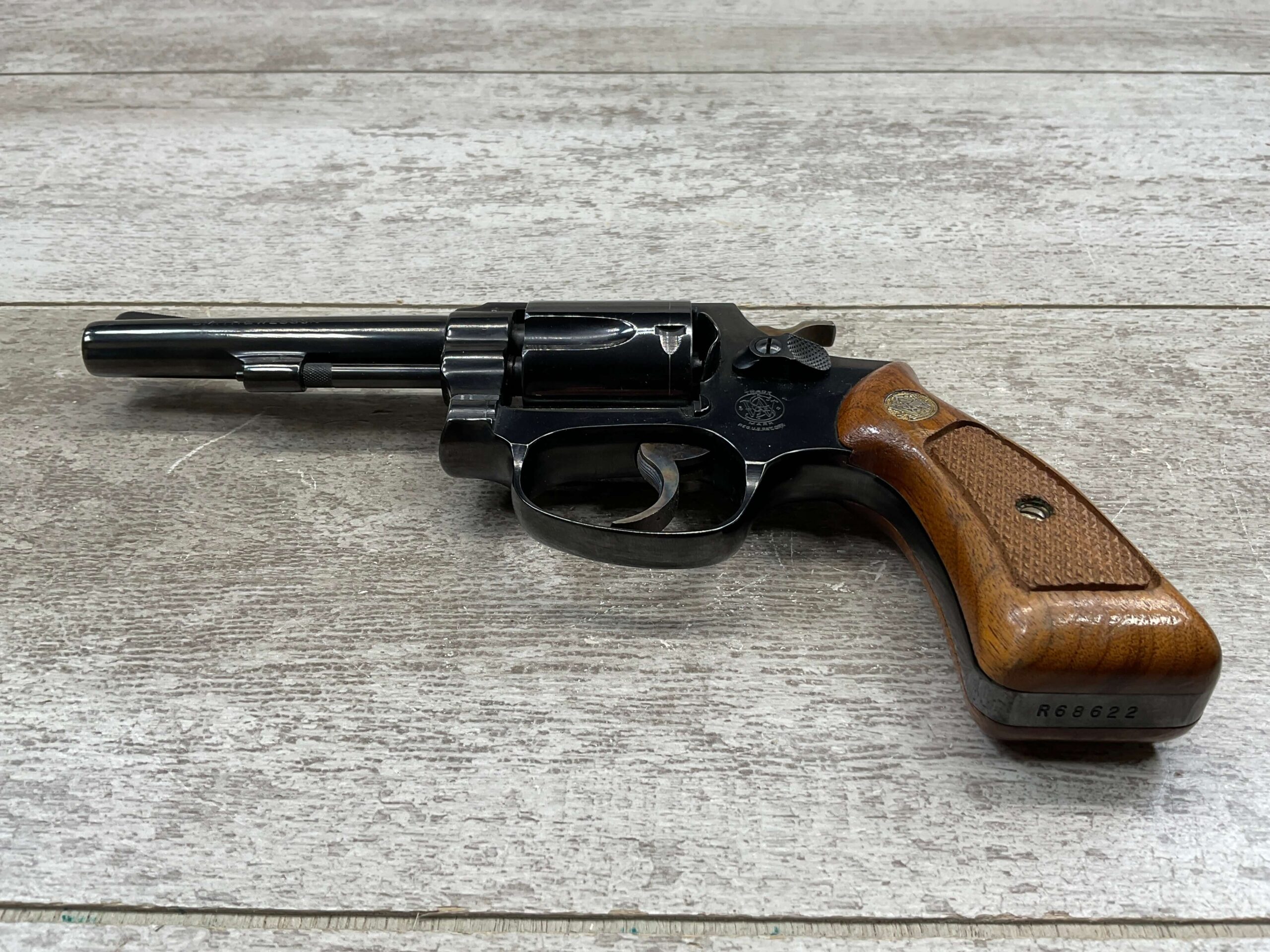 SMITH & WESSON 33-1, 38 S&W CTG REVOLVER, MINTY #R68622, EXC ORIGINAL BLUE FINISH W/ FAINT DRAGLINE ON CYLINDER, EXC CHECKERED WALNUT GRIPS, EXC BORE & RIFLNG (9.9/10), LEFT SIDE OF BBL MARKED “SMITH & WESSON”, RIGHT SIDE OF BBL MARKED “38 S&W CTG”, RIGHT SIDE OF FRAME IS MARKED “MADE IN U.S.A.”, LEFT SIDE OF FRAME IS MARKED W/ TRADEMARK CARTOUCHE, VERY NICE 98%+ LIKE NEW REVOLVER