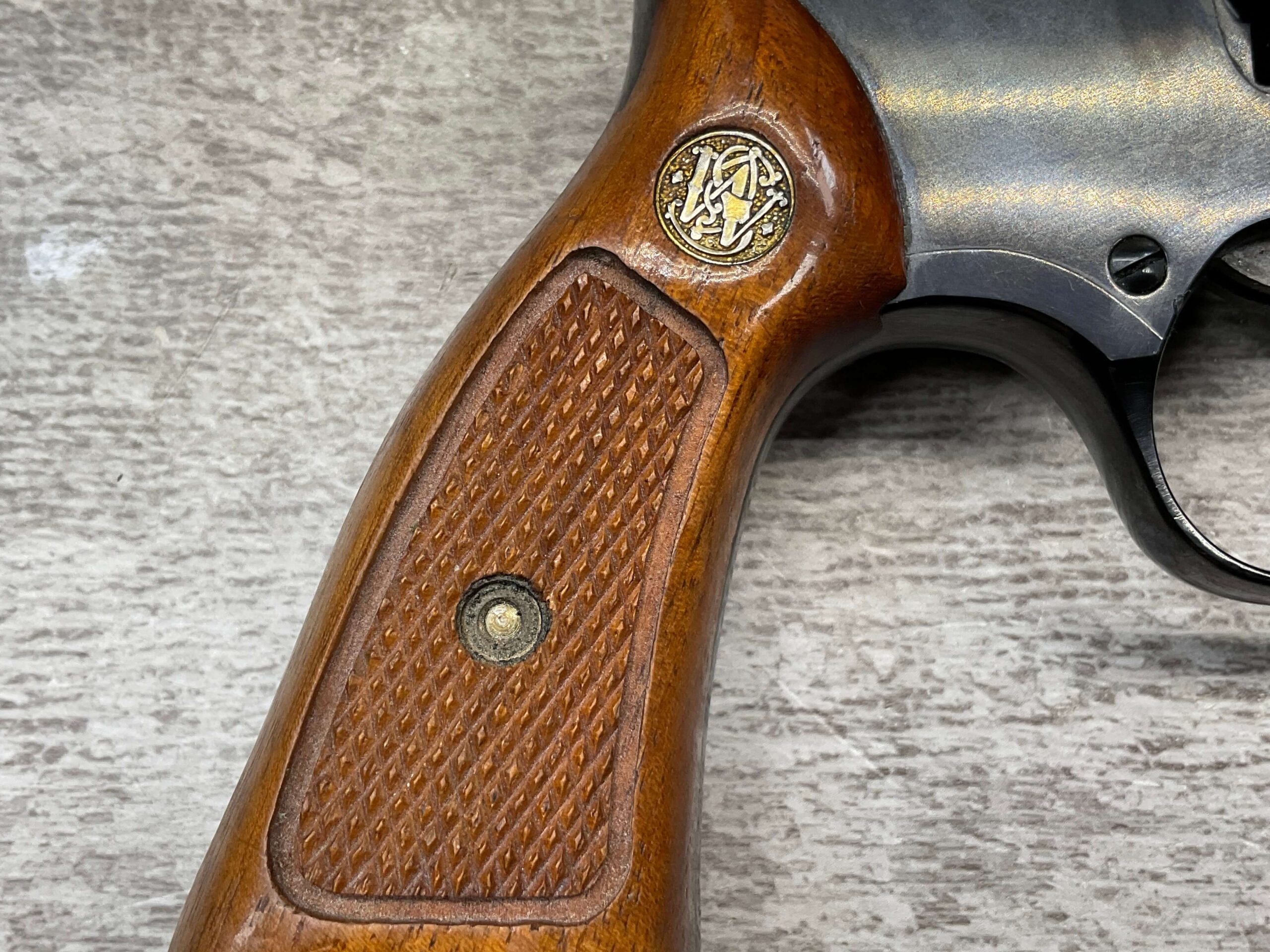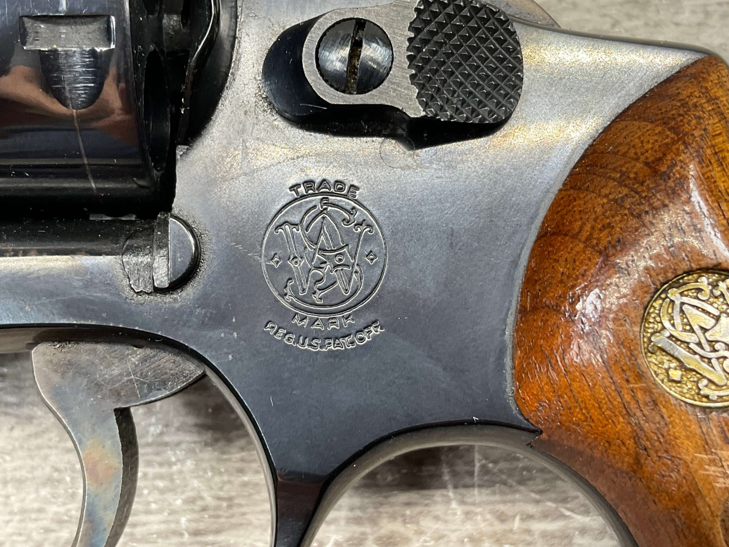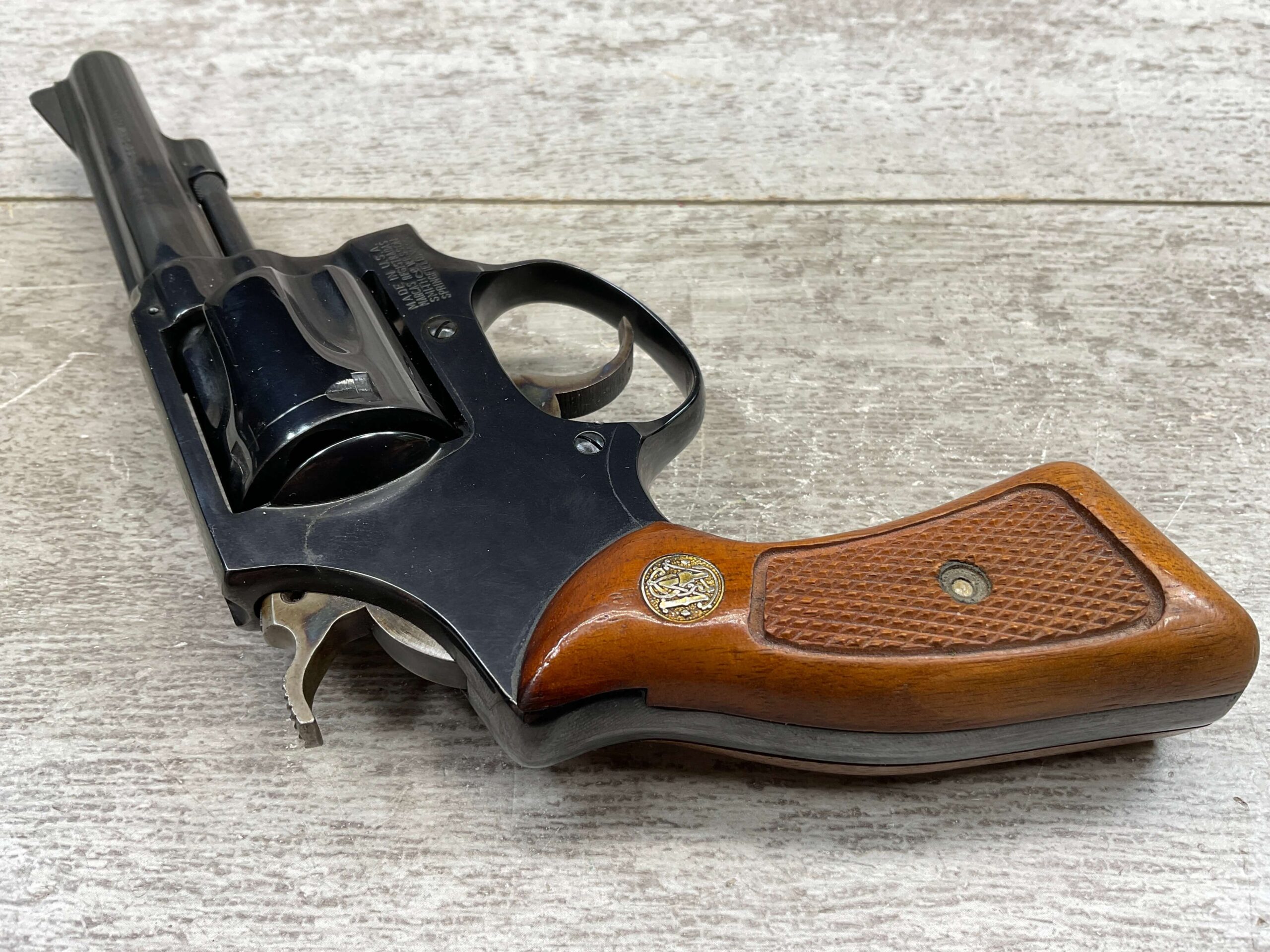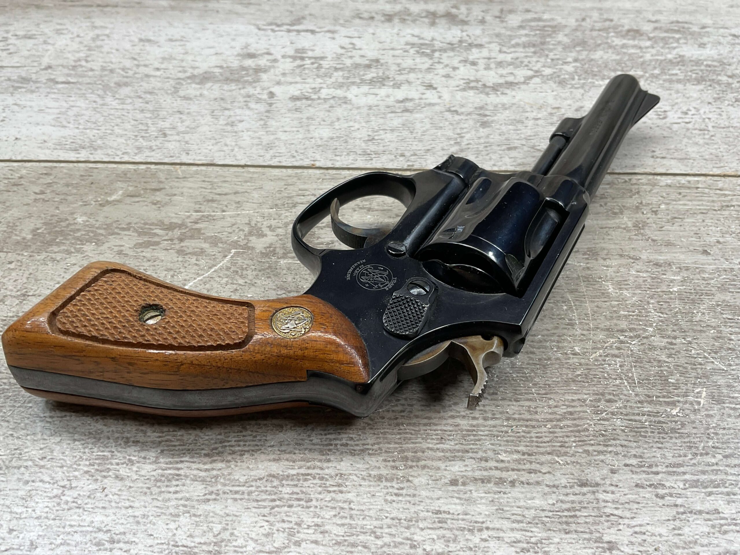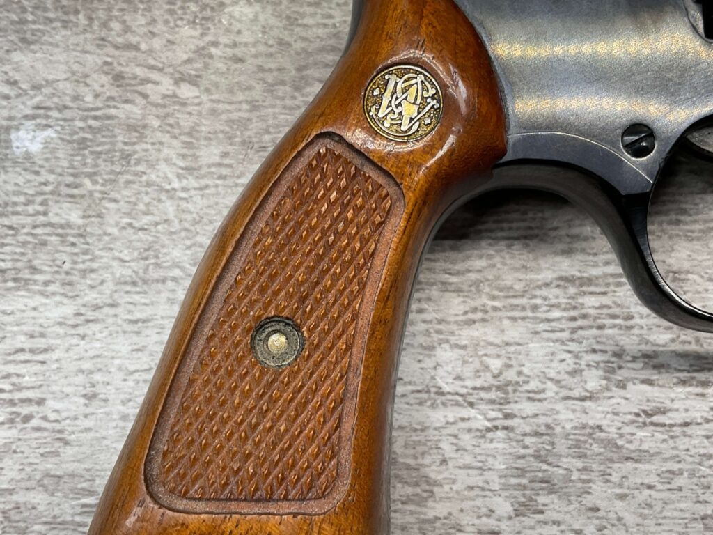 SMITH & WESSON 33-1, 38 S&W CTG REVOLVER, MINTY #R68622, EXC ORIGINAL BLUE FINISH W/ FAINT DRAGLINE ON CYLINDER, EXC CHECKERED WALNUT GRIPS, EXC BORE & RIFLNG (9.9/10), LEFT SIDE OF BBL MARKED “SMITH & WESSON”, RIGHT SIDE OF BBL MARKED “38 S&W CTG”, RIGHT SIDE OF FRAME IS MARKED “MADE IN U.S.A.”, LEFT SIDE OF FRAME IS MARKED W/ TRADEMARK CARTOUCHE, VERY NICE 98%+ LIKE NEW REVOLVER