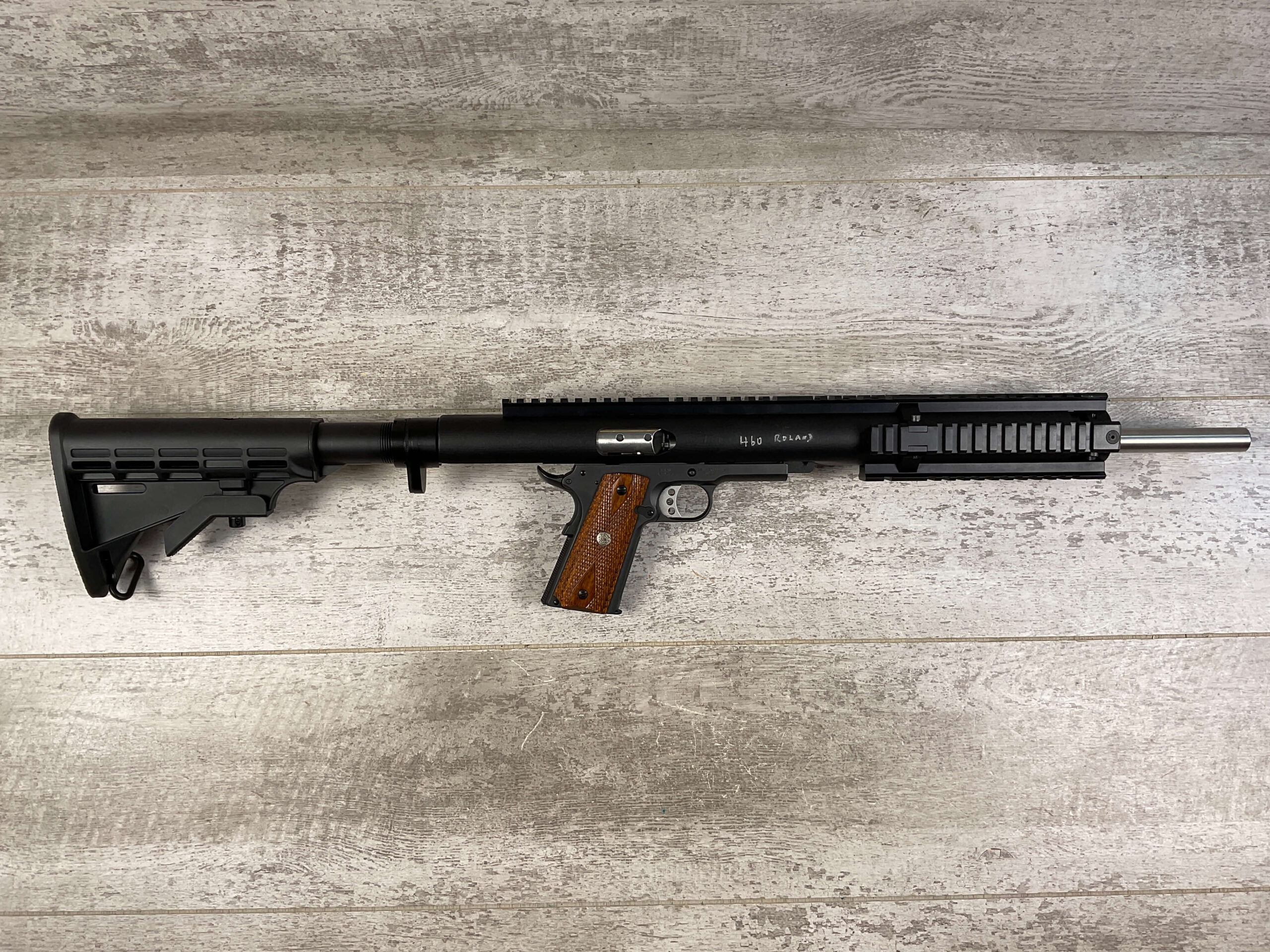 SMITH & WESSON S&W 1911 SEMI AUTO RIFLE/PISTOL IN .460 ROLAND, JAMES EARL JONES COLLECTION #JRF4379, EXC BORE & RIFLING, EXC LIKE NEW CONDITION,TACTICAL 1911 INSERTION STOCK W/ PICATINNY RAILS, CONDITION SHOWN IN PICTURES, FROM THE JAMES EARL JONES “FAVORITES” COLLECTION W/ CERTIFICATE OF AUTHENTICITY.